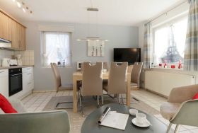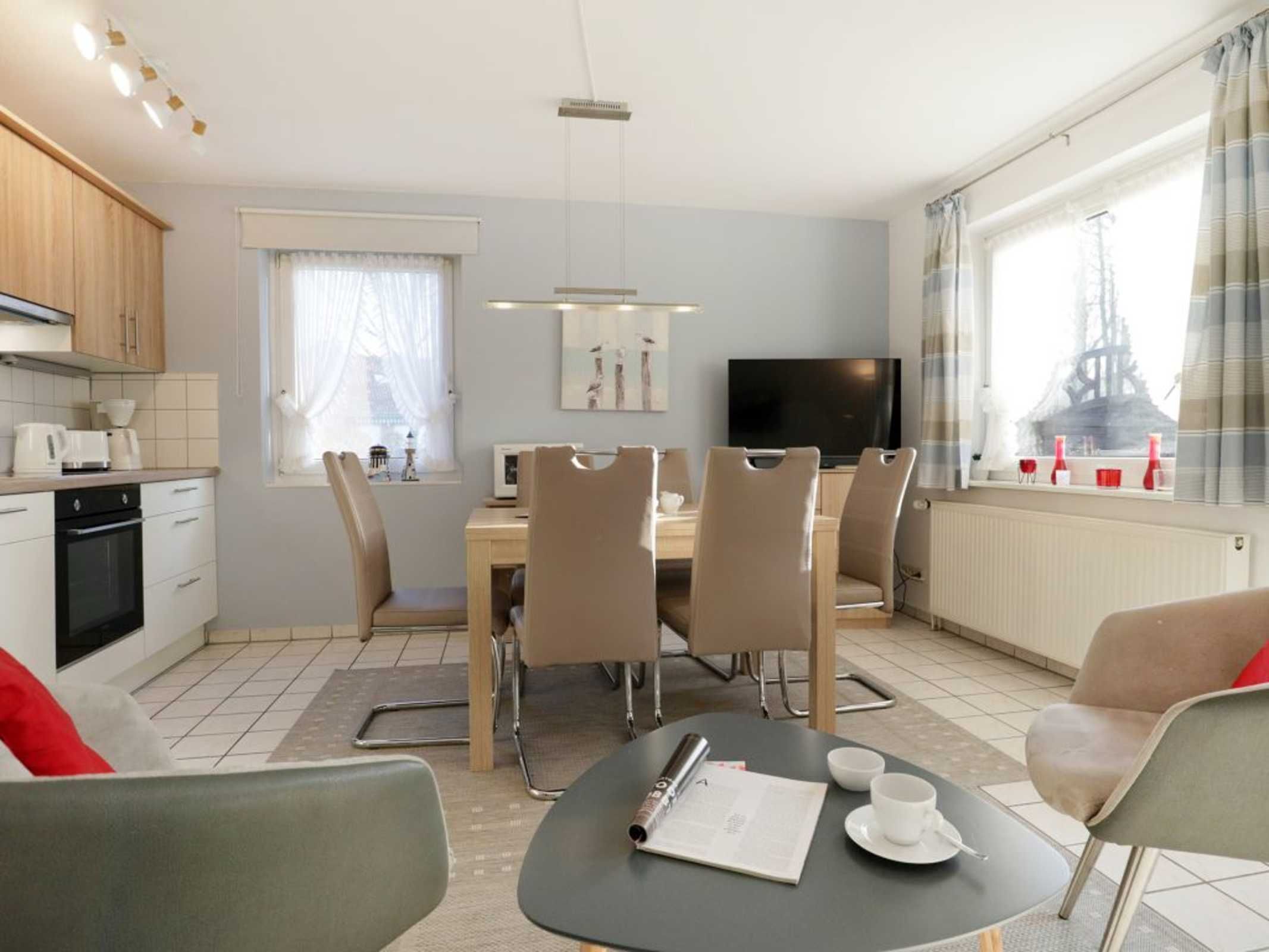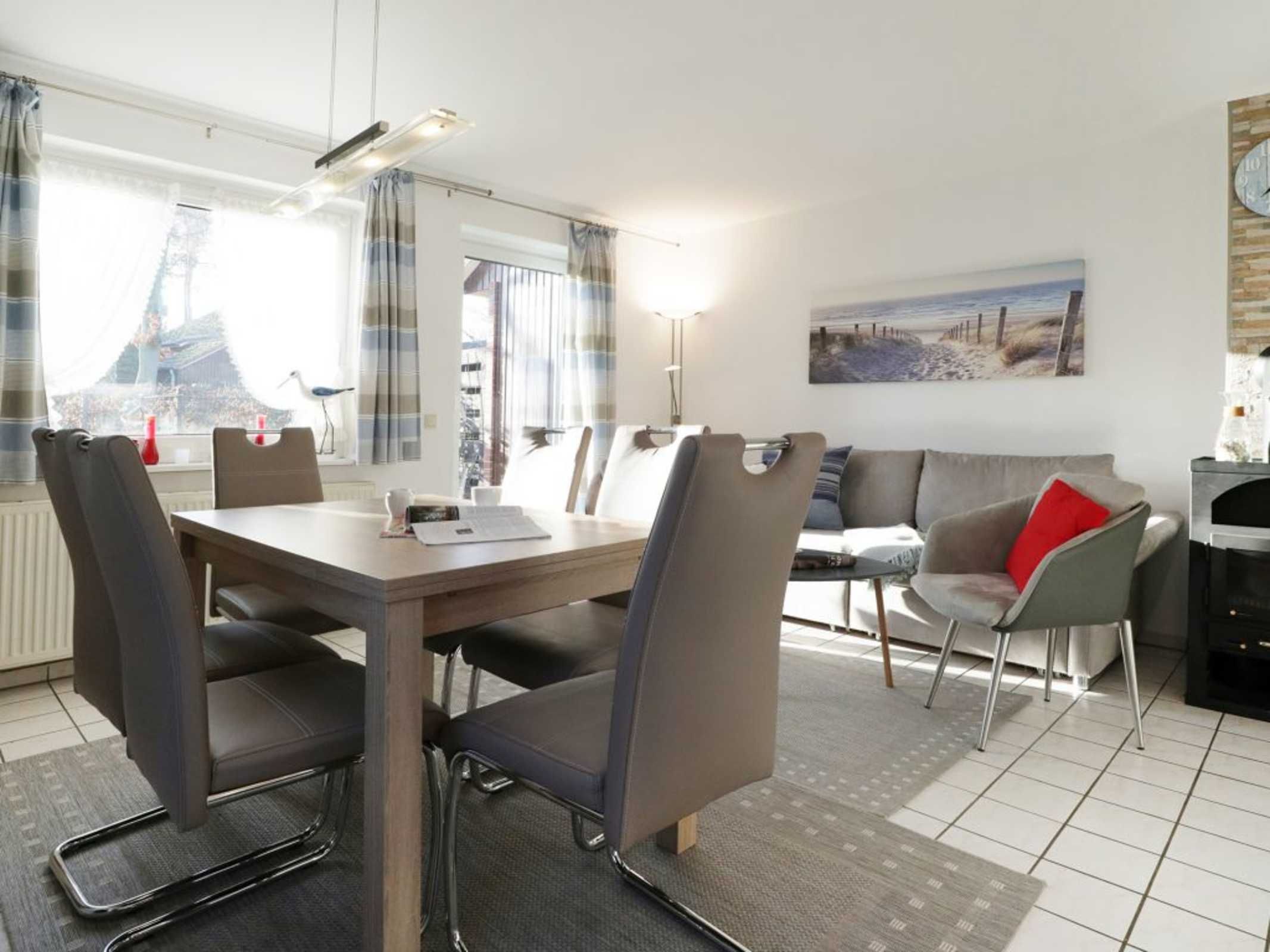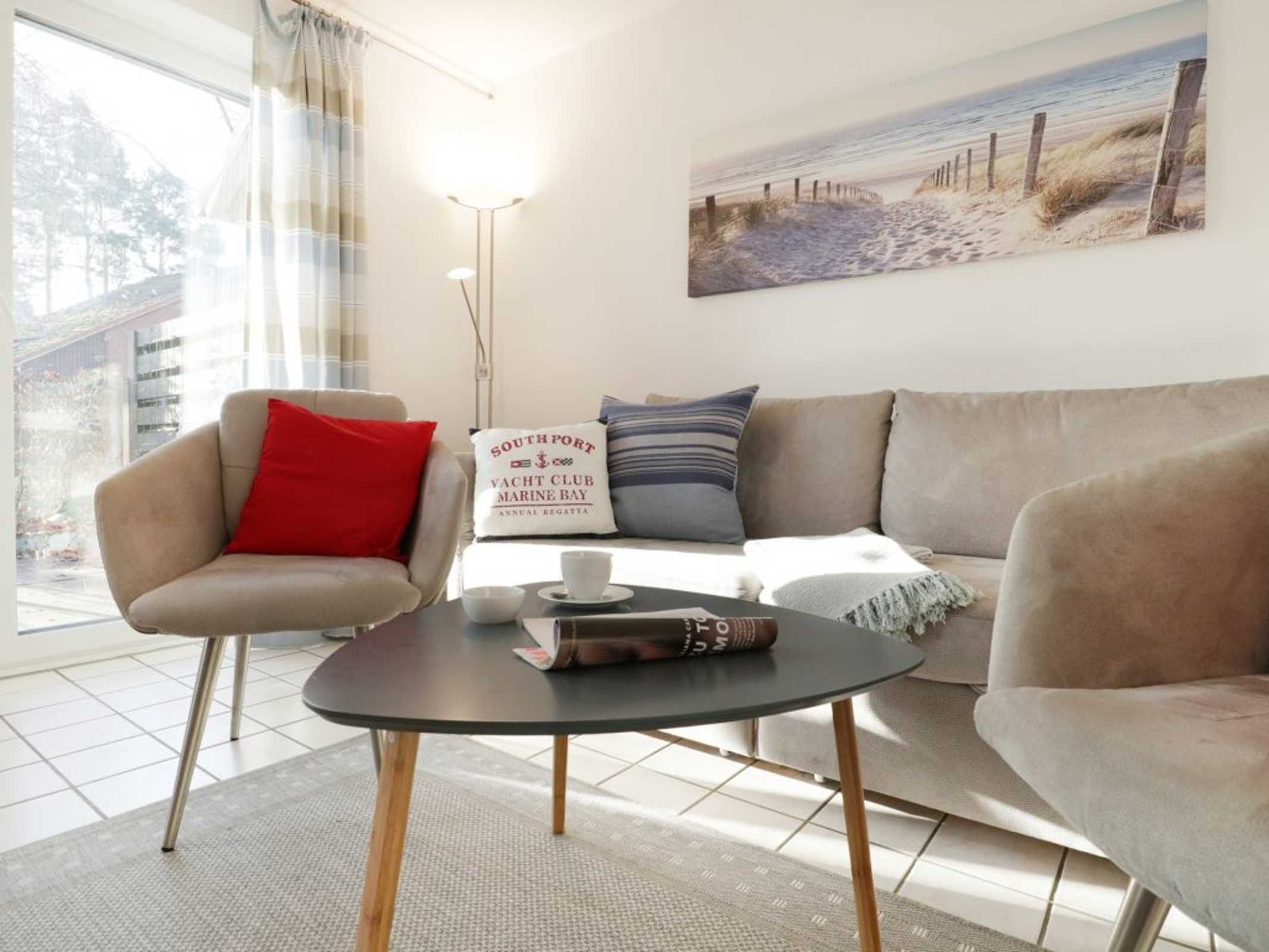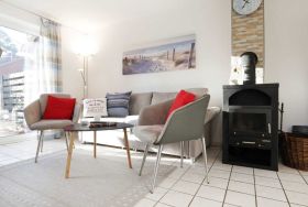 Das attraktive Reihenhaus im Urlauberdorf 47a ist ideal für Gäste, die mit ihrem Hund (gegen Gebühr) entspannte Ferien verbringen möchten. Insbesondere die nahe Lage, nur 350 Meter zum Badestrand mit Hundestrandabschnitt ist hervorzuheben. Zudem beginnen direkt am Haus schöne Spazierwege. Es empfängt Sie auf einer Wohnfläche von 55qm ein großzügiger Wohn-/Essbereich, einem bequemen Sofa, welches ausziehbar ist und somit zwei zusätzliche Schlafgelegenheiten ermöglicht. Flachbild Fernseher und Musikanlage sind selbstverständlich vorhanden. Gemeinsame Mahlzeiten, die Sie in der integrierten Küchenzeile zubereiten können, nehmen Sie an dem vorhandenen Esstisch ein.