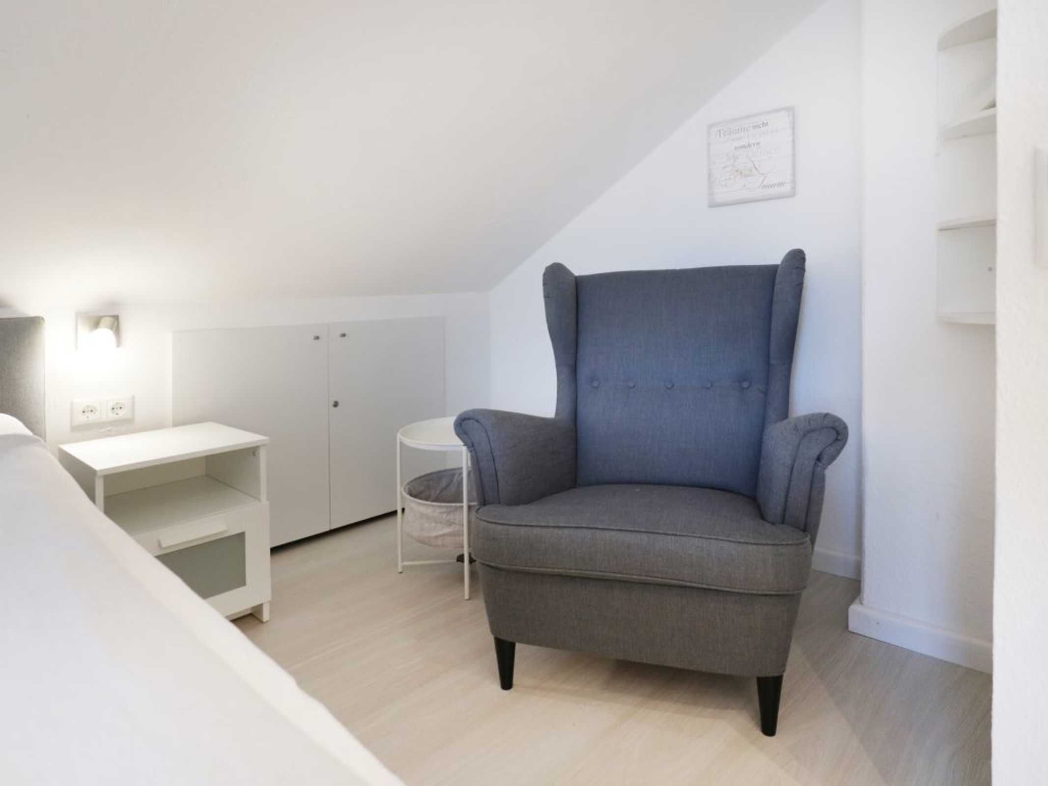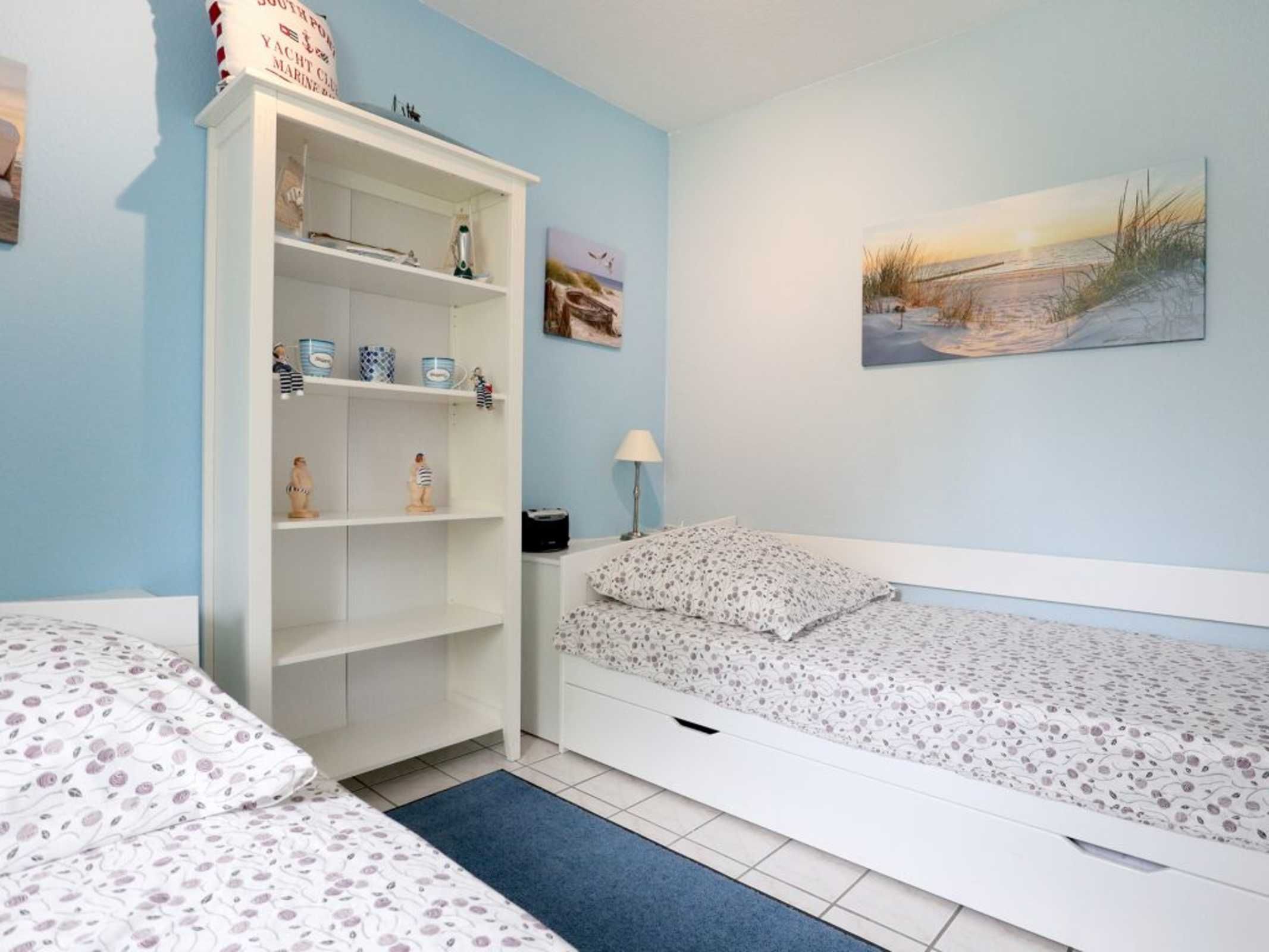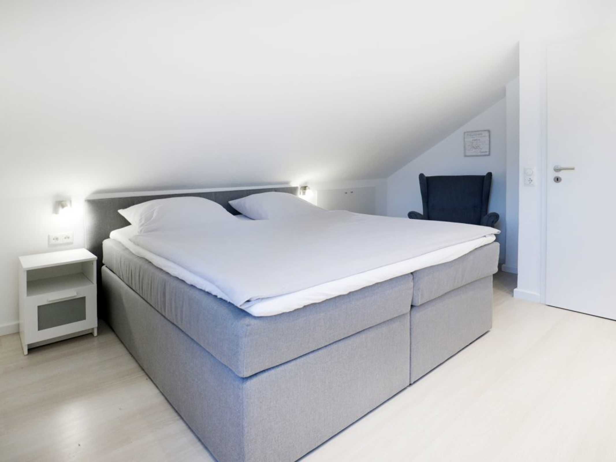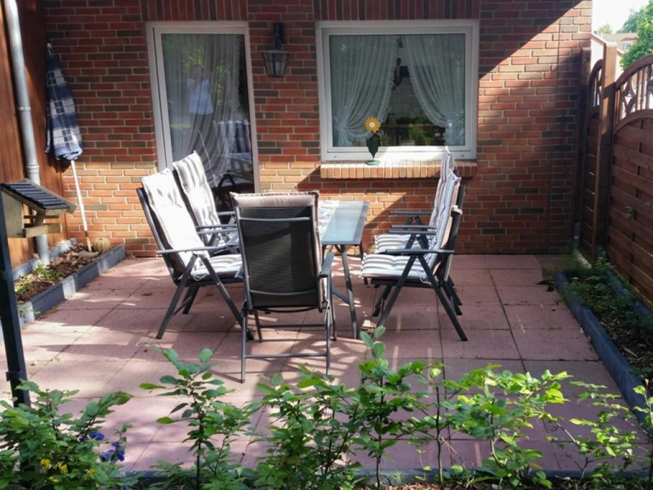 Zur Küchenausstattung gehören Herd mit Backofen, Mikrowelle, Geschirrspüler sowie Kaffeemaschine, Toaster, Wasserkocher u.v.m. Vom Wohnbereich aus gelangen sie auf die Terrasse, die während der Saison möbliert ist. Zudem befindet sich im Erdgeschoss ein separates Schlafzimmer mit zwei Einzelbetten und Kleiderschrank. Auch ein Tageslichtbad mit Dusche und Waschmaschinennutzung hier zu finden. Über eine Treppe gelangen Sie in das Obergeschoss, wo sich ein weiteres Schlafzimmer mit Doppelbett, Kinderbett und Kleiderschrank befindet.