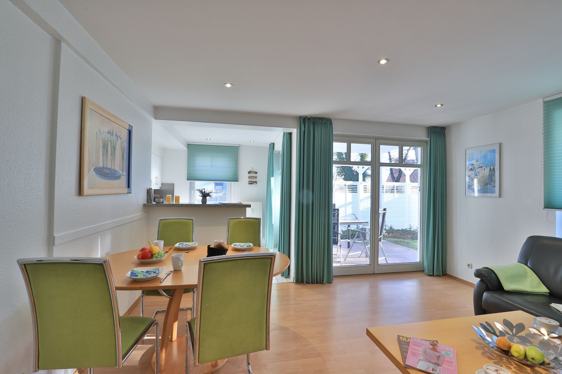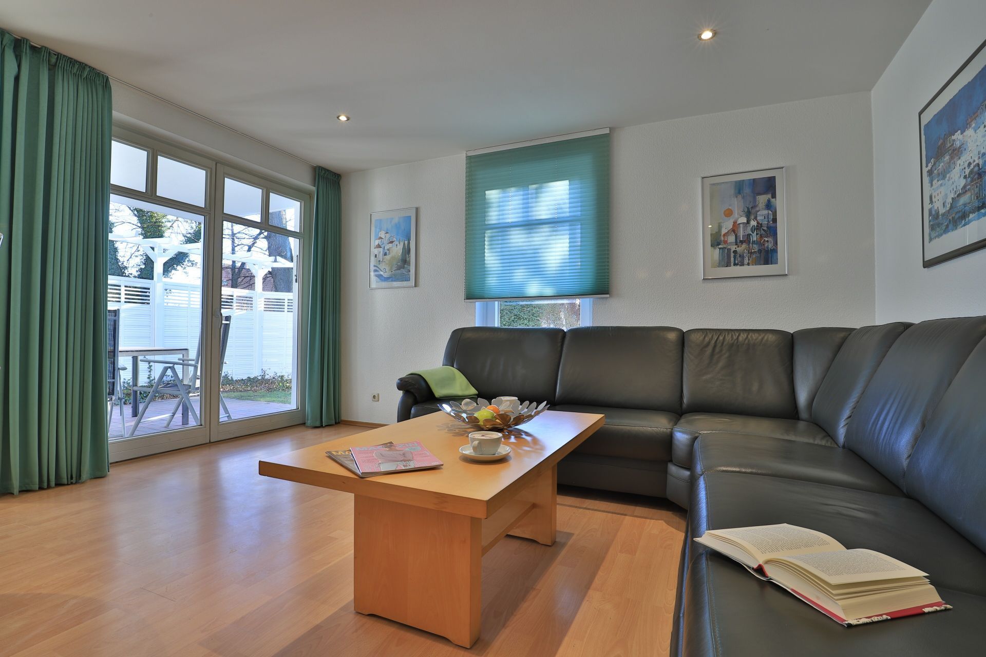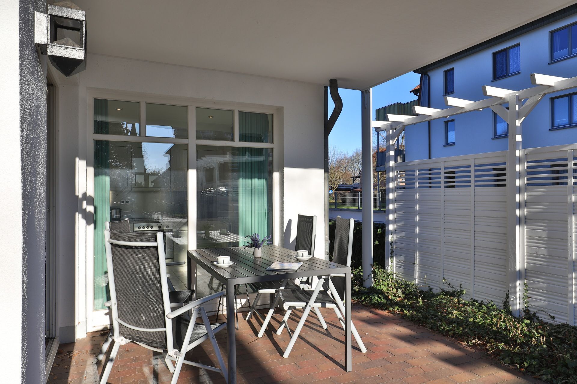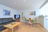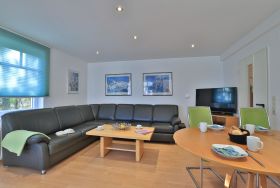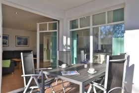 Das familienfreundliche 3-Zimmer-Erdgeschoss-Appartement bietet auf 72qm Platz für bis zu 6 Personen. Es verfügt über eine große Terrasse mit Gartennutzung und liegt in unmittelbarer Nähe zum Strand sowie zum Ortszentrum. Der Wohn-/Essbereich ist komfortabel möbliert und enthält ein großzügiges Ecksofa, das auch als Schlafsofa genutzt werden kann. Zur technischen Ausstattung gehören zwei Fernseher, eine Bose Soundanlage, ein DVD-Player, ein Radio und kostenloses WLAN. Die offene Wohnküche ist komplett ausgestattet mit Ceranfeldherd, Backofen, Mikrowelle, Kühlschrank mit Gefrierfach, Geschirrspüler, Kaffeemaschine, Wasserkocher und Toaster. Für gemeinsame Mahlzeiten steht ein Esstisch bereit. Die saisonal möblierte Terrasse ist überdacht. Es gibt zwei Schlafzimmer, eines mit Doppelbett und Kinderbett sowie das weitere mit Doppelbett und Fernseher. Für die kleinen Gäste sind ein Kinderhochstuhl und ein Kinderbett vorhanden. Außerdem stehen zwei modernisierte Duschbäder zur Verfügung. Bügeleisen, Bügelbrett, Fön befinden sich in der Wohnung. Ihr Auto parken Sie bequem auf einem reservierten Stellplatz in der Tiefgarage. Hunde sind gegen Gebühr herzlich willkommen. Beachten Sie bitte, dass in der Hauptsaison und über den Jahreswechsel eine Mindestmietdauer von einer Woche gilt.
