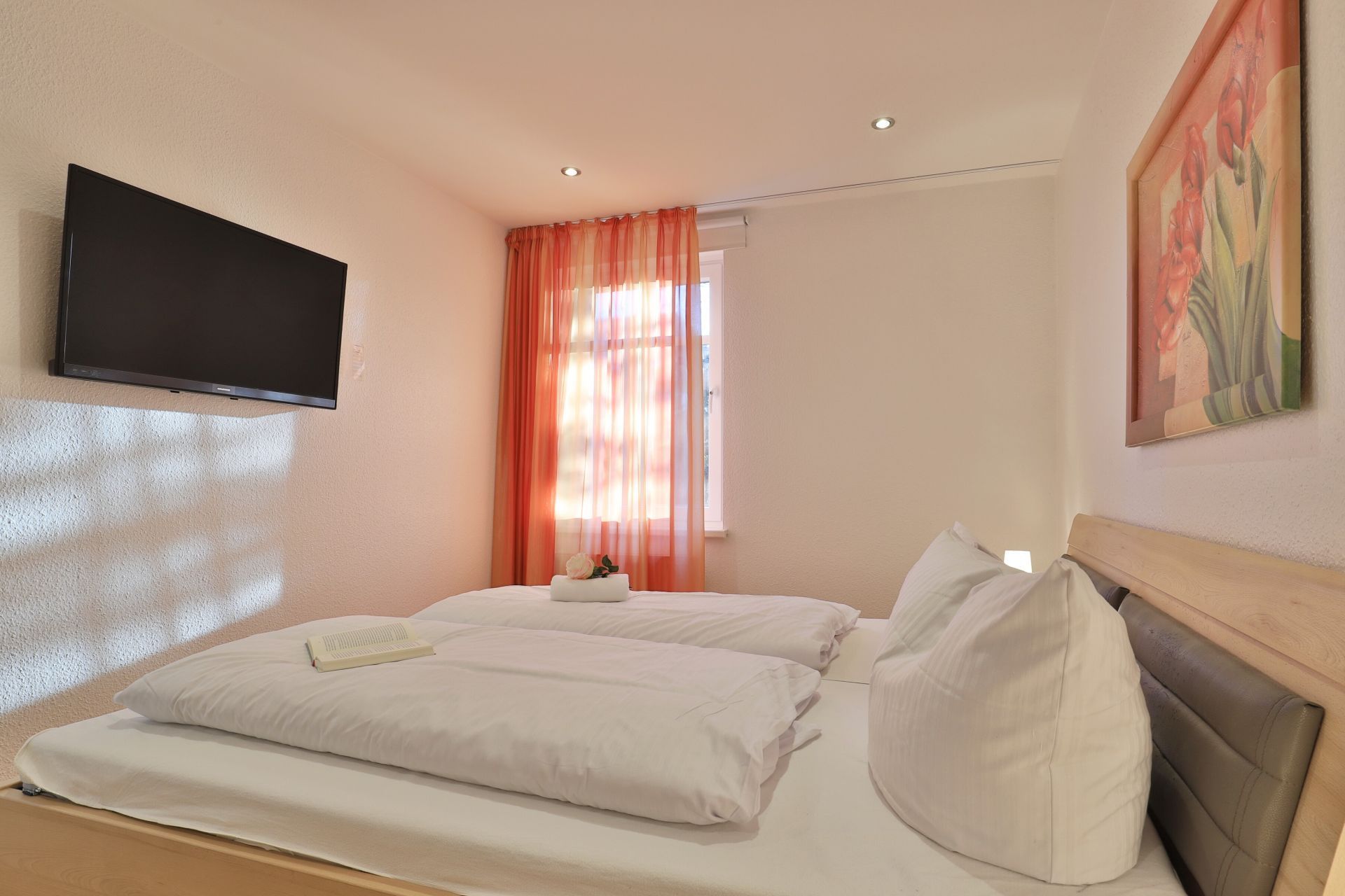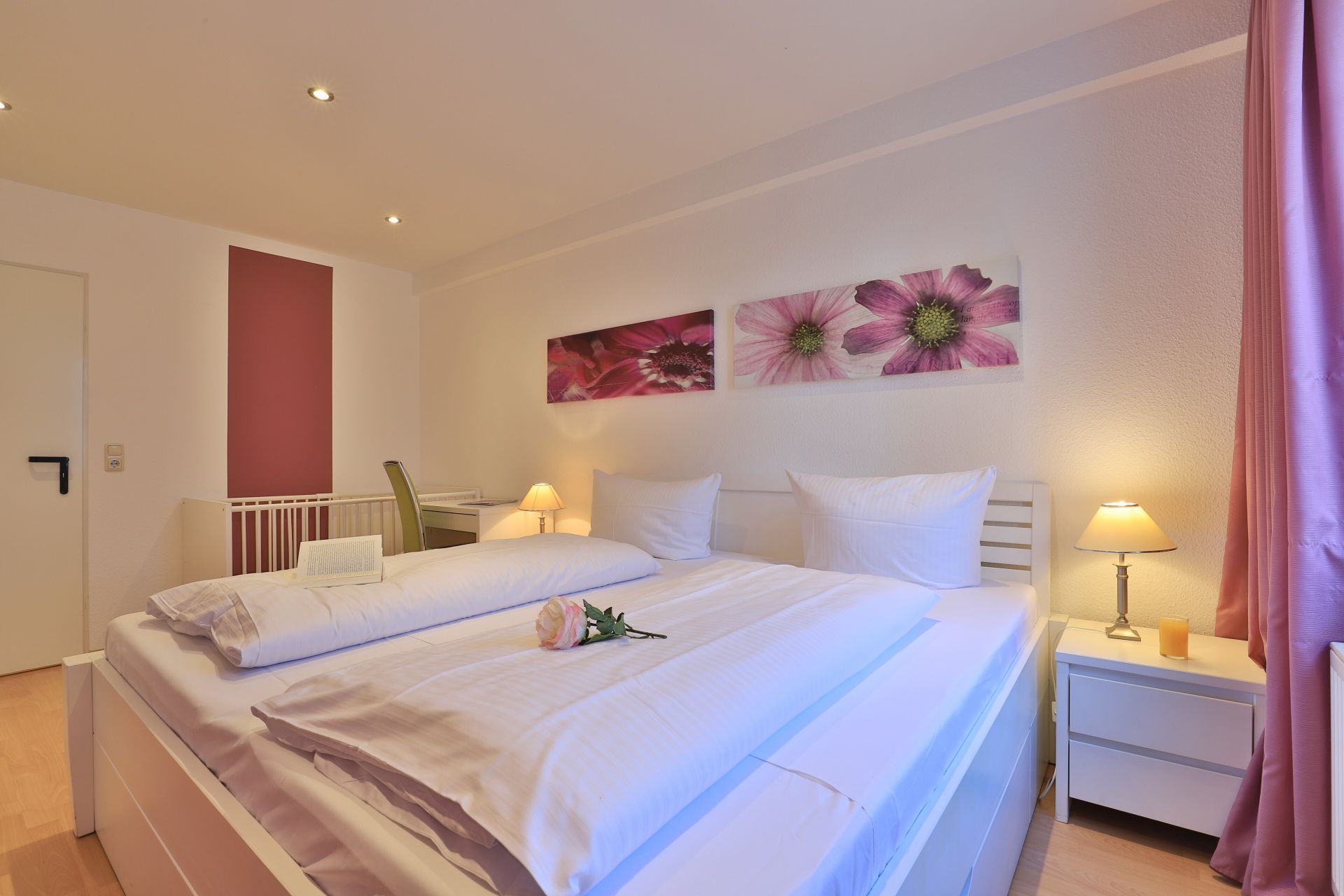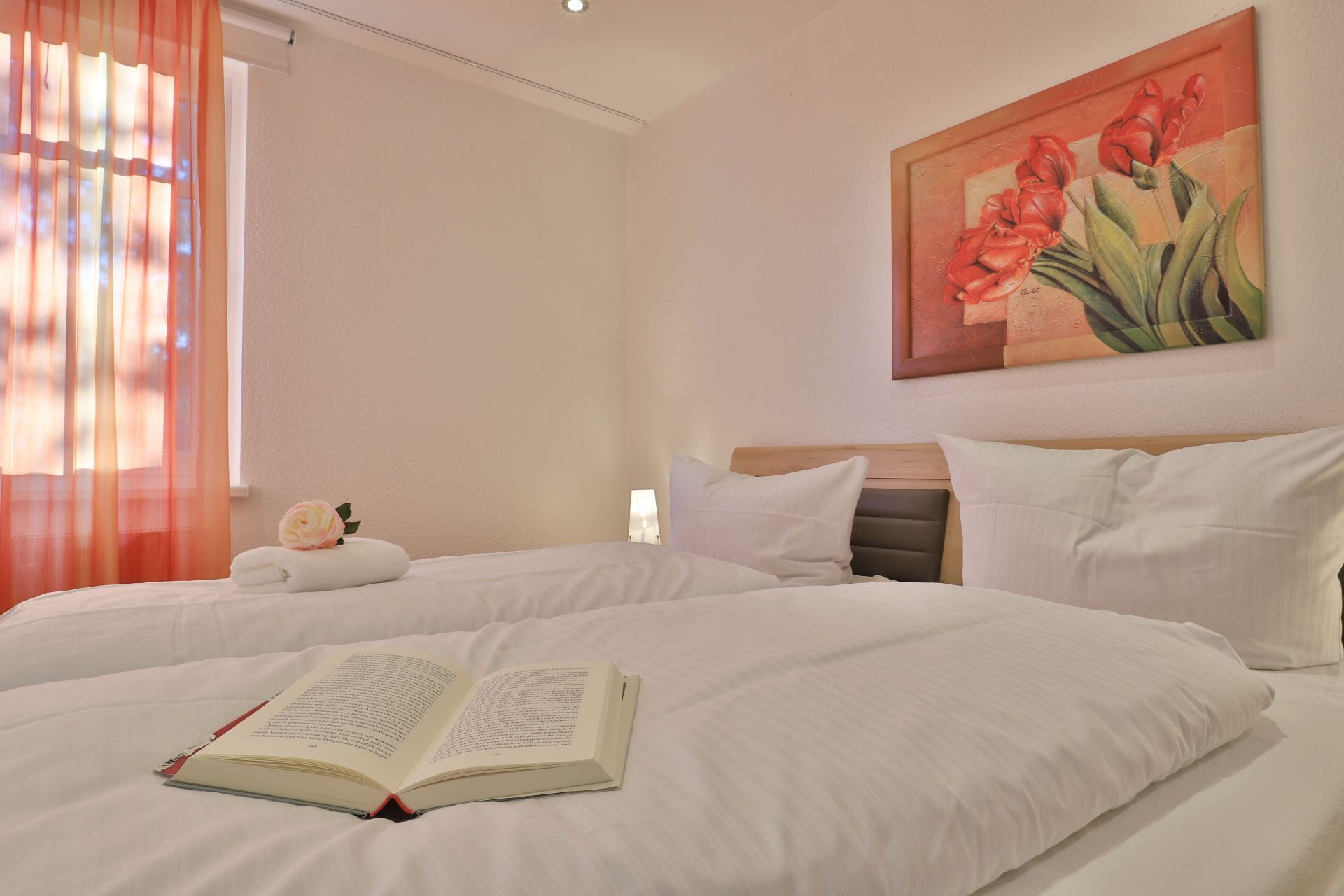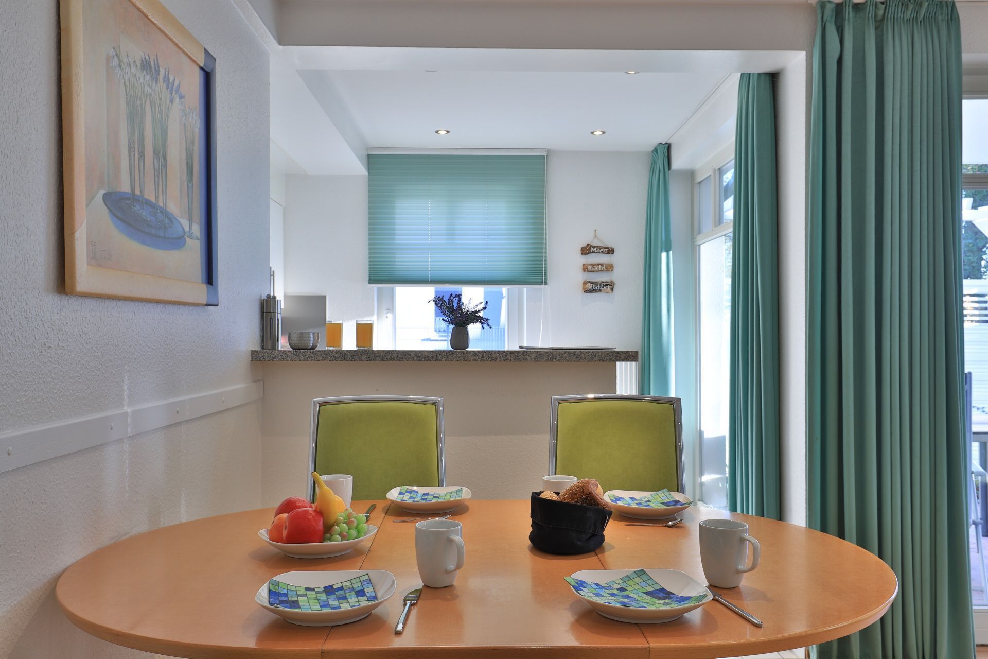 Das familienfreundliche 3-Zimmer-Erdgeschoss-Appartement bietet auf 72qm Platz für bis zu 6 Personen. Es verfügt über eine große Terrasse mit Gartennutzung und liegt in unmittelbarer Nähe zum Strand sowie zum Ortszentrum. Der Wohn-/Essbereich ist komfortabel möbliert und enthält ein großzügiges Ecksofa, das auch als Schlafsofa genutzt werden kann. Zur technischen Ausstattung gehören zwei Fernseher, eine Bose Soundanlage, ein DVD-Player, ein Radio und kostenloses WLAN. Die offene Wohnküche ist komplett ausgestattet mit Ceranfeldherd, Backofen, Mikrowelle, Kühlschrank mit Gefrierfach, Geschirrspüler, Kaffeemaschine, Wasserkocher und Toaster. Für gemeinsame Mahlzeiten steht ein Esstisch bereit. Die saisonal möblierte Terrasse ist überdacht. Es gibt zwei Schlafzimmer, eines mit Doppelbett und Kinderbett sowie das weitere mit Doppelbett und Fernseher. Für die kleinen Gäste sind ein Kinderhochstuhl und ein Kinderbett vorhanden. Außerdem stehen zwei modernisierte Duschbäder zur Verfügung. Bügeleisen, Bügelbrett, Fön befinden sich in der Wohnung. Ihr Auto parken Sie bequem auf einem reservierten Stellplatz in der Tiefgarage. Hunde sind gegen Gebühr herzlich willkommen. Beachten Sie bitte, dass in der Hauptsaison und über den Jahreswechsel eine Mindestmietdauer von einer Woche gilt.