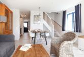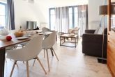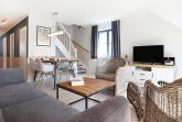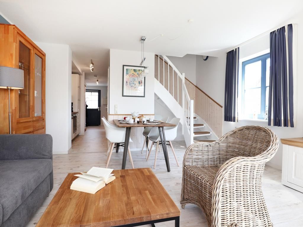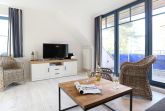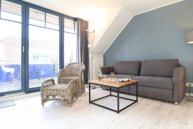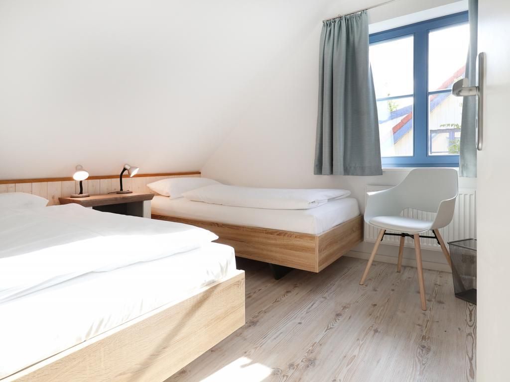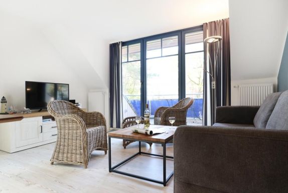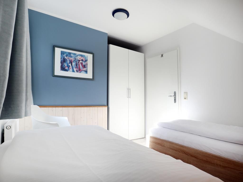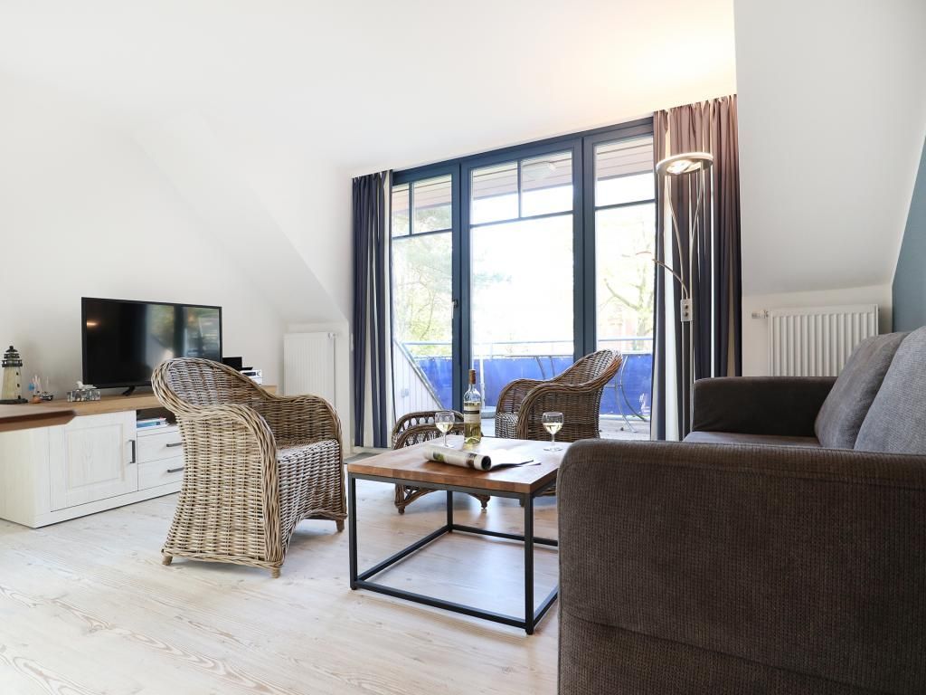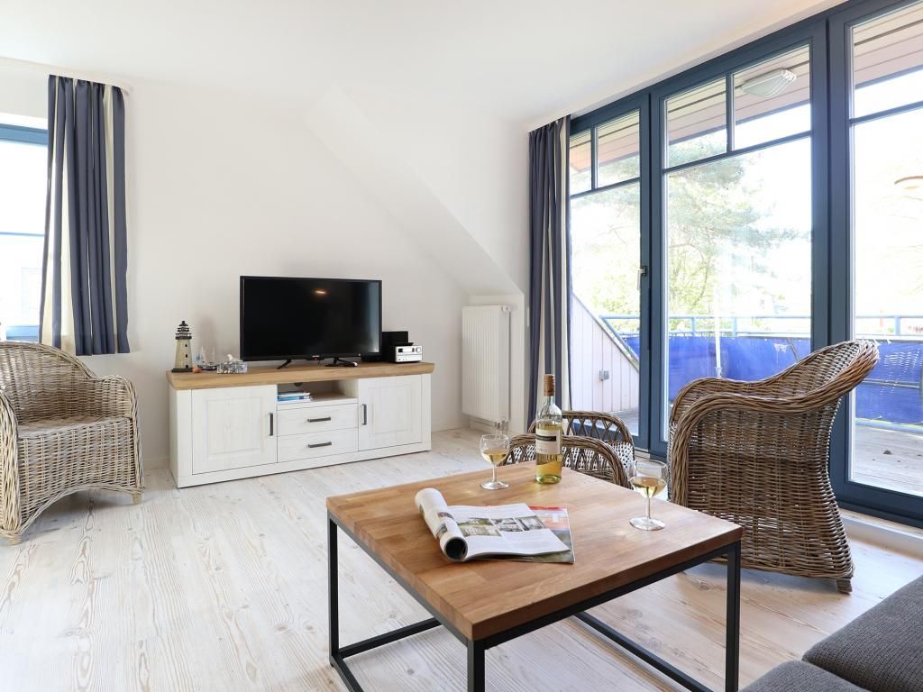 Die 4- Zimmer Maisonetten Ferienwohnung Papillon 12-5 ist ein komfortabel eingerichtetes Appartement mit einer Wohnfläche von 65qm. Eine Belegung kann mit bis zu 8 Personen erfolgen. Wir empfehlen eine max. Belegung mit bis zu 6 Gästen. Der großzügige Wohn-/Essbereich ist mit einem Sofa, ausziehbar als Schlafsofa mit zwei weiteren Schlafgelegenheiten sowie weiteren Sitzmöglichkeiten und einem großen Esstisch möbliert. Ein Fernsehgerät, DVD-Player, Musikanlage und kostenfreie WLAN- Nutzung bieten Abwechslung. Vom Wohnbereich gelangt man auf den saisonal möblierten Süd-Balkon. In der Wohnküche stehen Ceranherd, Backofen, Mikrowelle, Geschirrspüler sowie Kühlschrank mit integr. Gefrierfach, Kaffeemaschine, Toaster und Wasserkocher bereit. Ihre Mahlzeiten können Sie am Esstisch zu sich nehmen. Zudem befindet sich auf dieser Wohnebene ein separates Schlafzimmer mit zwei Einzelbetten, und Kleiderschrank. Das Duschbad ist mit zwei Waschtischen und WC ausgestattet. Über eine Treppe im Wohnbereich gelangen Sie in die obere Ebene mit zwei weiteren Schlafzimmern, welche jeweils mit einem Doppelbett, Kleiderschrank möbliert sind. Gegen Gebühr können Sie im Untergeschoß des Hauses Waschmaschine und Wäschetrockner nutzen. Ein Kinderhochstuhl befindet sich in der Wohnung. Ihren PKW parken Sie kostenfrei auf dem wohnungseigenen Außenstellplatz. Bitte beachten Sie, dass es sich um eine Nichtraucherwohnung handelt. Haustiere sind herzlich willkommen. Zur Ostsee gelangen Sie in nur ca. 250 Meter.