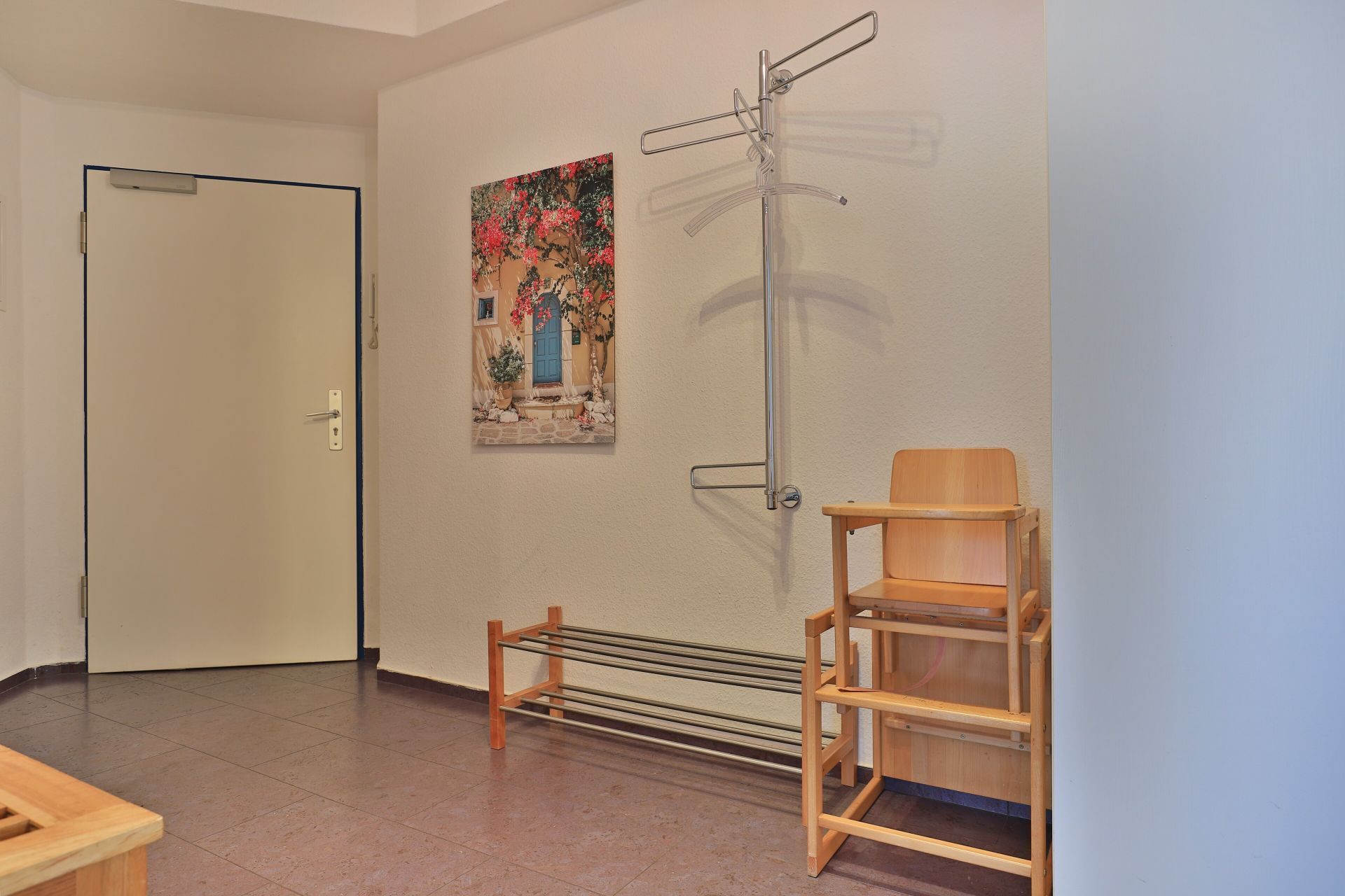Ein Kinderbett und Kinderhochstuhl befinden sich in dem Ferienappartement.
