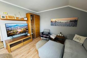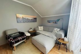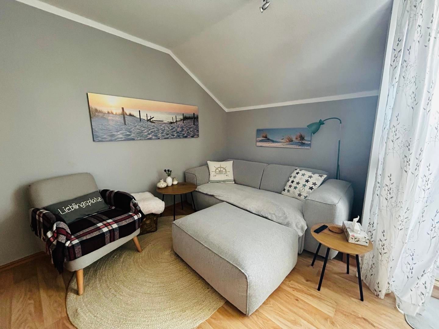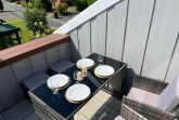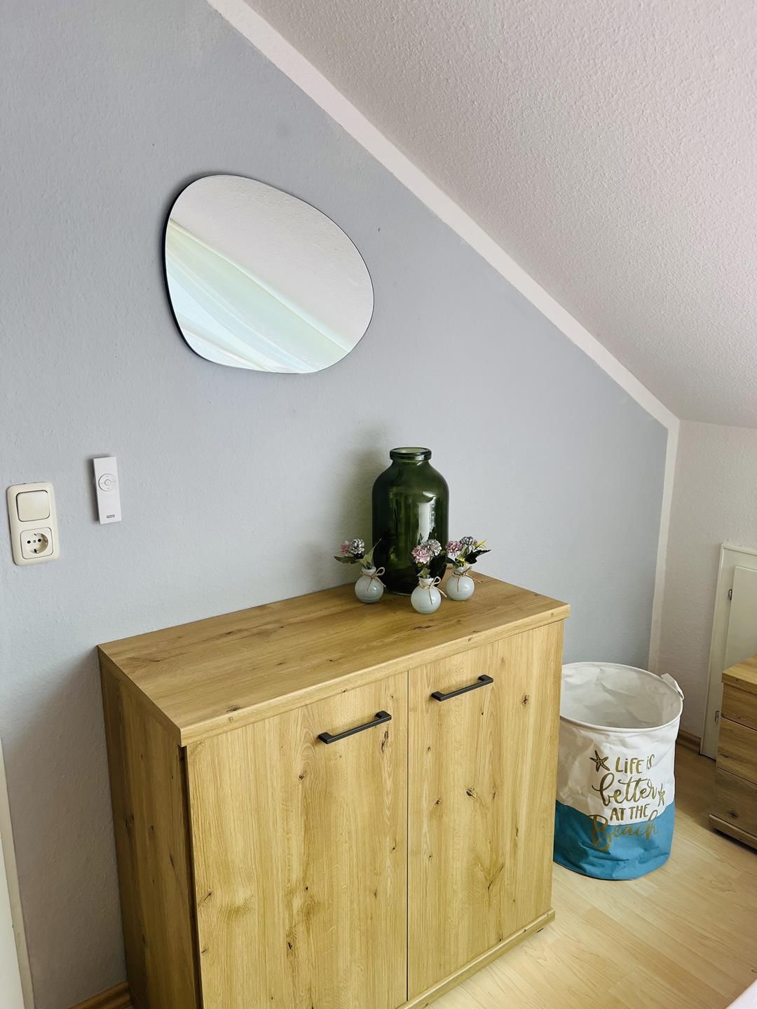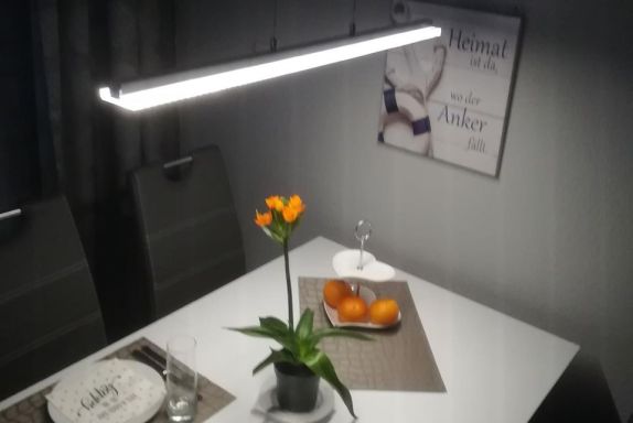 Diese geschmackvoll eingerichtete Obergeschosswohnung mit Balkon ( ab Mittags Sonne bis zum Sonnenuntergang) befindet sich in der 1. Etage und verfügt über einen lichtdurchfluteten Wohnbereich mit Couchgarnitur, einem Esstisch und einer integrierte Küchenzeile. Außerdem ist die Wohnung mit zwei separaten Schlafzimmern (ein Doppelbett, 2 Einzelbetten, Kinderbett), sowie einem Duschbad ausgestattet. Die Böden sind mit Fliesen bzw. Laminat belegt. WLAN steht Ihnen kostenlos zur Verfügung. Ideale Belegung für die Größe der Ferienwohnung: 2 Erwachsene, 1 Kind bis 15 und/oder ein Kleinkind/Baby