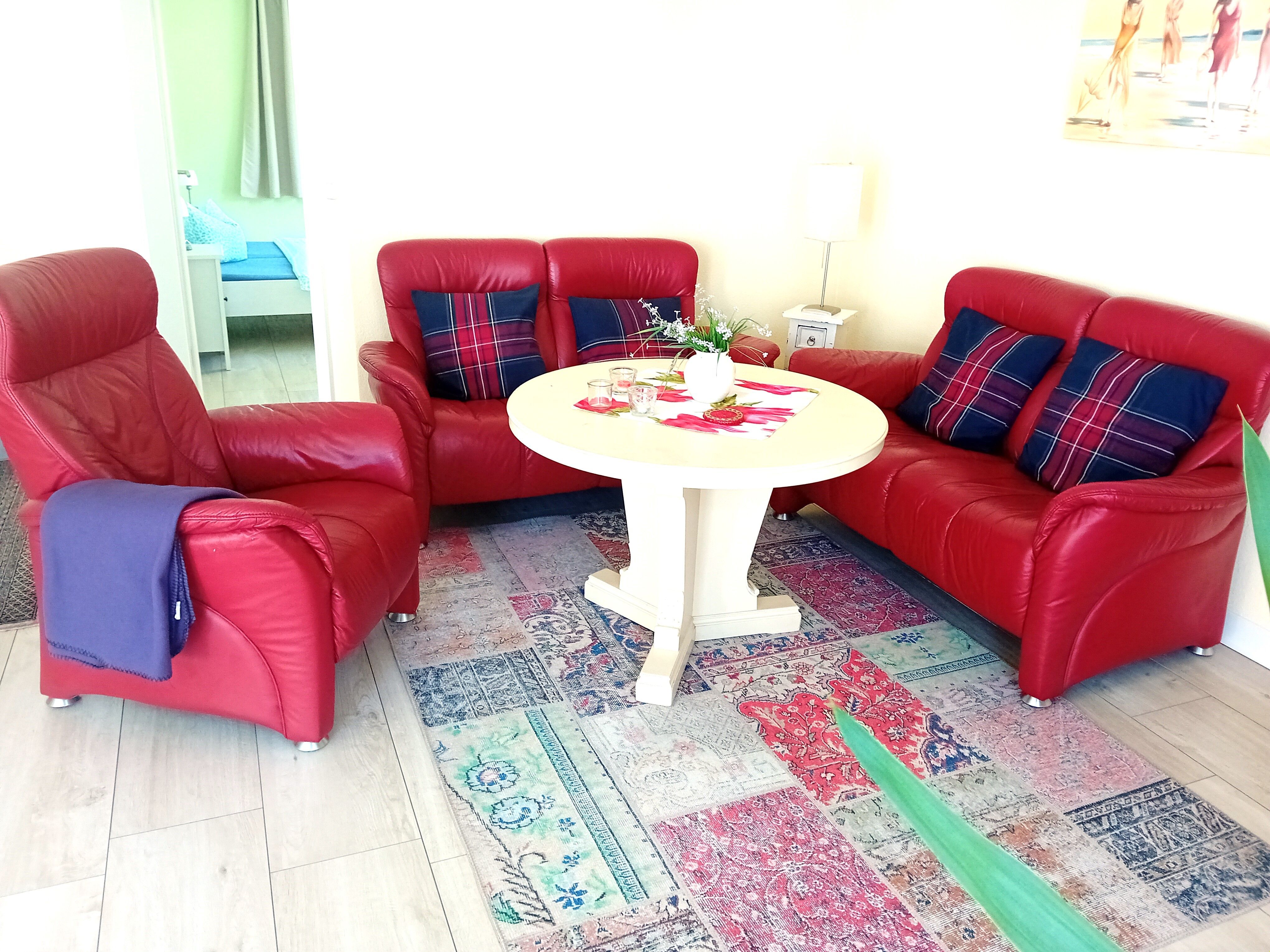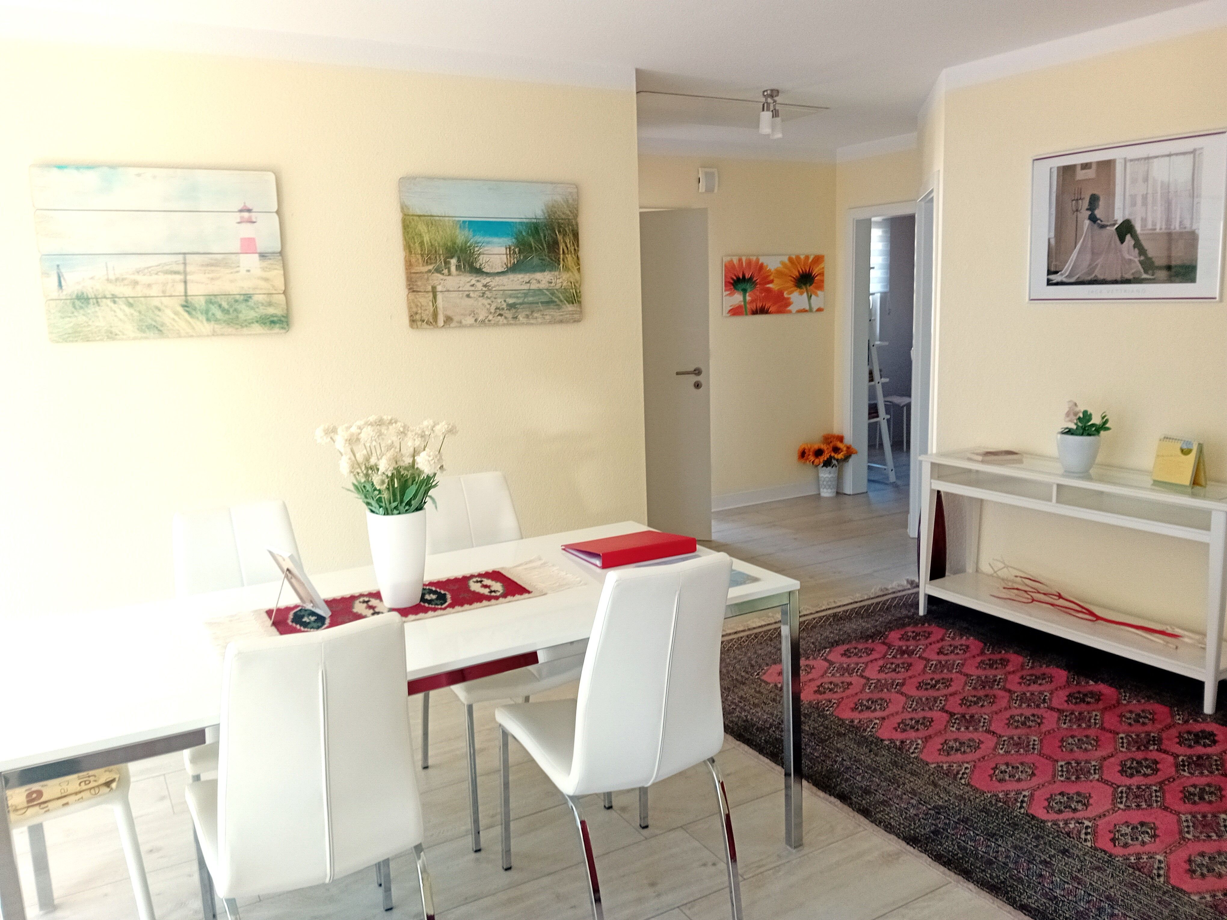Das Appartement ist für 2 bis 4 Erwachsene und ein Kleinkind bis 3 Jahre im Kinderreisebett ausgelegt. Über eine geschlossene Diele treten Sie in einen großen lichtdurchfluteten Wohnbereich, welcher mit einer bodentiefen Fensterfront versehen ist. Hier stehen Ihnen eine gemütliche Fernsehecke mit einer Sitzecke, Couchtisch und Smart-TV mit 3D Sound Blu Ray Anlage sowie ein Esstisch mit 4 Stühlen für Sie bereit.