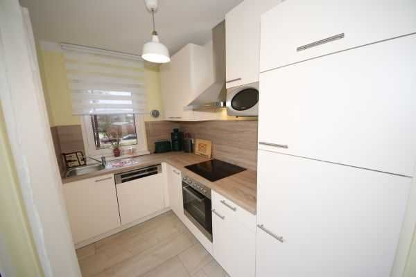 Über eine geschlossene Diele treten Sie in einen großen lichtdurchfluteten Wohnbereich, welcher mit einer bodentiefen Fensterfront versehen ist. Hier stehen Ihnen eine gemütliche Fernsehecke mit einer Sitzecke, Couchtisch und Smart-TV mit 3D Sound Blu Ray Anlage sowie ein Esstisch mit 4 Stühlen für Sie bereit. Den leicht zu bedienenden Ethanol-Kamin können Sie jederzeit in Betrieb nehmen und den Abend bei einem Glas Wein ausklingen lassen.
