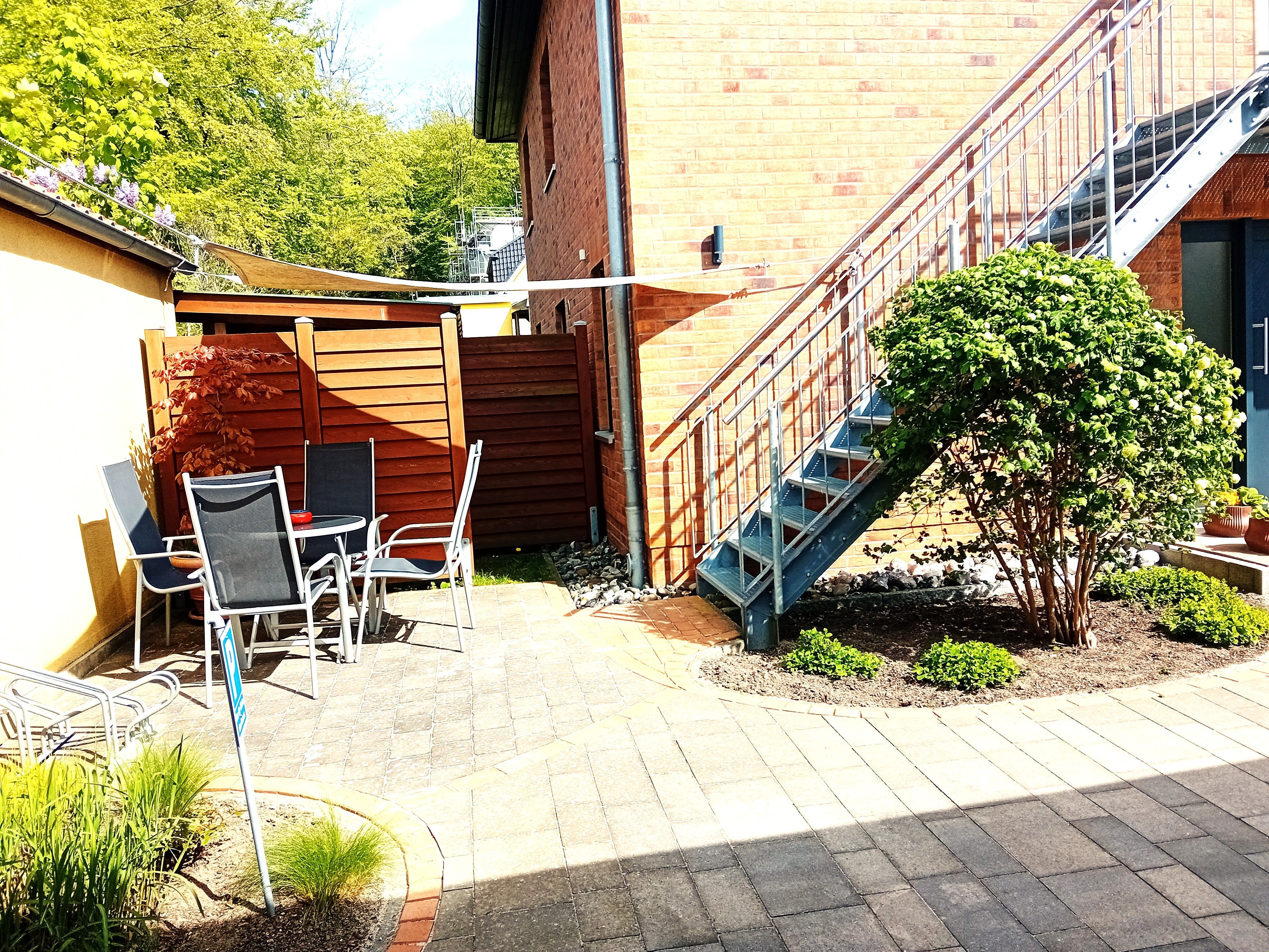 Im Außenbereich erwartet Sie eine kuschlige bestuhlte Terrasse mit Grill (vorhanden) und Sonnensegel sowie ein PKW-Stellplatz (kostenlos) und eine Möglichkeit, Ihre Fahrräder abzustellen.