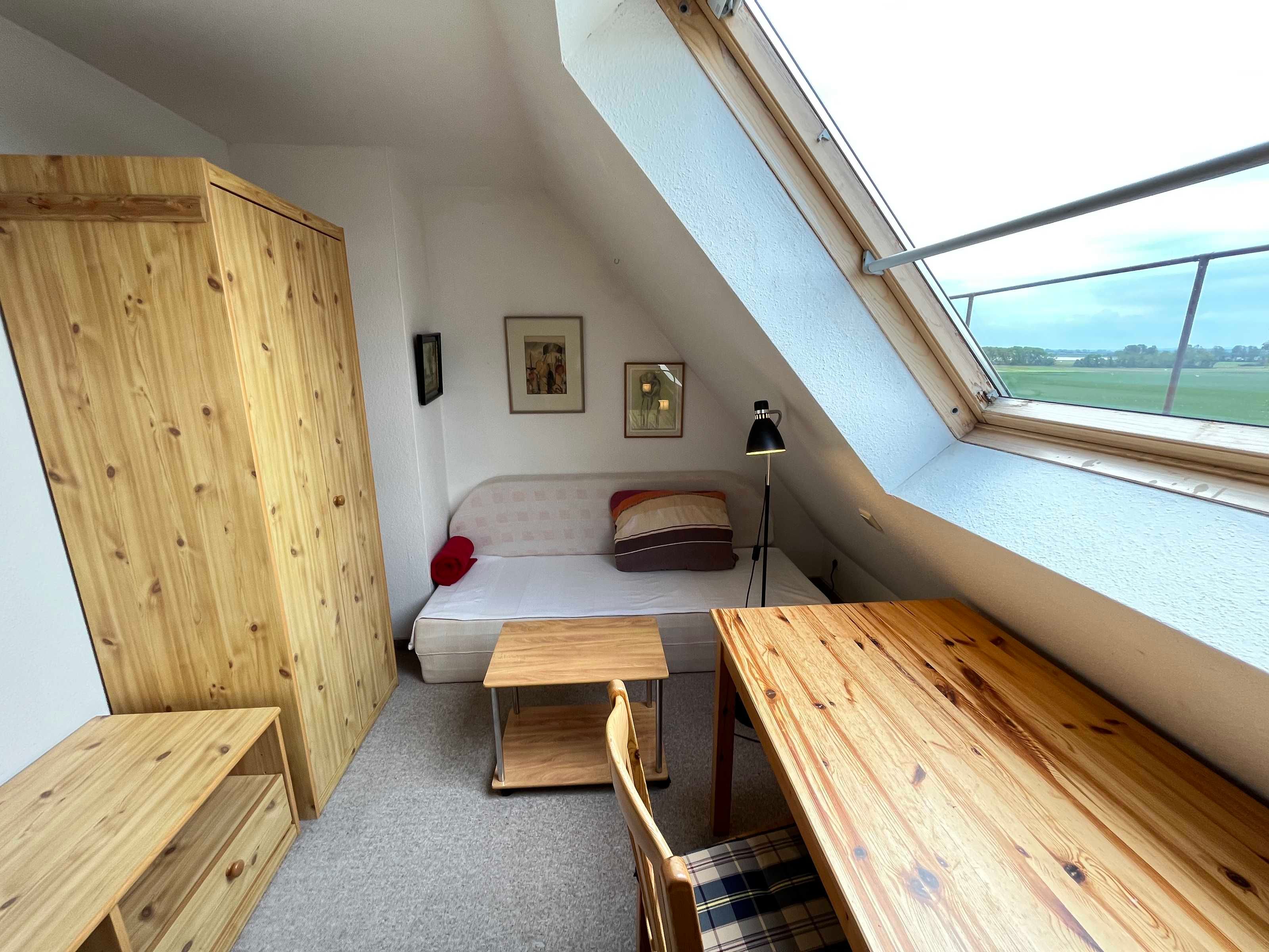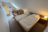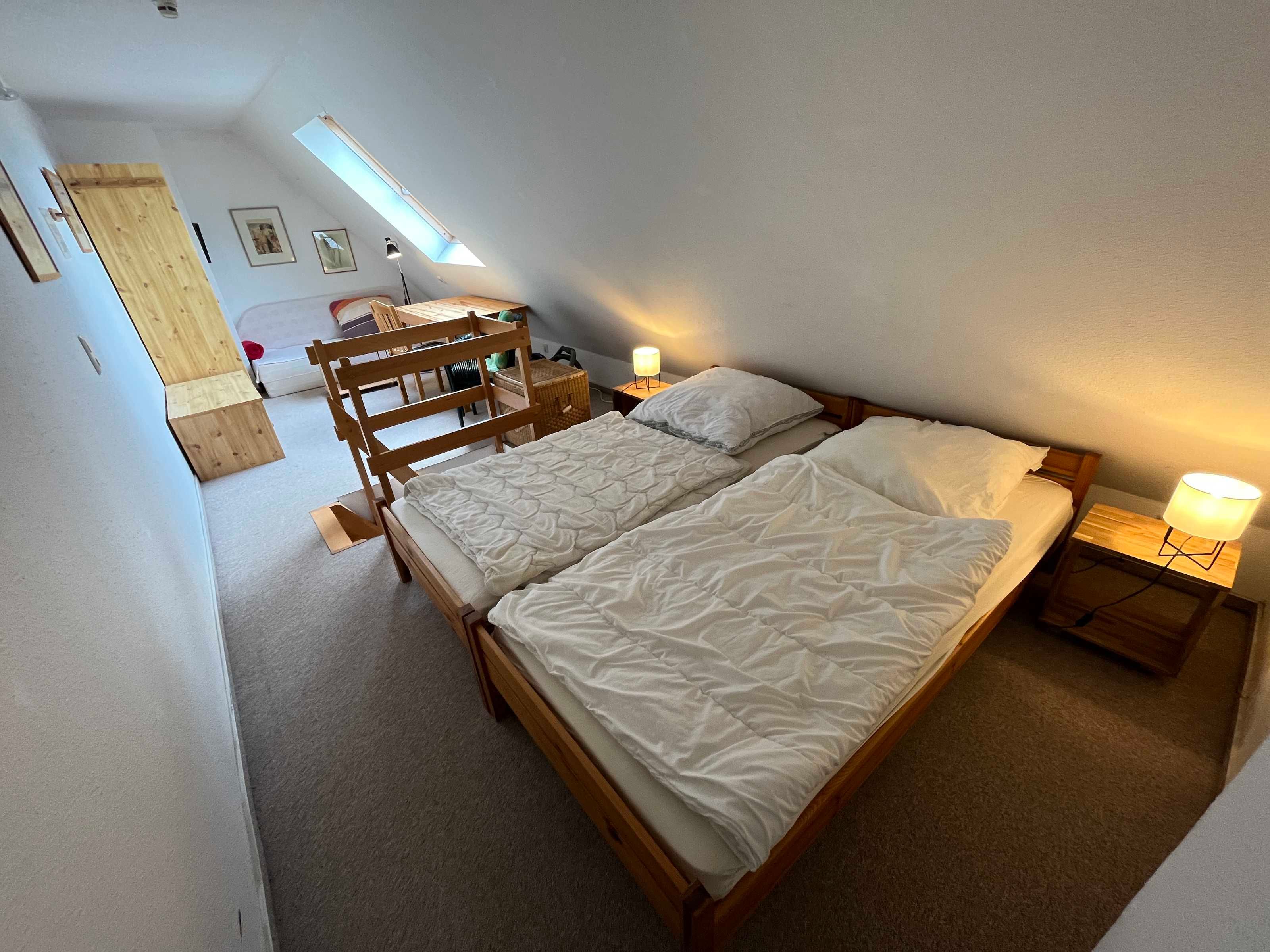 Schlafzimmer mit Doppelbett und Schlafsofa.