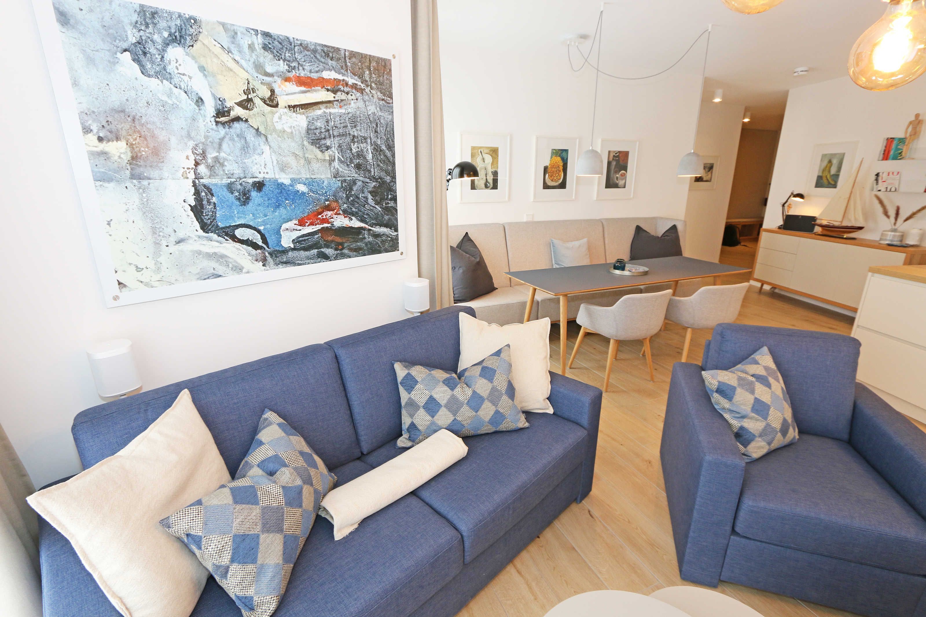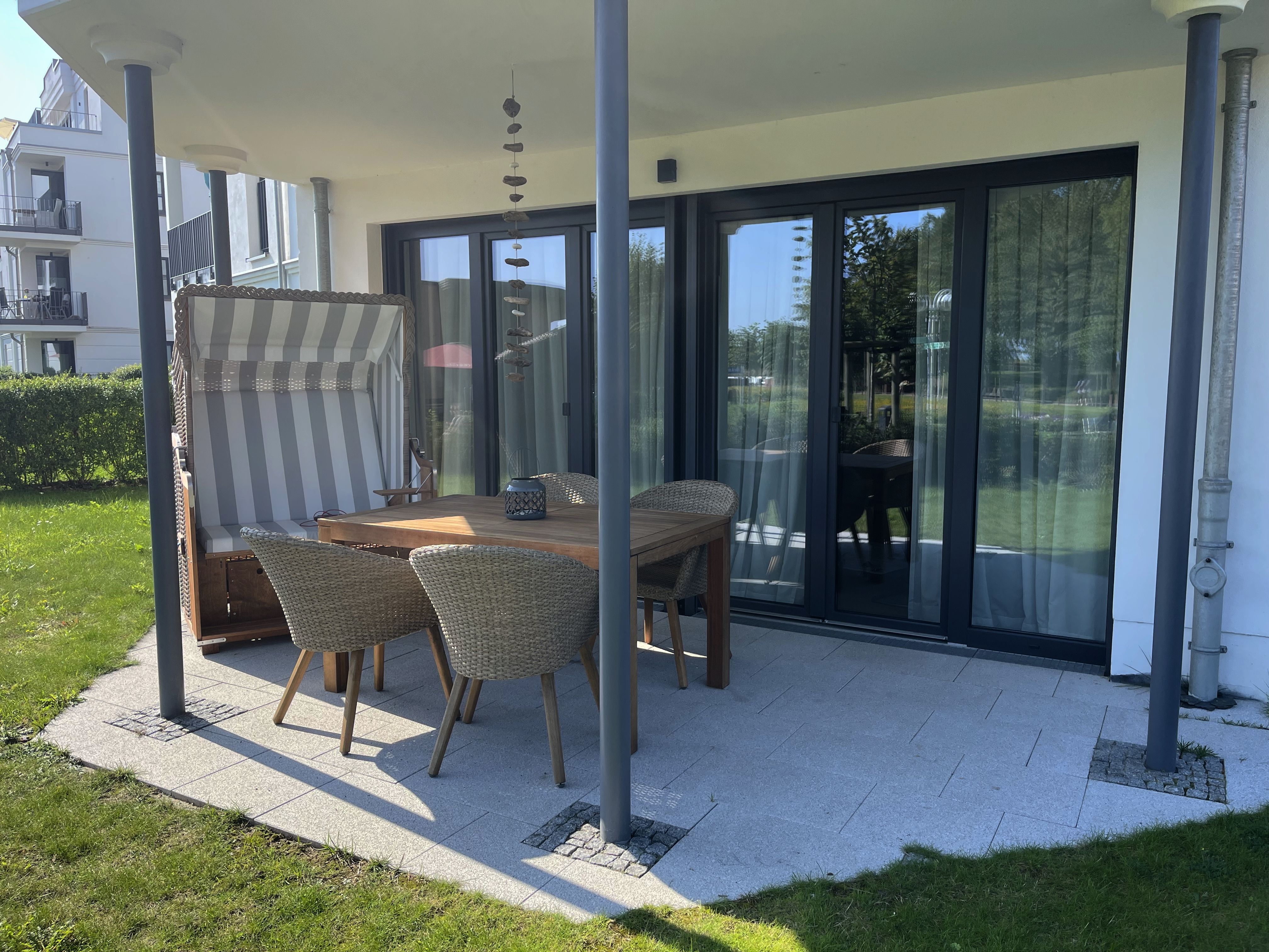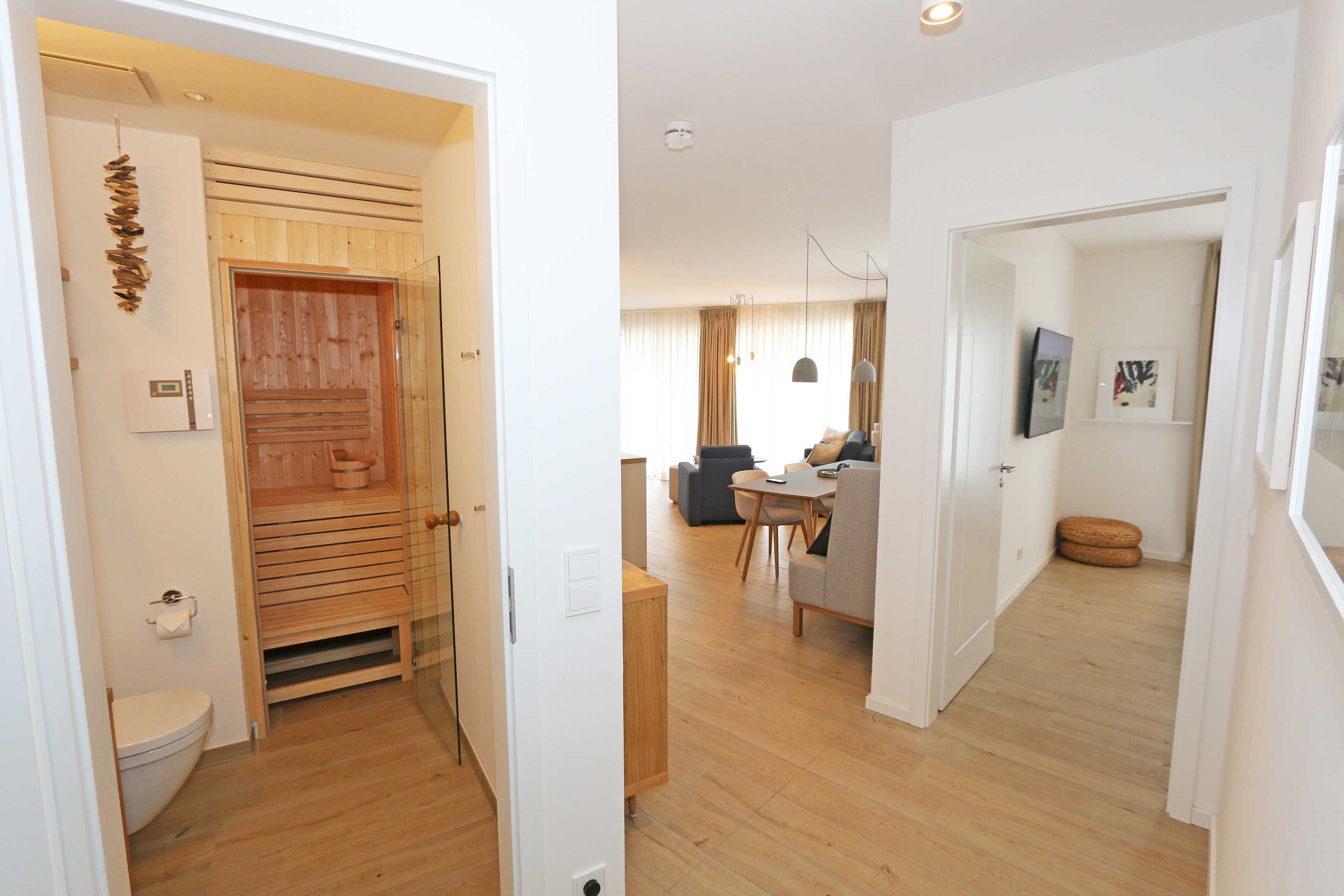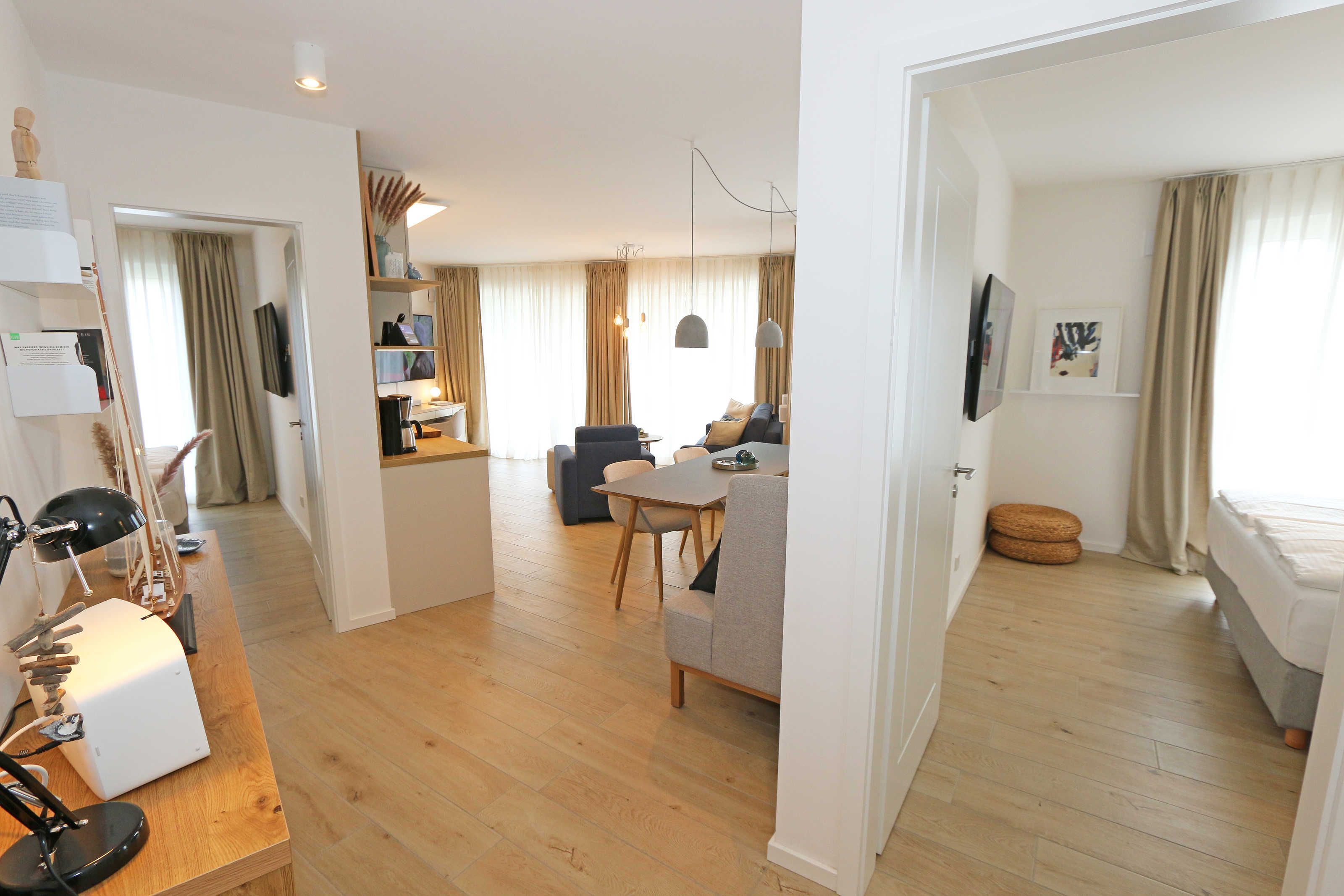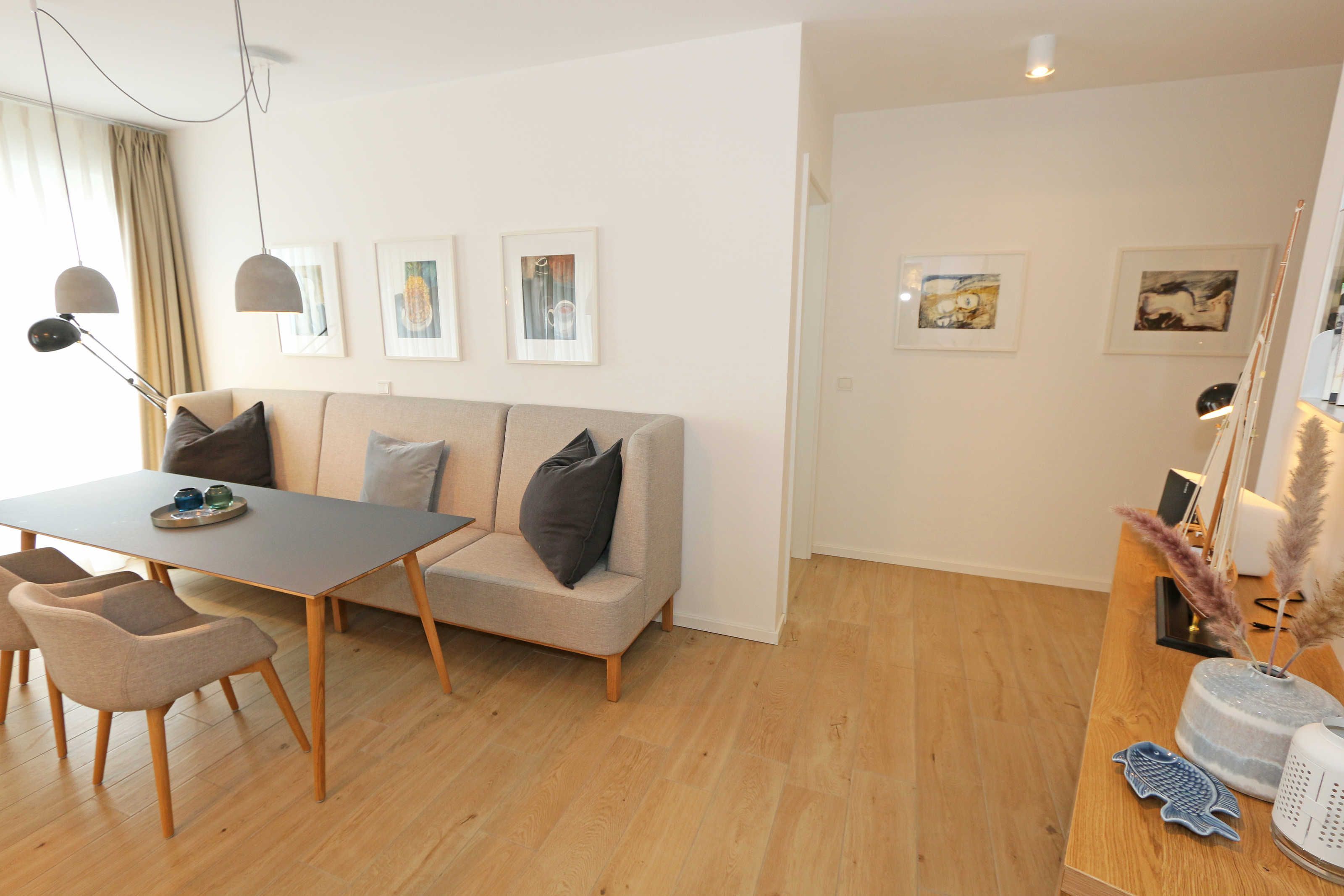 Das geräumige Apartment mit einer Wohnfläche von ca. 80 m² und zwei Schlafzimmern befindet sich im erhöht gelegenen Erdgeschoss des Hauses. Es verfügt über eine bestuhlte und überdachte Terrasse (Nordosten) mit einem zusätzlichen eigenem ca. 150 m² großen Gartenanteil. Die Wohnung eignet sich somit hervorragend für Familien oder Paare mit 2 bis 4 Erwachsene + 1 Kleinkind bis 3 Jahre im Kinderreisebett. Das gemütliche Wohn- und Esszimmer lädt mit ausgewählten Möbeln in hellem Eichenholz und farblich abgestimmten Polstern in charmanter Atmosphäre zum Verweilen ein. Im Essbereich bietet ein langer Tisch mit gepolsterter Sitzbank und Stühlen ausreichend Platz, um ein leckeres Essen zu genießen oder einen geselligen Spieleabend zu verbringen. Nach einem ausgiebigen Strandtag kann man es sich im Wohnbereich auf dem Sessel oder der Couch mit Leselampe bequem machen. Passende Beistelltische, eine Stehlampe und das Sideboard mit einer Auswahl an Gesellschaftsspielen und kleiner Urlaubsbibliothek ergänzen die attraktive Ausstattung. Ein großer 65 Smart-TV und Surround System mit Zugang zu Fernsehen, Film und Musik runden das vielfältige Angebot der Wohnung ab. Ein Account von Netflix, Amazon Prime und Spotify steht Ihnen zusätzlich zur Verfügung. Unterhalb des Fernsehers befindet sich eine praktische Schreibtisch-Konsole, an der Sie sich in die Urlaubspost an Freunde und Familie vertiefen können. Selbstverständlich steht Ihnen ein kostenloser Internetanschluss (WLAN) zur Verfügung. Die offene Küchenzeile ist mit Miele-Geräten hochwertig ausgestattet und lässt mit Ceran-Kochfeld, Backofen, Spülmaschine, Kühlschrank mit Gefrierkombination, Mikrowelle, Kaffeemaschine, Toaster, Wasserkocher und allen nötigen Küchenutensilien bei Kochbegeisterten keine Wünsche offen. Alle lichtdurchfluteten Wohn- und Schlafräume sind mit bodentiefen Fenstern, leichten Stores und blickdichten Vorhängen ausgestattet, die bei Bedarf mit elektrischen Rollläden vollständig verdunkelt werden können. Von allen Räumen können sie in den umlaufenden Garten gelangen und schon am Morgen barfuß über die Wiese laufen, um ihr Frühstück auf der überdachten Terrasse mit Strandkorb bei einer Prise Meeresluft zu genießen. In beiden Schlafzimmern gewährleisten komfortable Boxspringbetten (á 1,80m x 2,00m) mit durchgehendem Topper und gepolstertem Betthaupt tiefen und erholsamen Schlaf. Nachttischablagen und große deckenhohe Kleiderschränke sorgen für eine optimale Raumaufteilung. Zusätzlich steht hier je ein weiterer Smart-TV zur Verfügung. Im Masterbad befindet sich eine ebenerdige Regendusche und ein Handtuchtrockner, im zweiten Bad die Sauna. Beide Bäder sind mit einem Waschtisch mit Schubladen und Ablagefächern, einem Wandspiegel, einem WC, Fön und Kosmetikspiegeln ausgestattet. Auch der Eingangsbereich und Flur ist für einen angenehmen Aufenthalt mit durchdachten Details gestaltet. Eine breite Sitzbank mit Schubfächern, Ganzkörperspiegel, Garderobe und einem weiteren geräumigen Schrank ermöglicht viel zusätzlichen Raum um Strandutensilien, Koffer etc. verstauen zu können. Hier finden Sie u.a. auch einen Staubsauger, Bügeleisen und Bügelbrett, Wäscheständer und Reinigungszubehör. Die gesamte Wohnung ist mit Feinsteinfliesen in Holzoptik ausgelegt. Eine Fußbodenheizung sorgt auch an kühleren Tagen für angenehme Wärme. Alle Lampen sind dimmbar, so dass Sie die Lichtstimmung nach Ihren Wünschen gestalten können. Haustiere sind nicht erlaubt. Zur Wohnung gehört ein Tiefgaragenstellplatz (Nr. 11/ Einfahrtshöhe 2,00m) mit einer Ladestation für Elektrofahrzeuge, der sich bequem über den Fahrstuhl erreichen lässt. Fahrräder können im begrünten Außenbereich oder einem abschließbaren Kellerraum (Nr.19) sicher abgestellt werden. Hier können auch E-Bikes geladen werden. Im Untergeschoss des Gebäudes befindet sich ein weiterer Wellnessbereich mit einer Gemeinschaftssauna und einem Ruheraum. Ein Waschraum mit Waschmaschinen und Wäschetrockner stehen mit Münzautomaten zur Verfügung. Die Erstausstattung eines Wäschepaketes (komplette Bettwäsche, 1 Duschhandtuch, 2 kleine Handtücher) können Sie bis 14 Tage vor der Anreise gegen einen Aufpreis dazu buchen oder durch eigene ergänzen. Ab 2 gebuchten Paketen erhalten Sie einmalig 1 Geschirrtuch und einen Duschvorleger dazu.