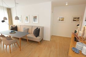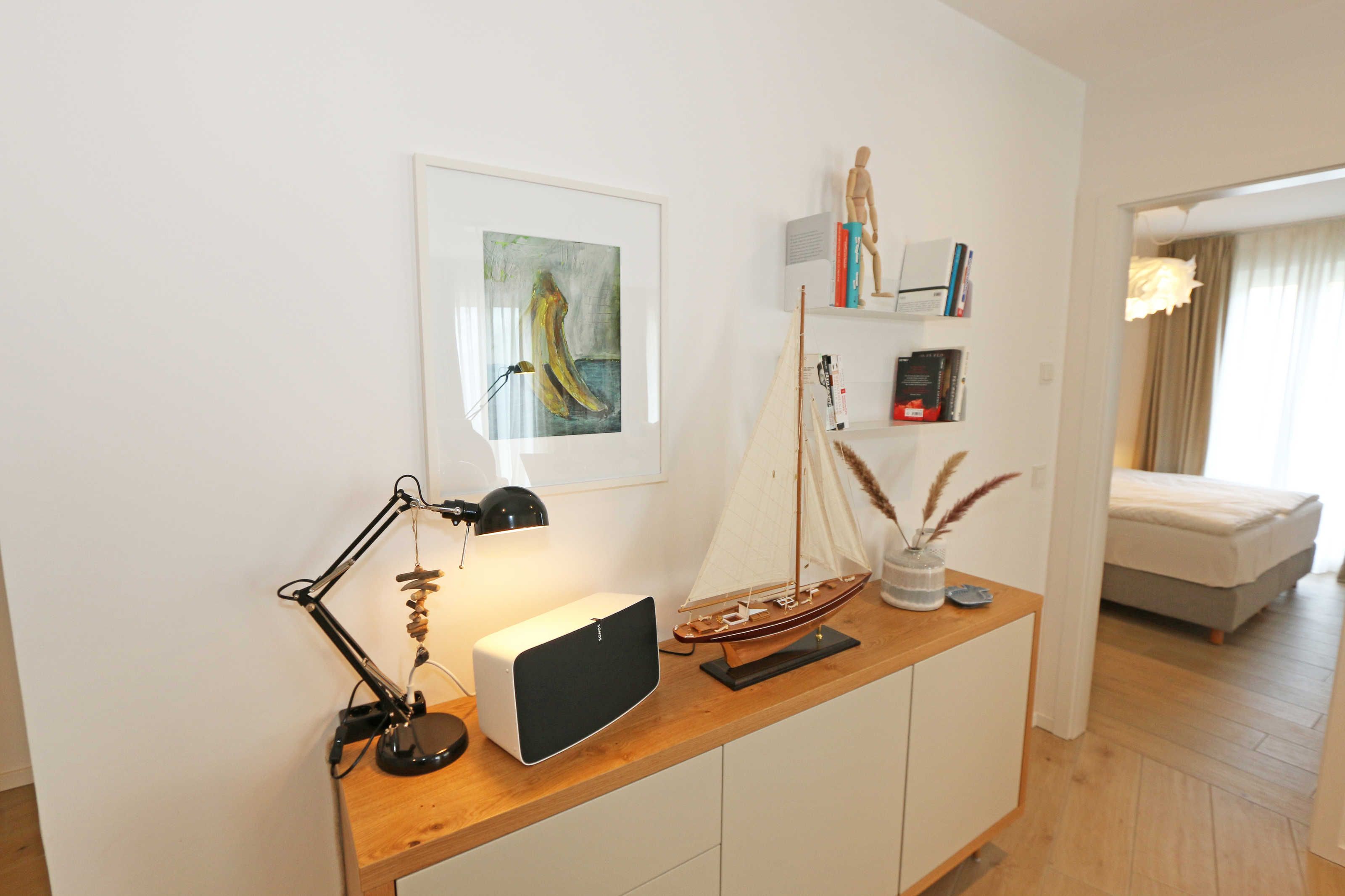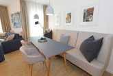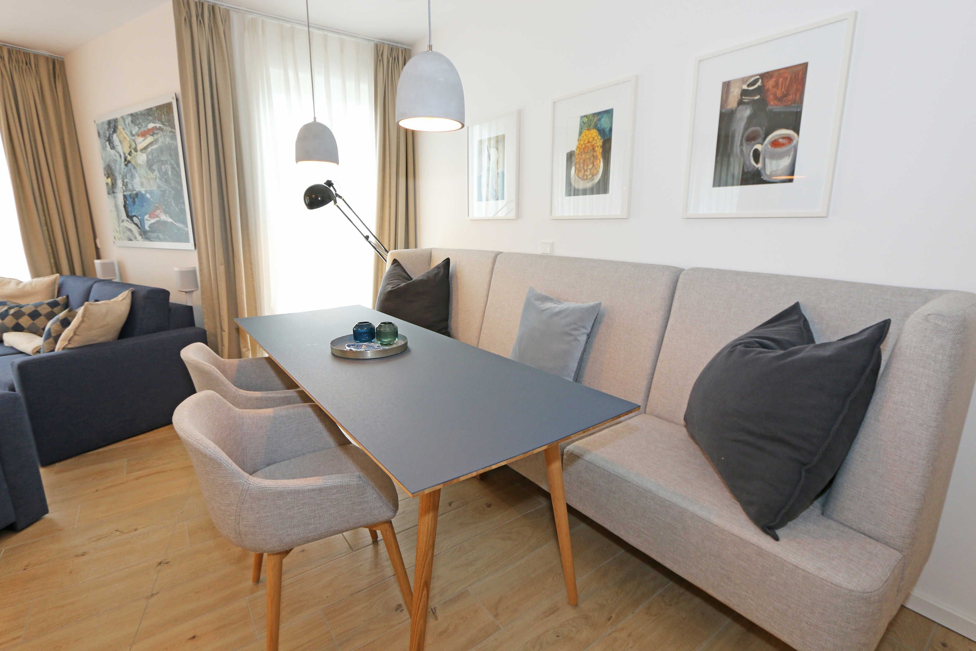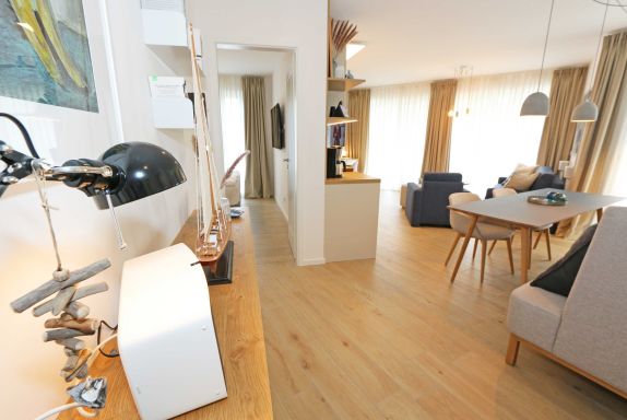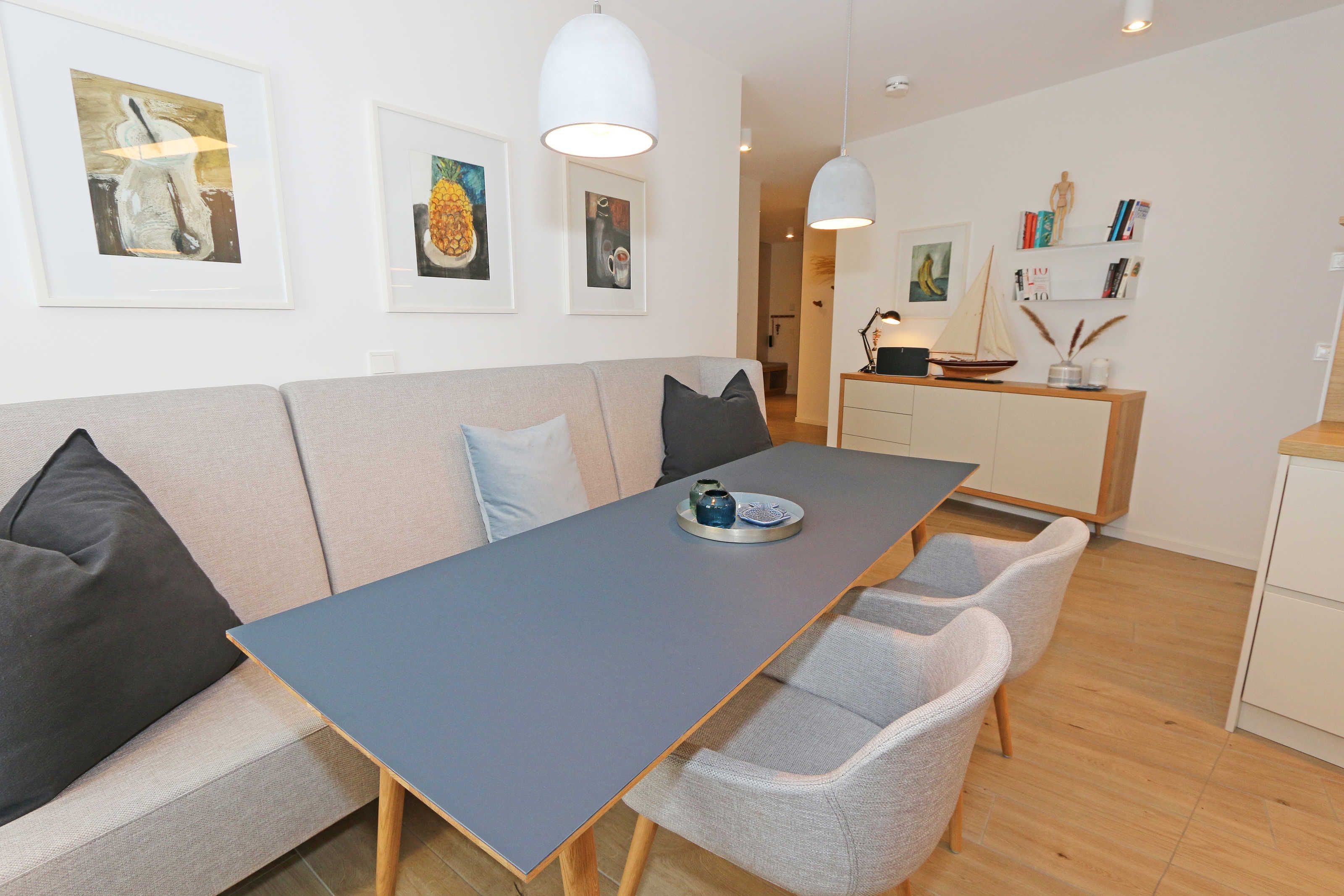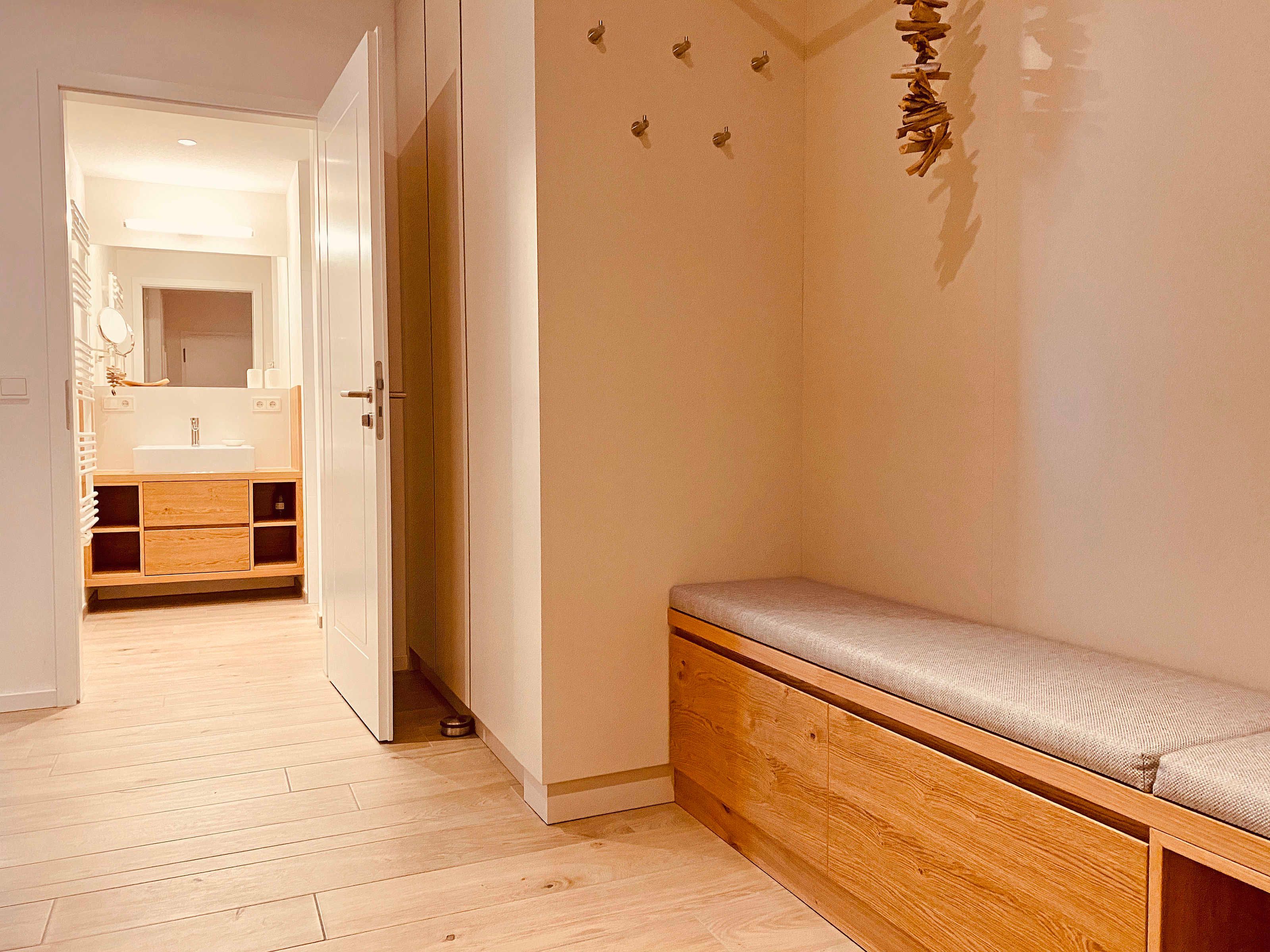 Das geräumige Apartment mit einer Wohnfläche von ca. 80 m² und zwei Schlafzimmern befindet sich im erhöht gelegenen Erdgeschoss des Hauses. Es verfügt über eine bestuhlte und überdachte Terrasse (Nordosten) mit einem zusätzlichen eigenem ca. 150 m² großen Gartenanteil. Die Wohnung eignet sich somit hervorragend für Familien oder Paare mit 2 bis 4 Erwachsene + 1 Kleinkind bis 3 Jahre im Kinderreisebett. Das gemütliche Wohn- und Esszimmer lädt mit ausgewählten Möbeln in hellem Eichenholz und farblich abgestimmten Polstern in charmanter Atmosphäre zum Verweilen ein. Im Essbereich bietet ein langer Tisch mit gepolsterter Sitzbank und Stühlen ausreichend Platz, um ein leckeres Essen zu genießen oder einen geselligen Spieleabend zu verbringen. Nach einem ausgiebigen Strandtag kann man es sich im Wohnbereich auf dem Sessel oder der Couch mit Leselampe bequem machen. Passende Beistelltische, eine Stehlampe und das Sideboard mit einer Auswahl an Gesellschaftsspielen und kleiner Urlaubsbibliothek ergänzen die attraktive Ausstattung. Ein großer 65 Smart-TV und Surround System mit Zugang zu Fernsehen, Film und Musik runden das vielfältige Angebot der Wohnung ab. Ein Account von Netflix, Amazon Prime und Spotify steht Ihnen zusätzlich zur Verfügung. Unterhalb des Fernsehers befindet sich eine praktische Schreibtisch-Konsole, an der Sie sich in die Urlaubspost an Freunde und Familie vertiefen können. Selbstverständlich steht Ihnen ein kostenloser Internetanschluss (WLAN) zur Verfügung. Die offene Küchenzeile ist mit Miele-Geräten hochwertig ausgestattet und lässt mit Ceran-Kochfeld, Backofen, Spülmaschine, Kühlschrank mit Gefrierkombination, Mikrowelle, Kaffeemaschine, Toaster, Wasserkocher und allen nötigen Küchenutensilien bei Kochbegeisterten keine Wünsche offen. Alle lichtdurchfluteten Wohn- und Schlafräume sind mit bodentiefen Fenstern, leichten Stores und blickdichten Vorhängen ausgestattet, die bei Bedarf mit elektrischen Rollläden vollständig verdunkelt werden können. Von allen Räumen können sie in den umlaufenden Garten gelangen und schon am Morgen barfuß über die Wiese laufen, um ihr Frühstück auf der überdachten Terrasse mit Strandkorb bei einer Prise Meeresluft zu genießen. In beiden Schlafzimmern gewährleisten komfortable Boxspringbetten (á 1,80m x 2,00m) mit durchgehendem Topper und gepolstertem Betthaupt tiefen und erholsamen Schlaf. Nachttischablagen und große deckenhohe Kleiderschränke sorgen für eine optimale Raumaufteilung. Zusätzlich steht hier je ein weiterer Smart-TV zur Verfügung. Im Masterbad befindet sich eine ebenerdige Regendusche und ein Handtuchtrockner, im zweiten Bad die Sauna. Beide Bäder sind mit einem Waschtisch mit Schubladen und Ablagefächern, einem Wandspiegel, einem WC, Fön und Kosmetikspiegeln ausgestattet. Auch der Eingangsbereich und Flur ist für einen angenehmen Aufenthalt mit durchdachten Details gestaltet. Eine breite Sitzbank mit Schubfächern, Ganzkörperspiegel, Garderobe und einem weiteren geräumigen Schrank ermöglicht viel zusätzlichen Raum um Strandutensilien, Koffer etc. verstauen zu können. Hier finden Sie u.a. auch einen Staubsauger, Bügeleisen und Bügelbrett, Wäscheständer und Reinigungszubehör. Die gesamte Wohnung ist mit Feinsteinfliesen in Holzoptik ausgelegt. Eine Fußbodenheizung sorgt auch an kühleren Tagen für angenehme Wärme. Alle Lampen sind dimmbar, so dass Sie die Lichtstimmung nach Ihren Wünschen gestalten können. Haustiere sind nicht erlaubt. Zur Wohnung gehört ein Tiefgaragenstellplatz (Nr. 11/ Einfahrtshöhe 2,00m) mit einer Ladestation für Elektrofahrzeuge, der sich bequem über den Fahrstuhl erreichen lässt. Fahrräder können im begrünten Außenbereich oder einem abschließbaren Kellerraum (Nr.19) sicher abgestellt werden. Hier können auch E-Bikes geladen werden. Im Untergeschoss des Gebäudes befindet sich ein weiterer Wellnessbereich mit einer Gemeinschaftssauna und einem Ruheraum. Ein Waschraum mit Waschmaschinen und Wäschetrockner stehen mit Münzautomaten zur Verfügung. Die Erstausstattung eines Wäschepaketes (komplette Bettwäsche, 1 Duschhandtuch, 2 kleine Handtücher) können Sie bis 14 Tage vor der Anreise gegen einen Aufpreis dazu buchen oder durch eigene ergänzen. Ab 2 gebuchten Paketen erhalten Sie einmalig 1 Geschirrtuch und einen Duschvorleger dazu.
