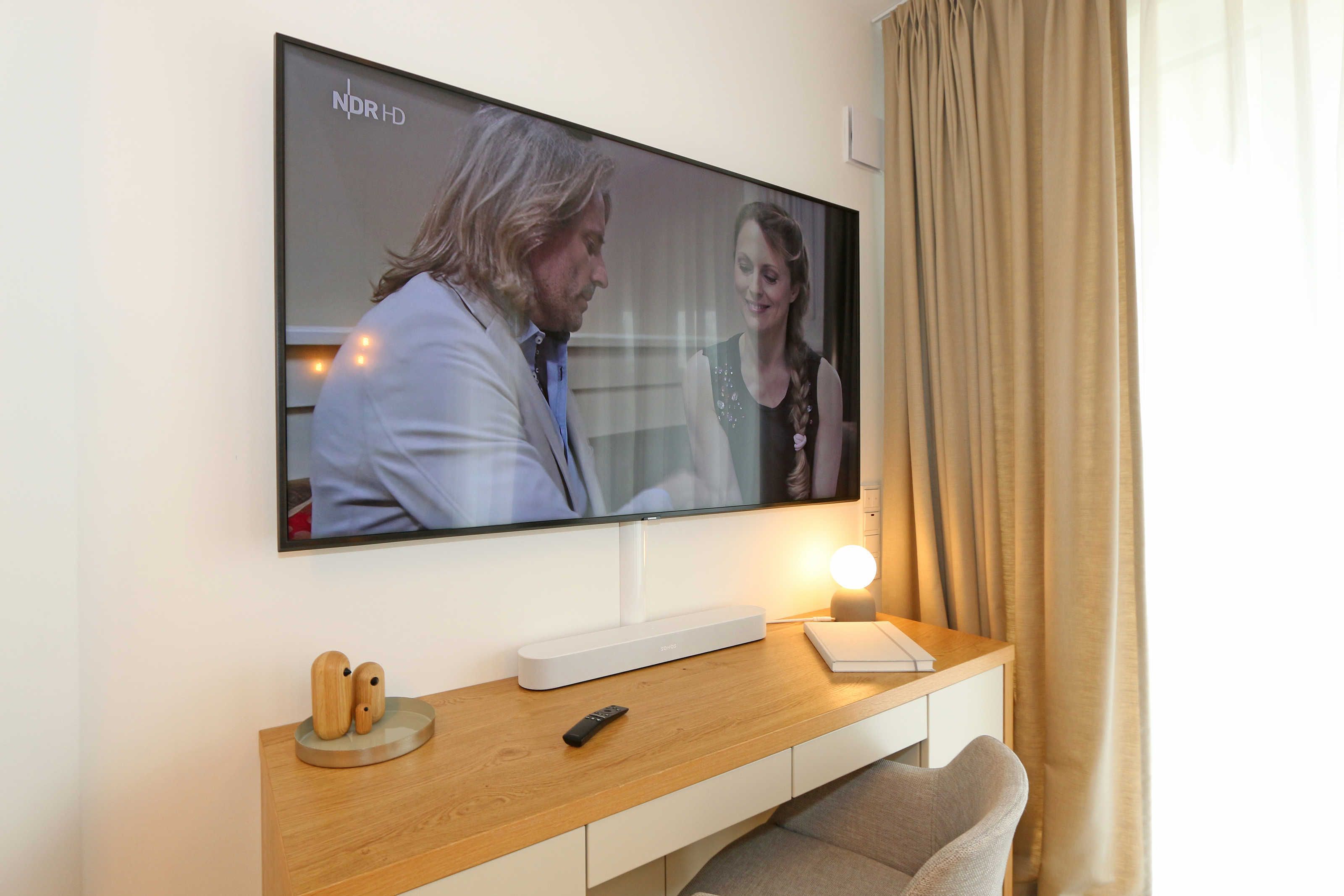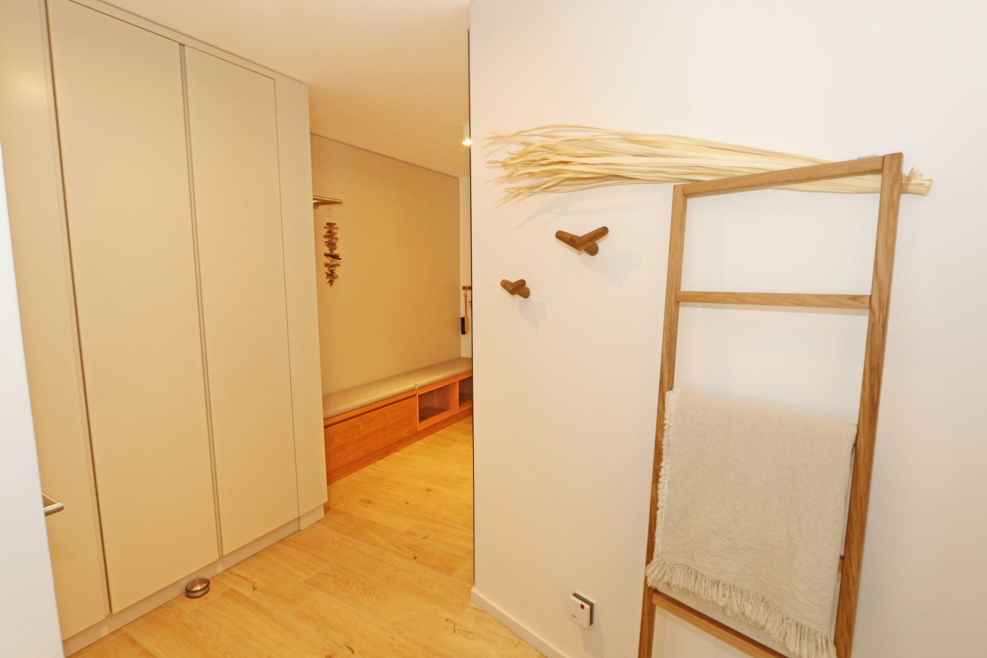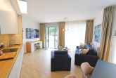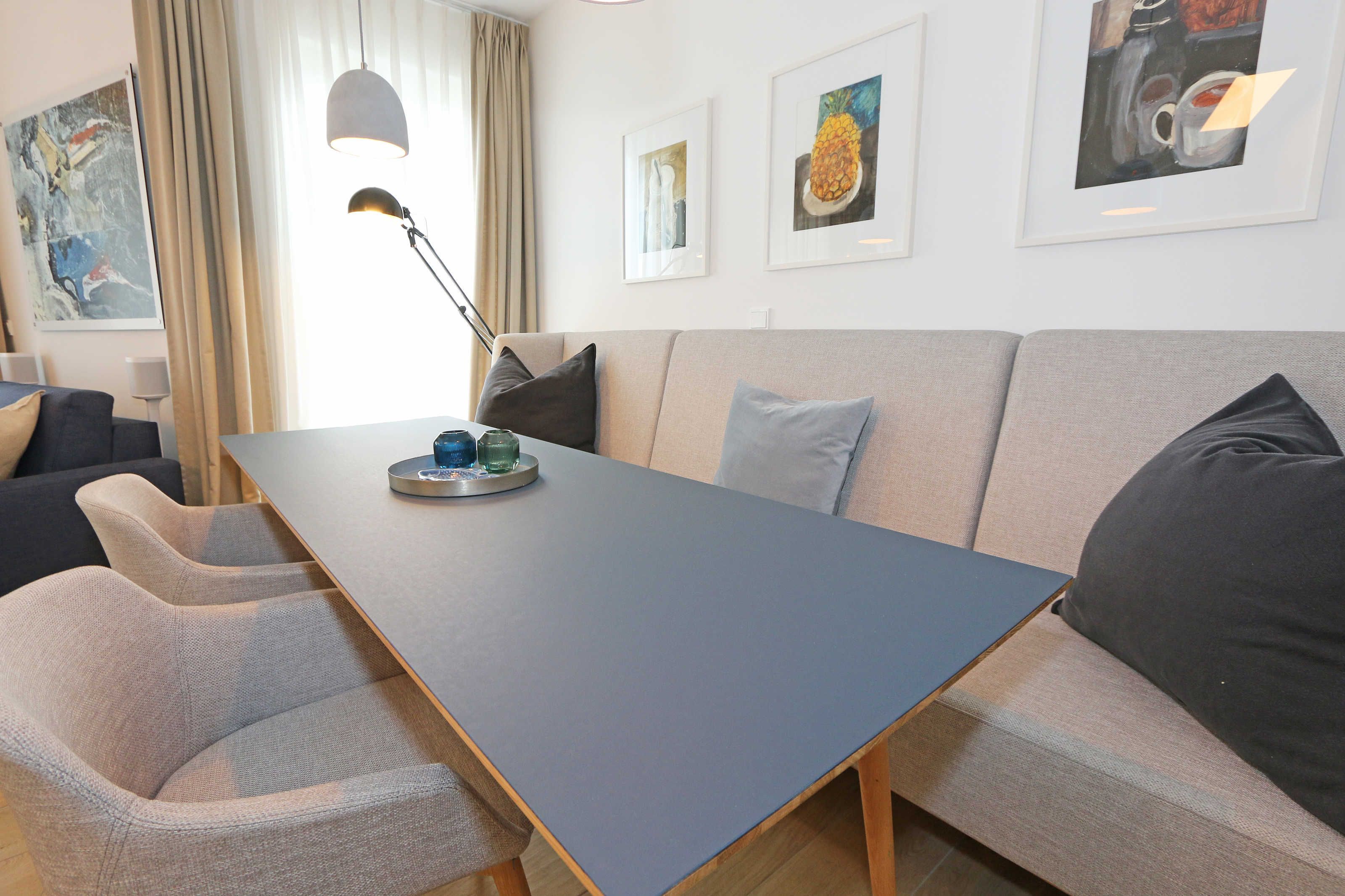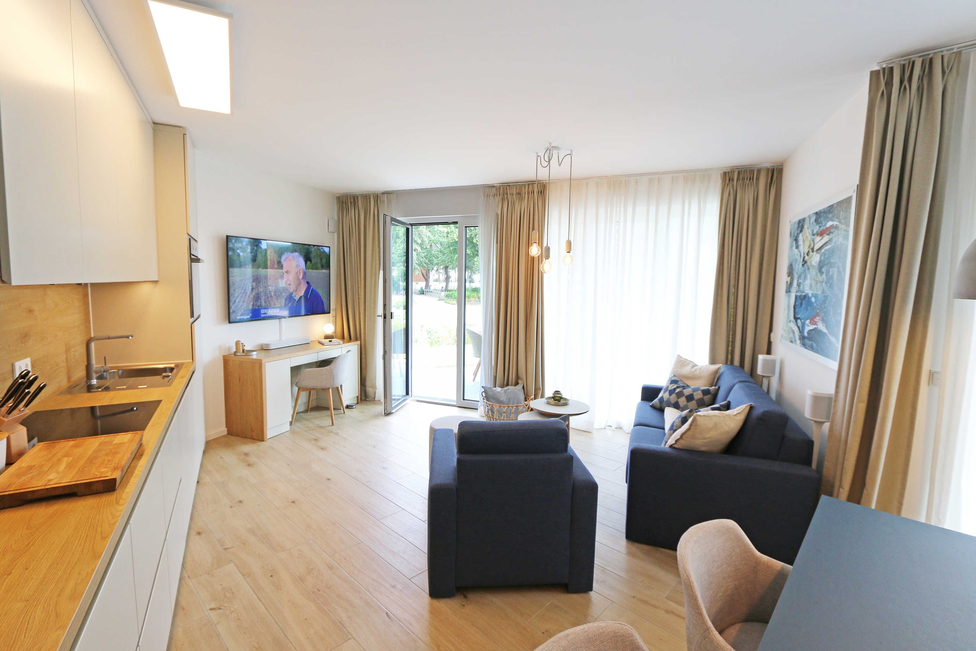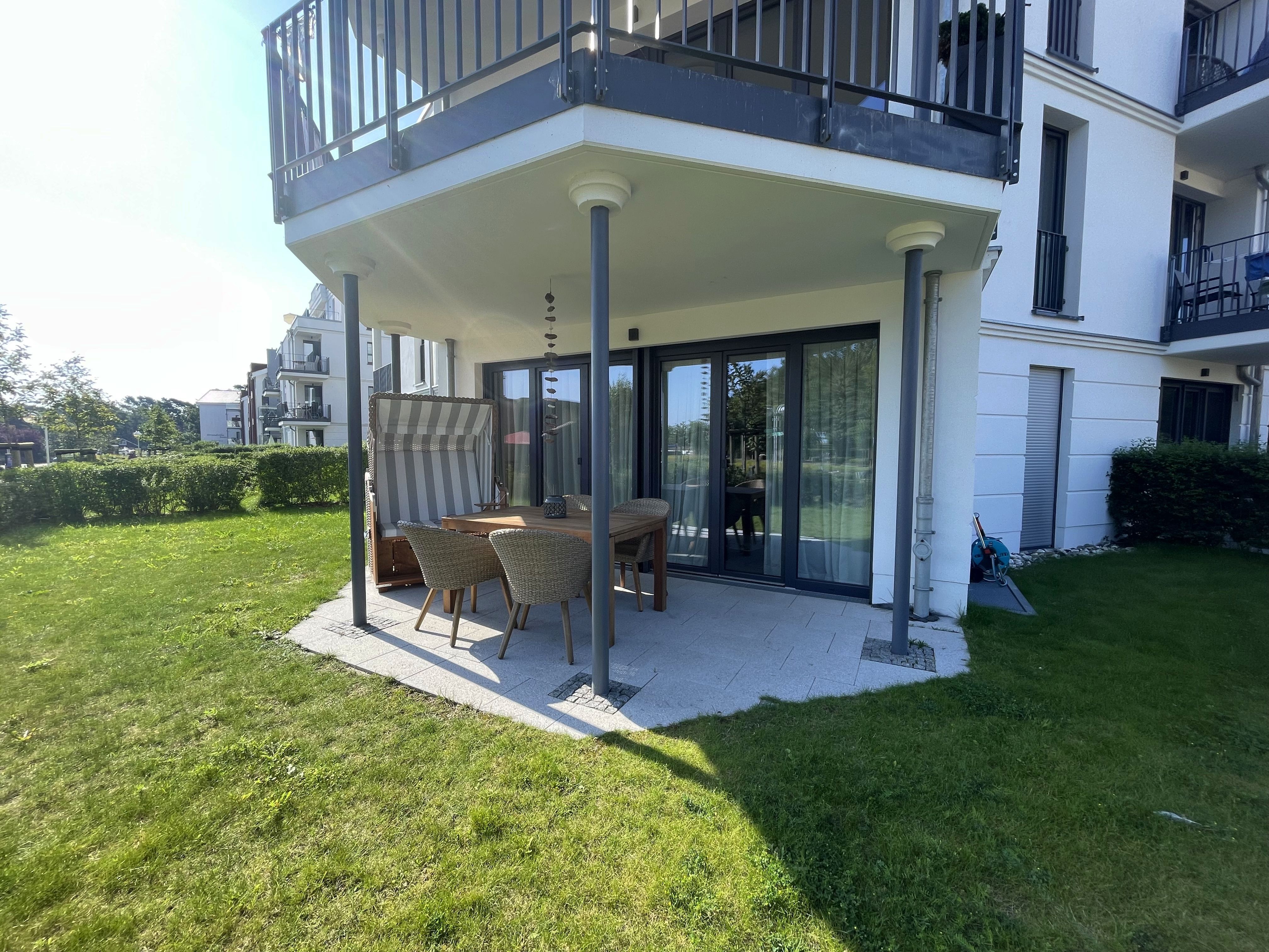 Das geräumige Apartment mit einer Wohnfläche von ca. 80 m² und zwei Schlafzimmern befindet sich im erhöht gelegenen Erdgeschoss des Hauses. Es verfügt über eine bestuhlte und überdachte Terrasse (Nordosten) mit einem zusätzlichen eigenem ca. 150 m² großen Gartenanteil. Die Wohnung eignet sich somit hervorragend für Familien oder Paare mit 2 bis 4 Erwachsene + 1 Kleinkind bis 3 Jahre im Kinderreisebett. Das gemütliche Wohn- und Esszimmer lädt mit ausgewählten Möbeln in hellem Eichenholz und farblich abgestimmten Polstern in charmanter Atmosphäre zum Verweilen ein. Im Essbereich bietet ein langer Tisch mit gepolsterter Sitzbank und Stühlen ausreichend Platz, um ein leckeres Essen zu genießen oder einen geselligen Spieleabend zu verbringen. Nach einem ausgiebigen Strandtag kann man es sich im Wohnbereich auf dem Sessel oder der Couch mit Leselampe bequem machen. Passende Beistelltische, eine Stehlampe und das Sideboard mit einer Auswahl an Gesellschaftsspielen und kleiner Urlaubsbibliothek ergänzen die attraktive Ausstattung. Ein großer 65 Smart-TV und Surround System mit Zugang zu Fernsehen, Film und Musik runden das vielfältige Angebot der Wohnung ab. Ein Account von Netflix, Amazon Prime und Spotify steht Ihnen zusätzlich zur Verfügung. Unterhalb des Fernsehers befindet sich eine praktische Schreibtisch-Konsole, an der Sie sich in die Urlaubspost an Freunde und Familie vertiefen können. Selbstverständlich steht Ihnen ein kostenloser Internetanschluss (WLAN) zur Verfügung. Die offene Küchenzeile ist mit Miele-Geräten hochwertig ausgestattet und lässt mit Ceran-Kochfeld, Backofen, Spülmaschine, Kühlschrank mit Gefrierkombination, Mikrowelle, Kaffeemaschine, Toaster, Wasserkocher und allen nötigen Küchenutensilien bei Kochbegeisterten keine Wünsche offen. Alle lichtdurchfluteten Wohn- und Schlafräume sind mit bodentiefen Fenstern, leichten Stores und blickdichten Vorhängen ausgestattet, die bei Bedarf mit elektrischen Rollläden vollständig verdunkelt werden können. Von allen Räumen können sie in den umlaufenden Garten gelangen und schon am Morgen barfuß über die Wiese laufen, um ihr Frühstück auf der überdachten Terrasse mit Strandkorb bei einer Prise Meeresluft zu genießen. In beiden Schlafzimmern gewährleisten komfortable Boxspringbetten (á 1,80m x 2,00m) mit durchgehendem Topper und gepolstertem Betthaupt tiefen und erholsamen Schlaf. Nachttischablagen und große deckenhohe Kleiderschränke sorgen für eine optimale Raumaufteilung. Zusätzlich steht hier je ein weiterer Smart-TV zur Verfügung. Im Masterbad befindet sich eine ebenerdige Regendusche und ein Handtuchtrockner, im zweiten Bad die Sauna. Beide Bäder sind mit einem Waschtisch mit Schubladen und Ablagefächern, einem Wandspiegel, einem WC, Fön und Kosmetikspiegeln ausgestattet. Auch der Eingangsbereich und Flur ist für einen angenehmen Aufenthalt mit durchdachten Details gestaltet. Eine breite Sitzbank mit Schubfächern, Ganzkörperspiegel, Garderobe und einem weiteren geräumigen Schrank ermöglicht viel zusätzlichen Raum um Strandutensilien, Koffer etc. verstauen zu können. Hier finden Sie u.a. auch einen Staubsauger, Bügeleisen und Bügelbrett, Wäscheständer und Reinigungszubehör. Die gesamte Wohnung ist mit Feinsteinfliesen in Holzoptik ausgelegt. Eine Fußbodenheizung sorgt auch an kühleren Tagen für angenehme Wärme. Alle Lampen sind dimmbar, so dass Sie die Lichtstimmung nach Ihren Wünschen gestalten können. Haustiere sind nicht erlaubt. Zur Wohnung gehört ein Tiefgaragenstellplatz (Nr. 11/ Einfahrtshöhe 2,00m) mit einer Ladestation für Elektrofahrzeuge, der sich bequem über den Fahrstuhl erreichen lässt. Fahrräder können im begrünten Außenbereich oder einem abschließbaren Kellerraum (Nr.19) sicher abgestellt werden. Hier können auch E-Bikes geladen werden. Im Untergeschoss des Gebäudes befindet sich ein weiterer Wellnessbereich mit einer Gemeinschaftssauna und einem Ruheraum. Ein Waschraum mit Waschmaschinen und Wäschetrockner stehen mit Münzautomaten zur Verfügung. Die Erstausstattung eines Wäschepaketes (komplette Bettwäsche, 1 Duschhandtuch, 2 kleine Handtücher) können Sie bis 14 Tage vor der Anreise gegen einen Aufpreis dazu buchen oder durch eigene ergänzen. Ab 2 gebuchten Paketen erhalten Sie einmalig 1 Geschirrtuch und einen Duschvorleger dazu.