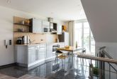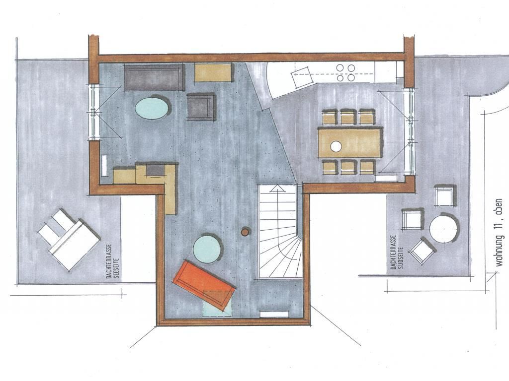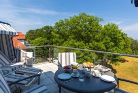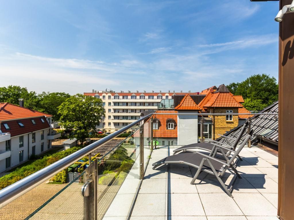 Nur 30 Meter zum Strand liegt die Penthouse Wohnung 11 in der Villa Höger. Zwei große Dachterrassen, die Sie vom Wohnbereich aus betreten, bieten Sonnenbaden zur Südseite oder Meerblick zur Seeseite. Die stilvoll möblierte Maisonetten Wohnung besitzt eine Wohnfläche von 80qm und bietet mit dem geräumigen Wohnbereich auf der oberen Ebene einen attraktiven Wohn-Essbereich mit zwei behaglichen Sofas, Ruhesessel, Esstisch, Flatscreen-TV, DVD, Musikanlage. Den Internetzugang über WLAN können Sie kostenfrei nutzen. Mit viel Komfort verwöhnt die integrierte Küchenzeile mit Ceranfeldherd, Backofen, Mikrowelle, Kühlschrank mit Gefrierfach, Espressomaschine, Toaster usw. Selbstverständlich ist auch ein Geschirrspüler vorhanden.