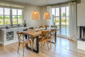 Das sehr komfortable Reetdachhaus Groß Schwansee ist ein ideales Ferienhaus für Gäste, die mit ihrem Hund Urlaub in naturnaher Umgebung verbringen möchten. Nach einem gemütlichen Spaziergang erreichen Sie in 1100 Meter den Natur Badestrand. Einige Strandzugänge in der Umgebung sind saisonabhängig auch für Hundes ausgewiesen. Auf einer Wohnfläche von 133qm bietet das exklusive 4- Zimmer Feriendomizil für bis zu 6 Personen einen einladenden Wohn-Essbereich mit Kamin, Sofalandschaft, Smart-TV, Musikanlage sowie einen großzügigen Esstisch mit Blick auf die saisonal möblierte Terrasse. WLAN nutzen Sie kostenfrei. Die hochwertige Küchenzeile ist offen in den Wohnbereich integriert und voll ausgestattet mit Ceranfeldherd, Backofen, Kühlschrank mir Gefrierfach sowie Mikrowelle, Geschirrspüler und Kaffeemaschine, Toaster uvm. Zudem befinden sich im Erdgeschoss ein modernes Tageslichtbad und eine Sauna. Das Obergeschoss ist über eine Holztreppe erreichbar.