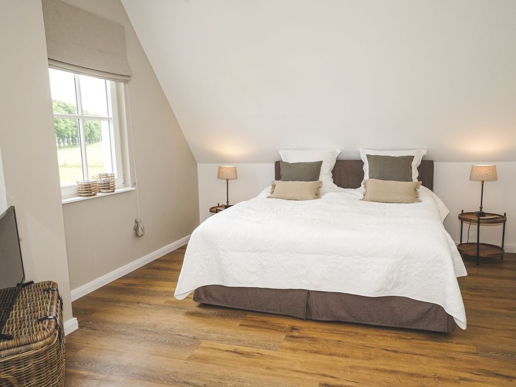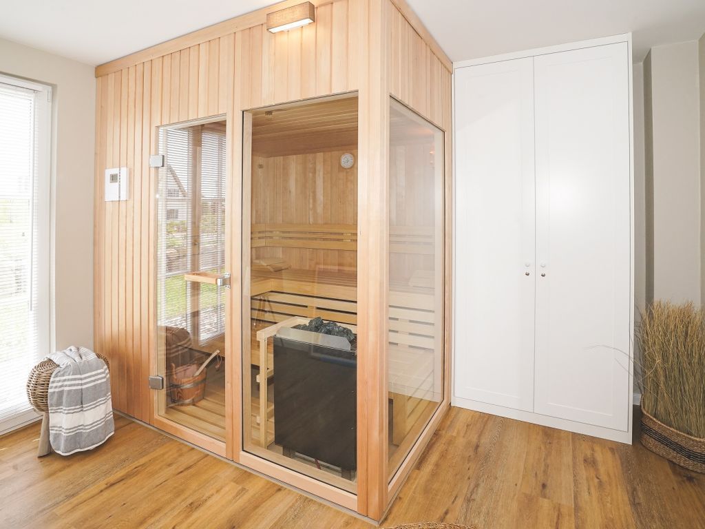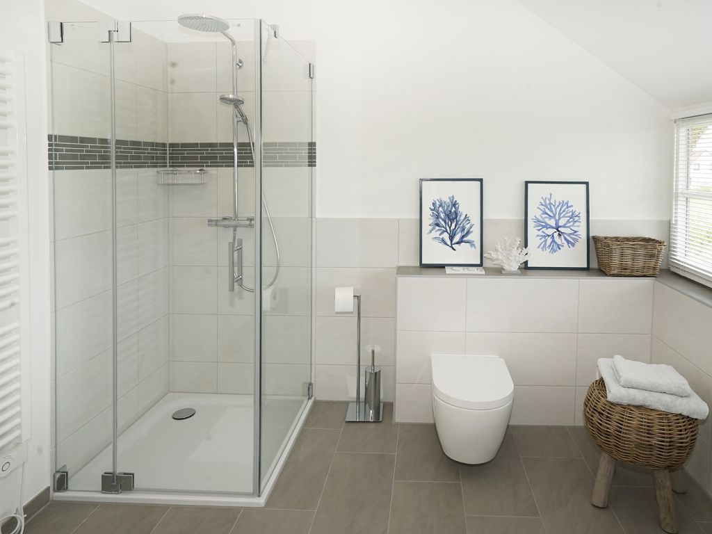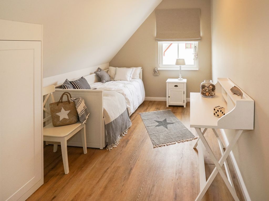 Hier befinden sich drei separate Schlafzimmer 2x mit ausziehbarem Einzelbett und Kleiderschrank, 1x mit Doppel Boxspringbett sowie SMART ? TV, Kleiderschrank und Sitzecke. Ein zweites Badezimmer mit Dusche und Badewanne befindet sich ebenso im Obergeschoss des Hauses. Das gesamte Haus ist mit einer Fußbodenheizung ausgestattet.