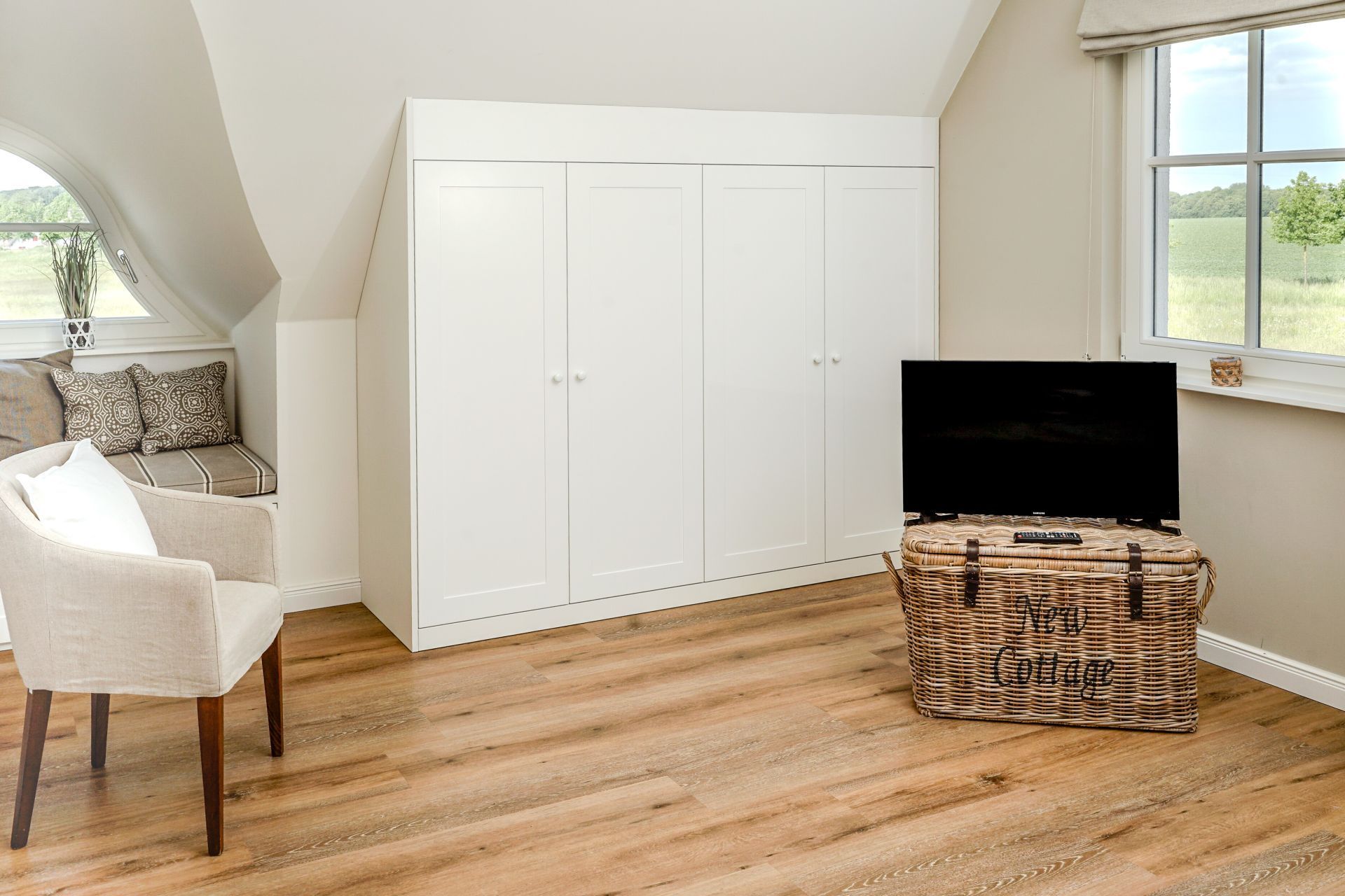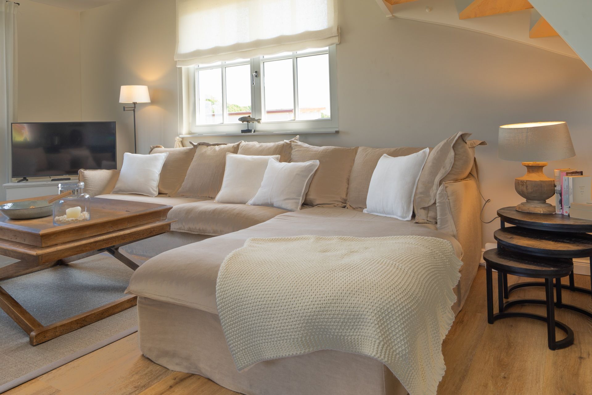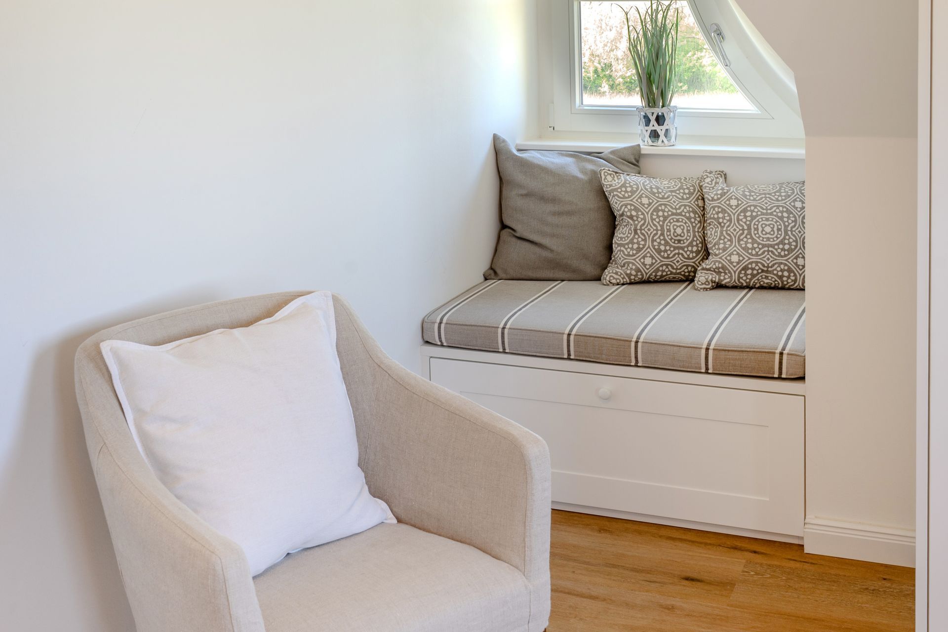 Hier befinden sich drei separate Schlafzimmer 2x mit ausziehbarem Einzelbett und Kleiderschrank, 1x mit Doppel Boxspringbett sowie SMART ? TV, Kleiderschrank und Sitzecke. Ein zweites Badezimmer mit Dusche und Badewanne befindet sich ebenso im Obergeschoss des Hauses. Das gesamte Haus ist mit einer Fußbodenheizung ausgestattet.