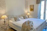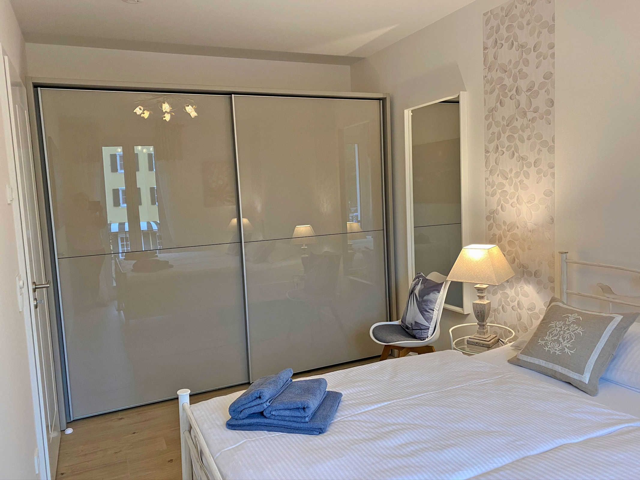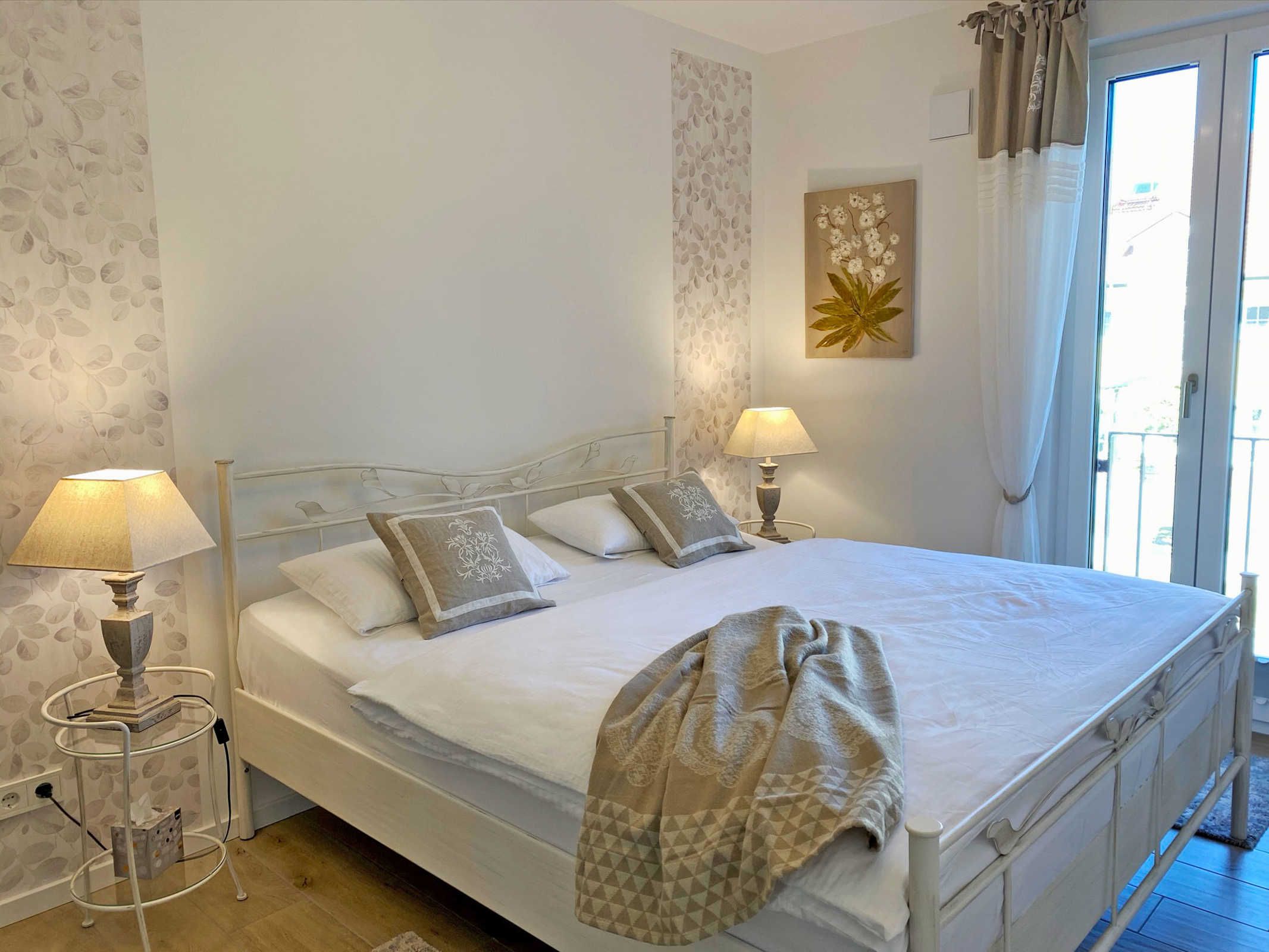 Das stilvolle, romantische Schlafzimmer ist mit einem edlen französischen Metallbett eingerichtet. Ein acht cm hoher durchgängiger Topper schafft ideale Voraussetzungen für komfortablen Schlaf. In diesem kuschligen Ambiente erleben Sie süße Träume und gleichzeitig erholsame Nächte. Ein geräumiger Kleiderschrank mit Schiebetüren bringt Struktur und Ordnung in Ihren Urlaubsalltag.