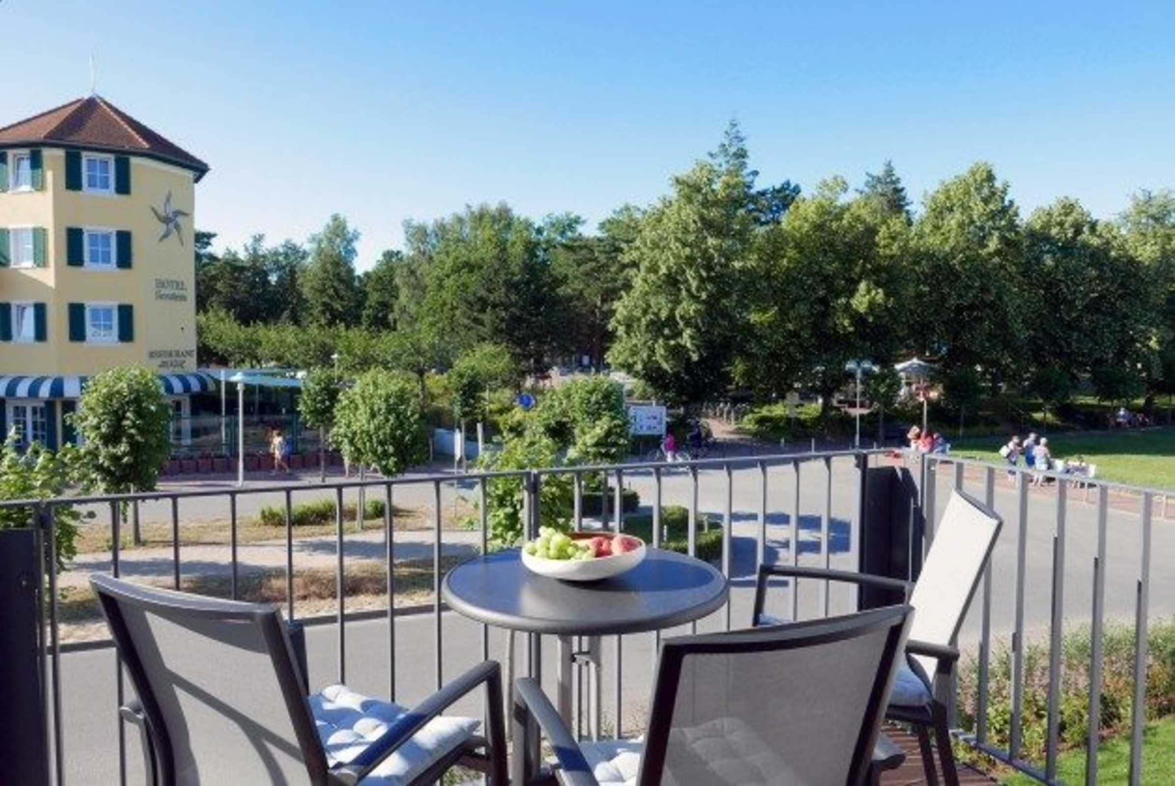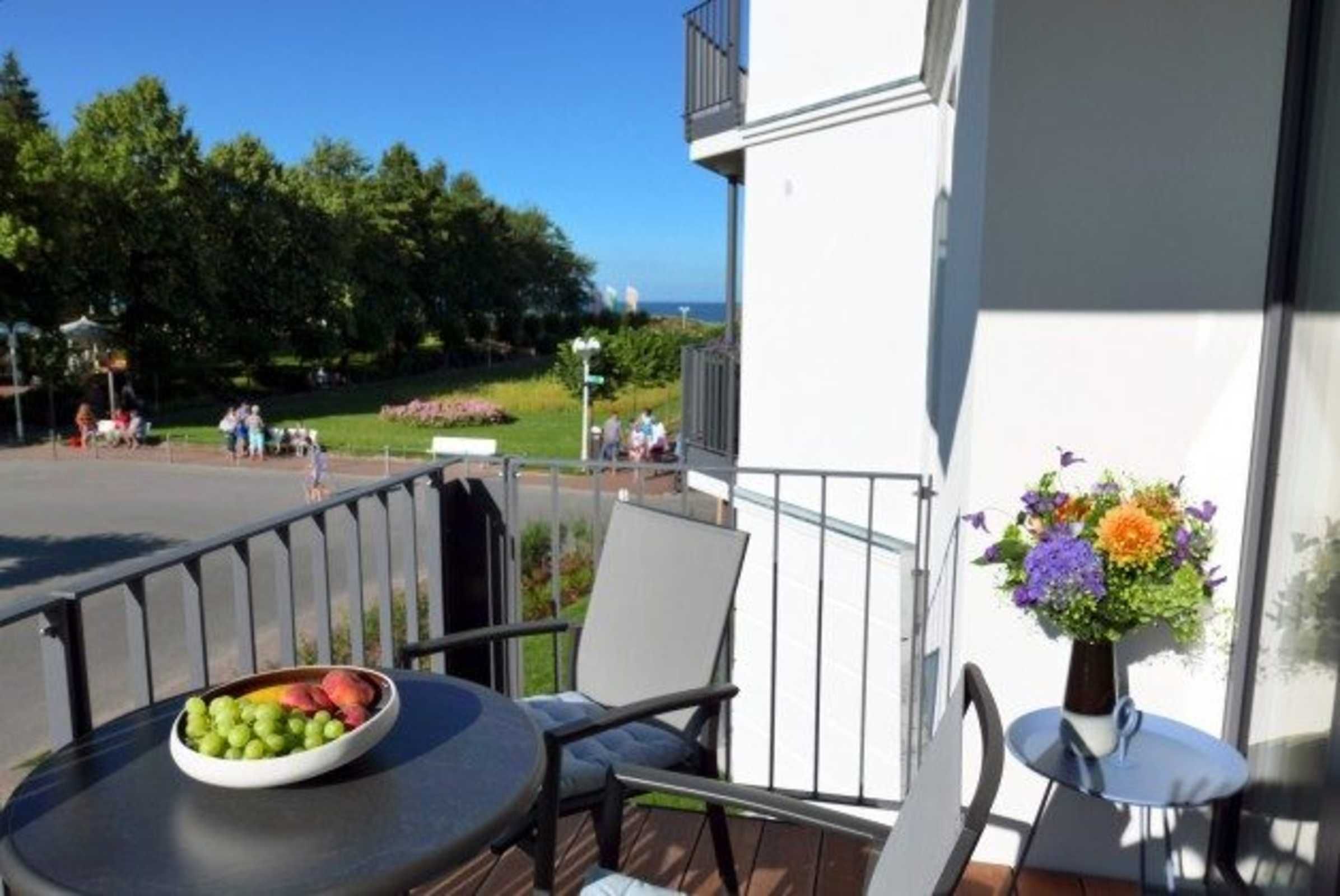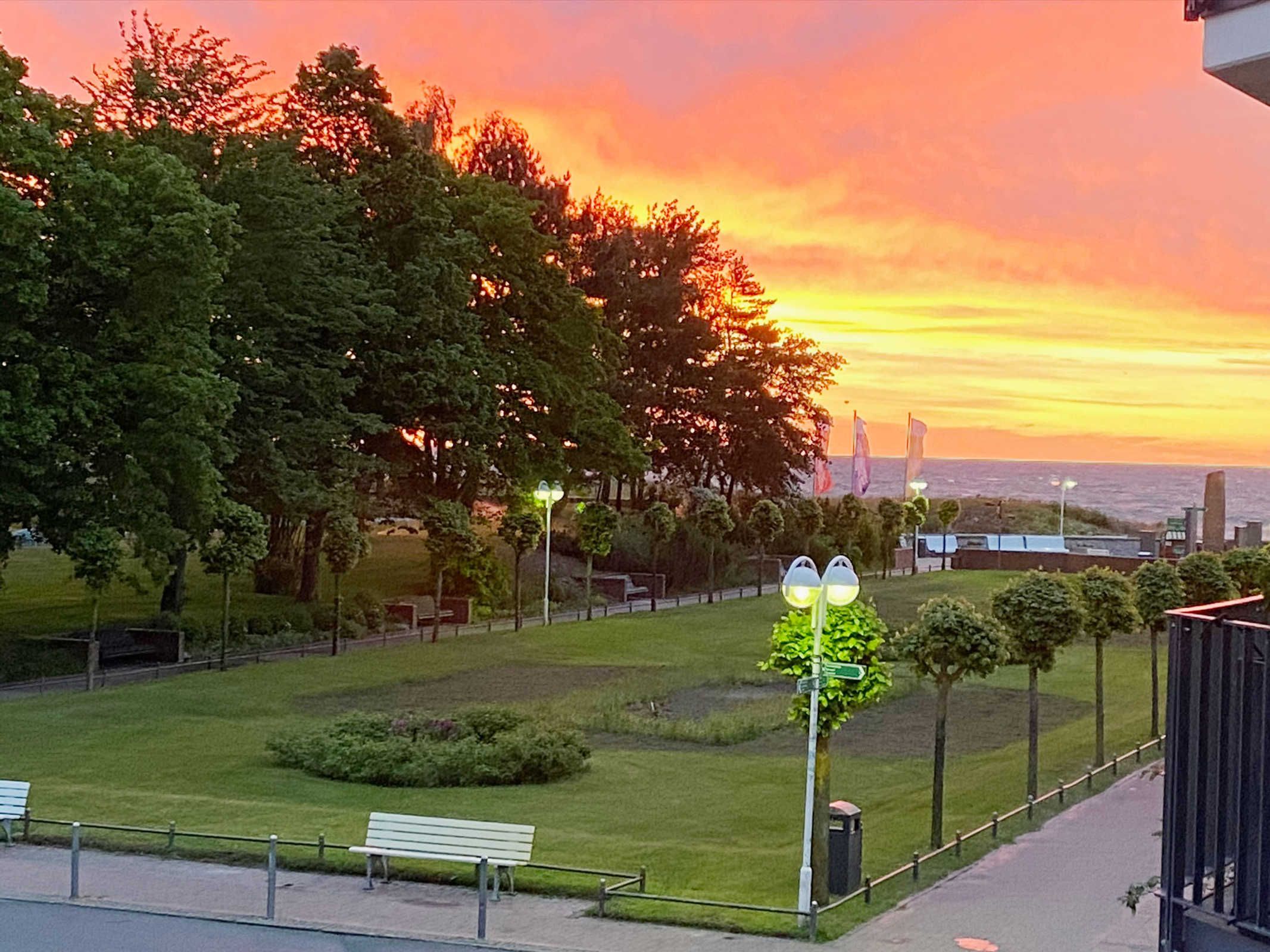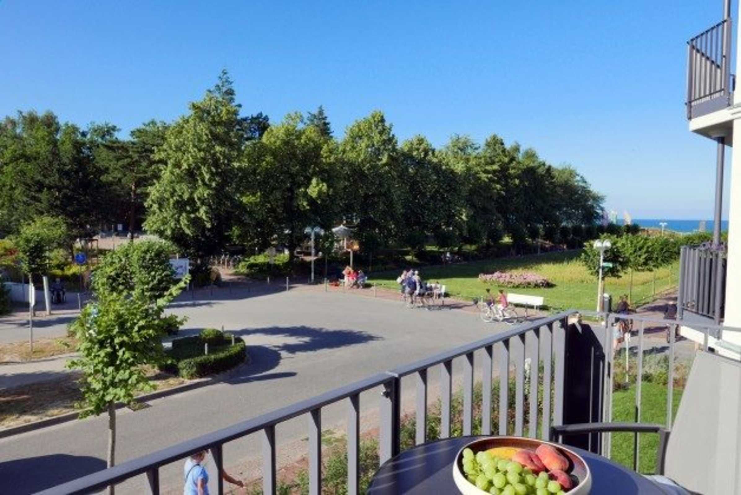 Betritt man den Balkon erscheint auf der einen Seite ein wunderschöner idyllischer Blick auf das Meer und den zu jeder Jahreszeit attraktiven Kurpark.