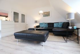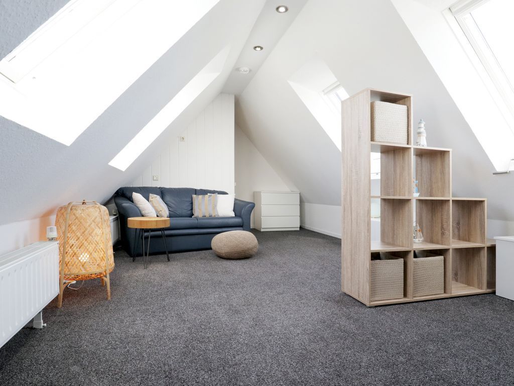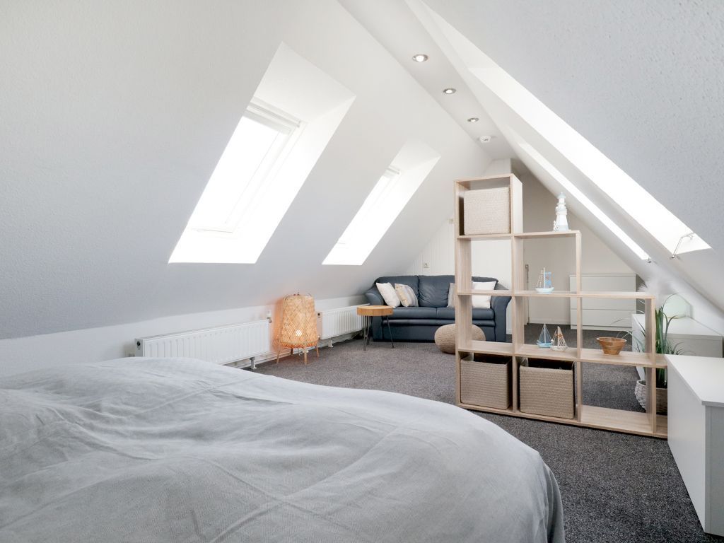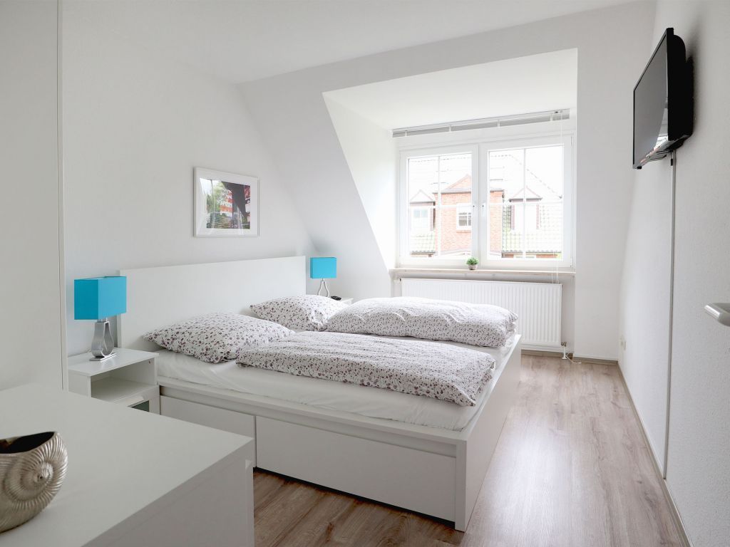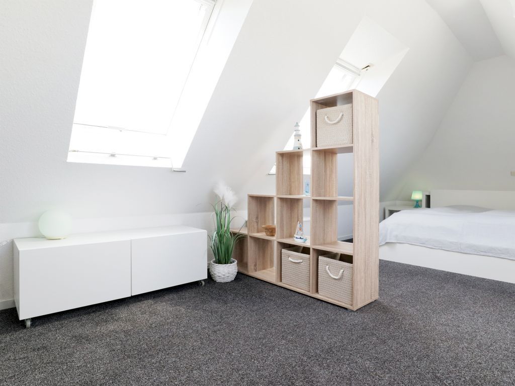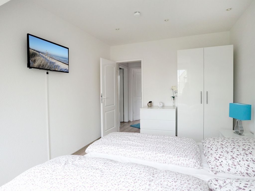 Das Ferienappartement besitzt 2 Schlafzimmer 1x mit Doppelbett, Kleiderschrank, Fernseher und 1x über eine Treppe erreichbar ein weiteres Schlafzimmer mit Doppelbett, Kommoden zudem eine Couch. Der obere Treppenteil ist mit einem ausziehbaren Treppenschutz versehen. Kinderspielzeug ist vorhanden. Des Weiteren ist auf der unteren Wohnebene ein geräumiges Badezimmer mit Tageslichtfenster und Regendusche mit Massagefunktion.