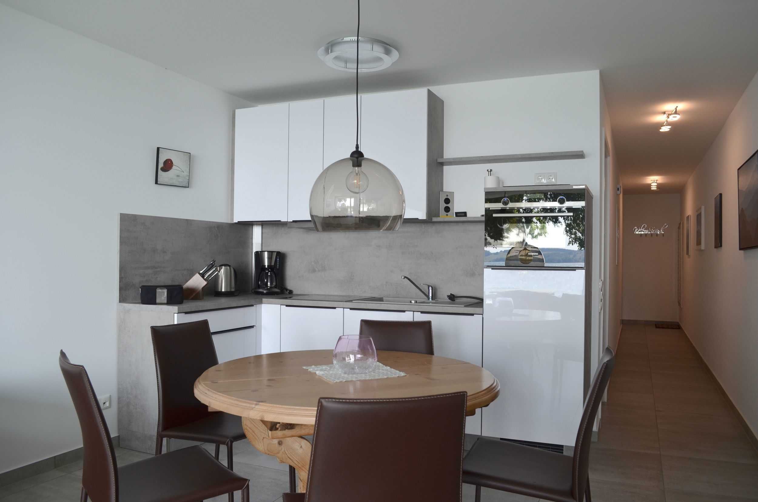 Der helle Wohnbereich bietet mit Smart-TV, einem stylischen Wohn- und einem gemütlichen Ess-Ensemble allen denkbaren Komfort. Die offene Küche ist mit allem ausgestattet, was das Herz begehrt, wie einem 4-Felder Induktionsherd, Backofen, Spülmaschine, Kaffeemaschine, Wasserkocher, reichlich Geschirr und Küchenutensilien. Schnelles, kostenfreies W-LAN sorgt trotz der wunderschönen Abgeschiedenheit dafür, dass Sie stets mit der Welt verbunden sind.