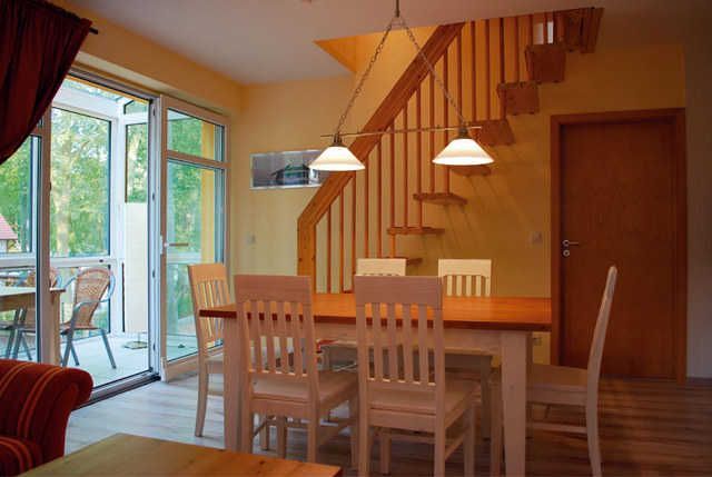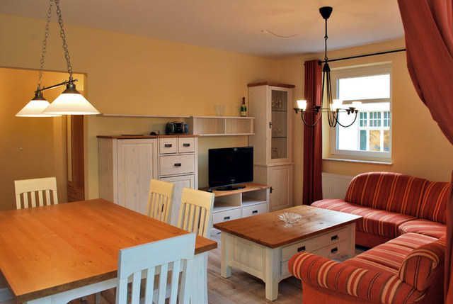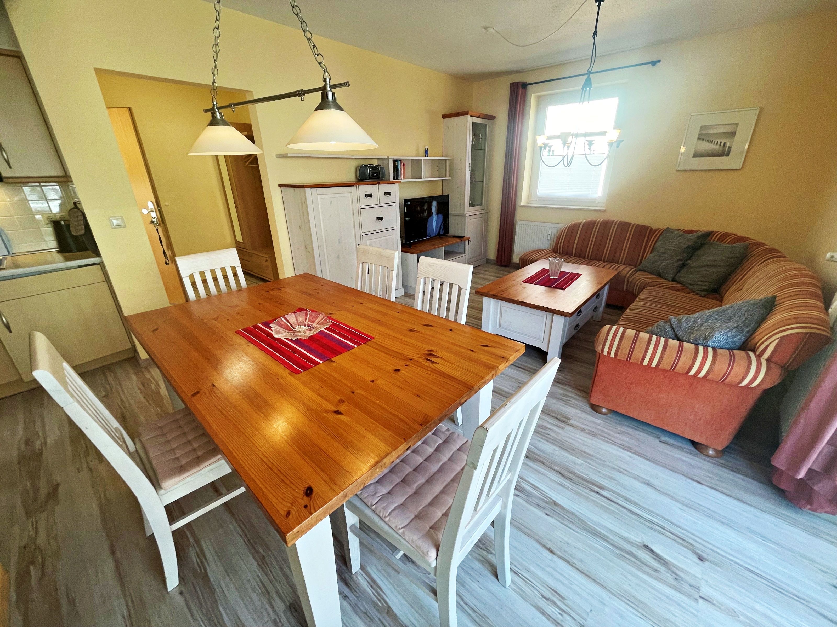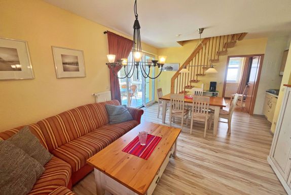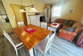 Das einladende Wohnzimmer ist mit einer gemütlichen Sitzgarnitur, einem Flachbild-TV und einem CD-Radio ausgestattet. Zudem erwartet Sie eine kleine Küchenzeile mit Elektroherd, Kühlschrank und Mikrowelle, die Ihnen das Zubereiten von Mahlzeiten erleichtert. Genießen Sie Ihr Frühstück im angrenzenden Wintergarten oder lassen Sie den Abend bei einem Glas Wein in entspannter Atmosphäre ausklingen. Das erste Schlafzimmer bietet Ihnen ein komfortables Doppelbett, während das zweite Schlafzimmer im Obergeschoss mit einer Schlafcouch und einem Einzelbett ausgestattet ist - ideal für Familien oder kleinere Gruppen. Das Tageslicht-Bad verfügt über eine Dusche und WC, sodass Sie sich rundum wohlfühlen können. Ein Pkw-Stellplatz steht Ihnen auf dem umzäunten Grundstück zur Verfügung. Für zusätzlichen Komfort können Sie gegen Entgelt eine Waschmaschine sowie einen Wäschetrockner im Objekt nutzen. Wenn Sie möchten, können Sie die Erstausstattung Bettwäsche und Handtücher bereits bei der Buchung für nur 17,50 € pro Person hinzubuchen.