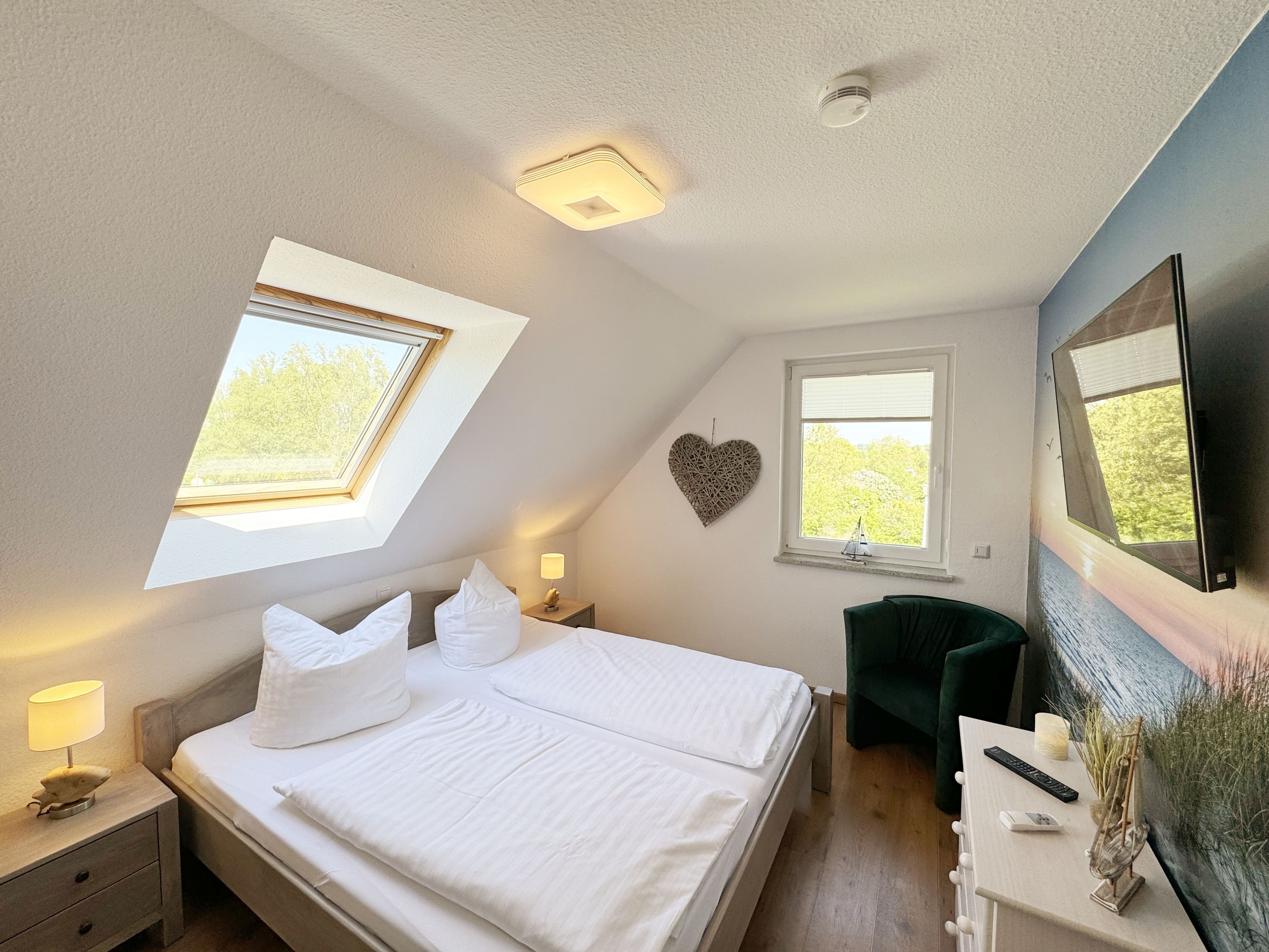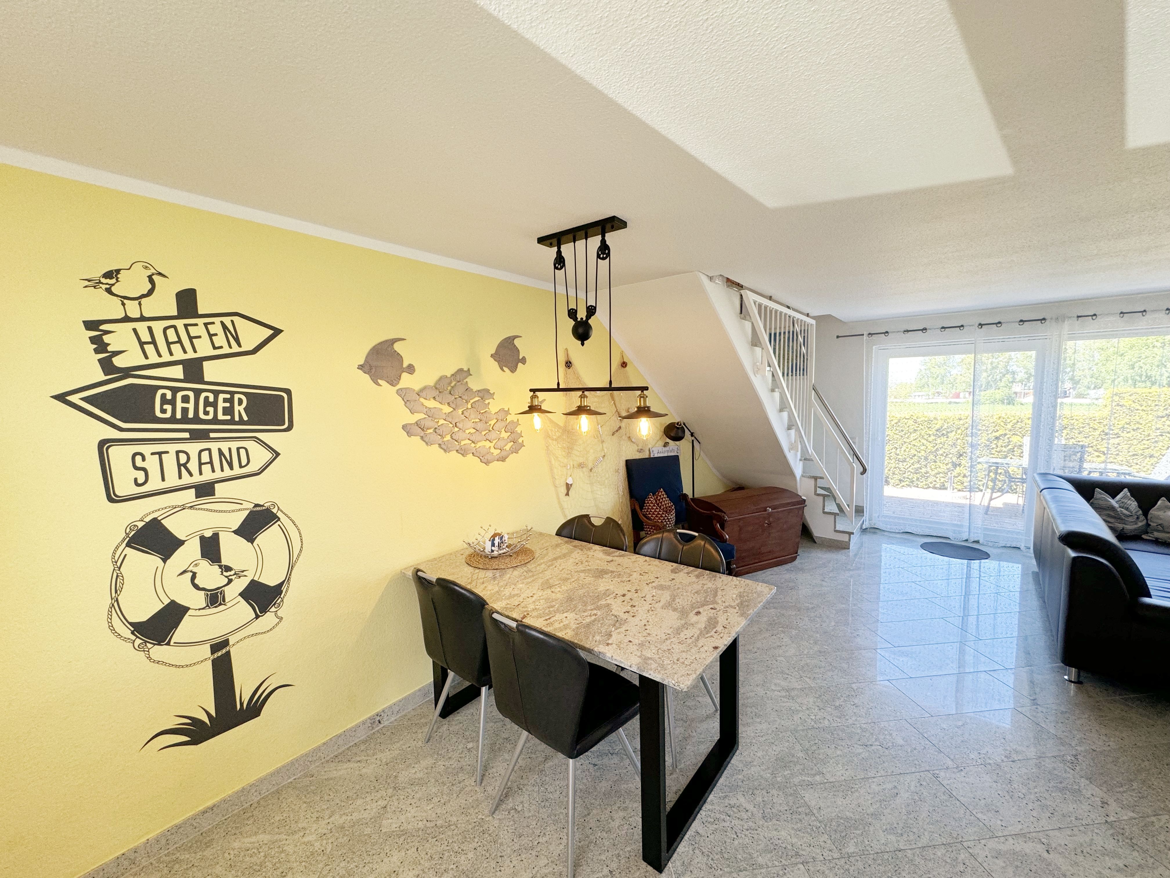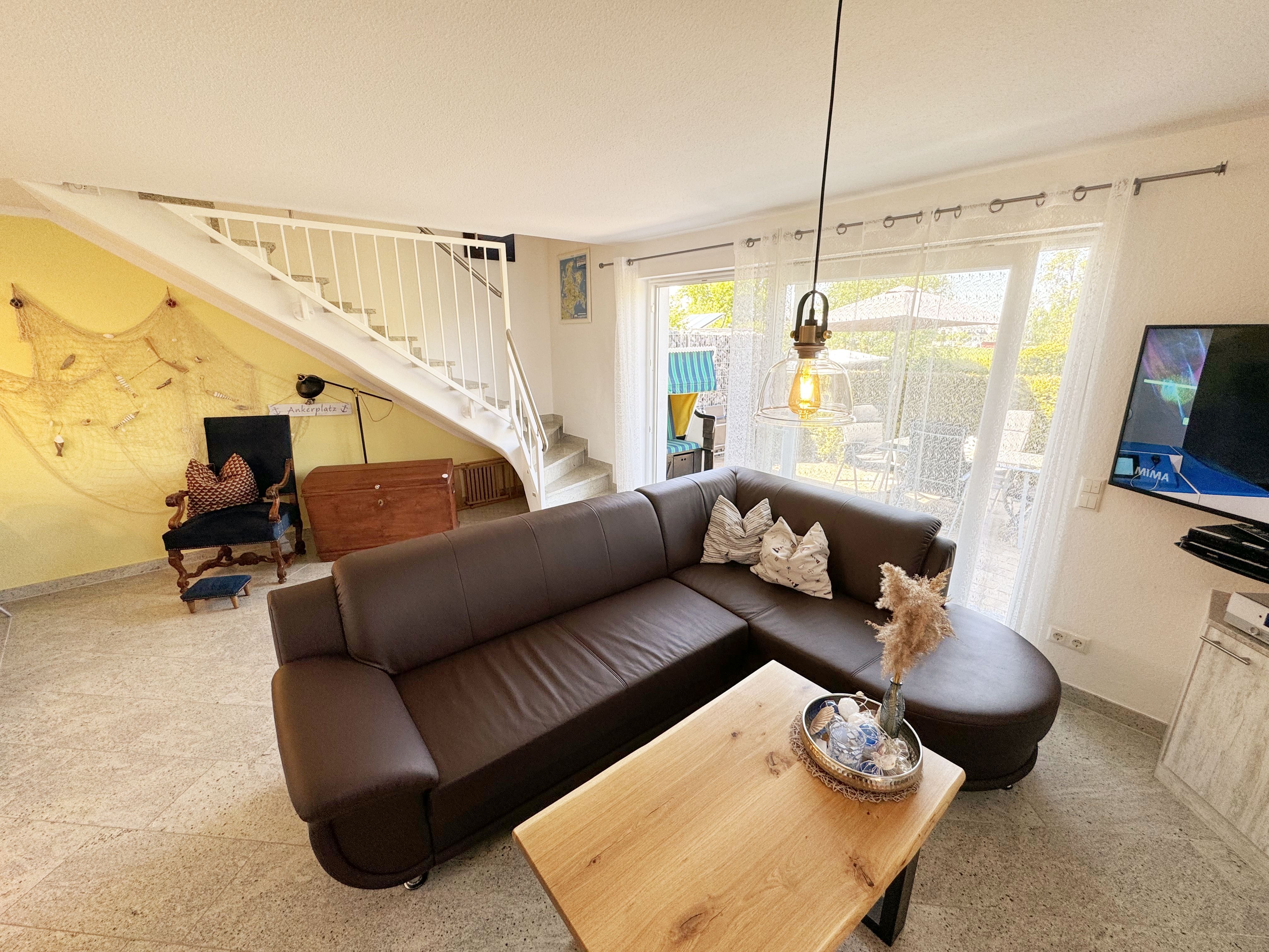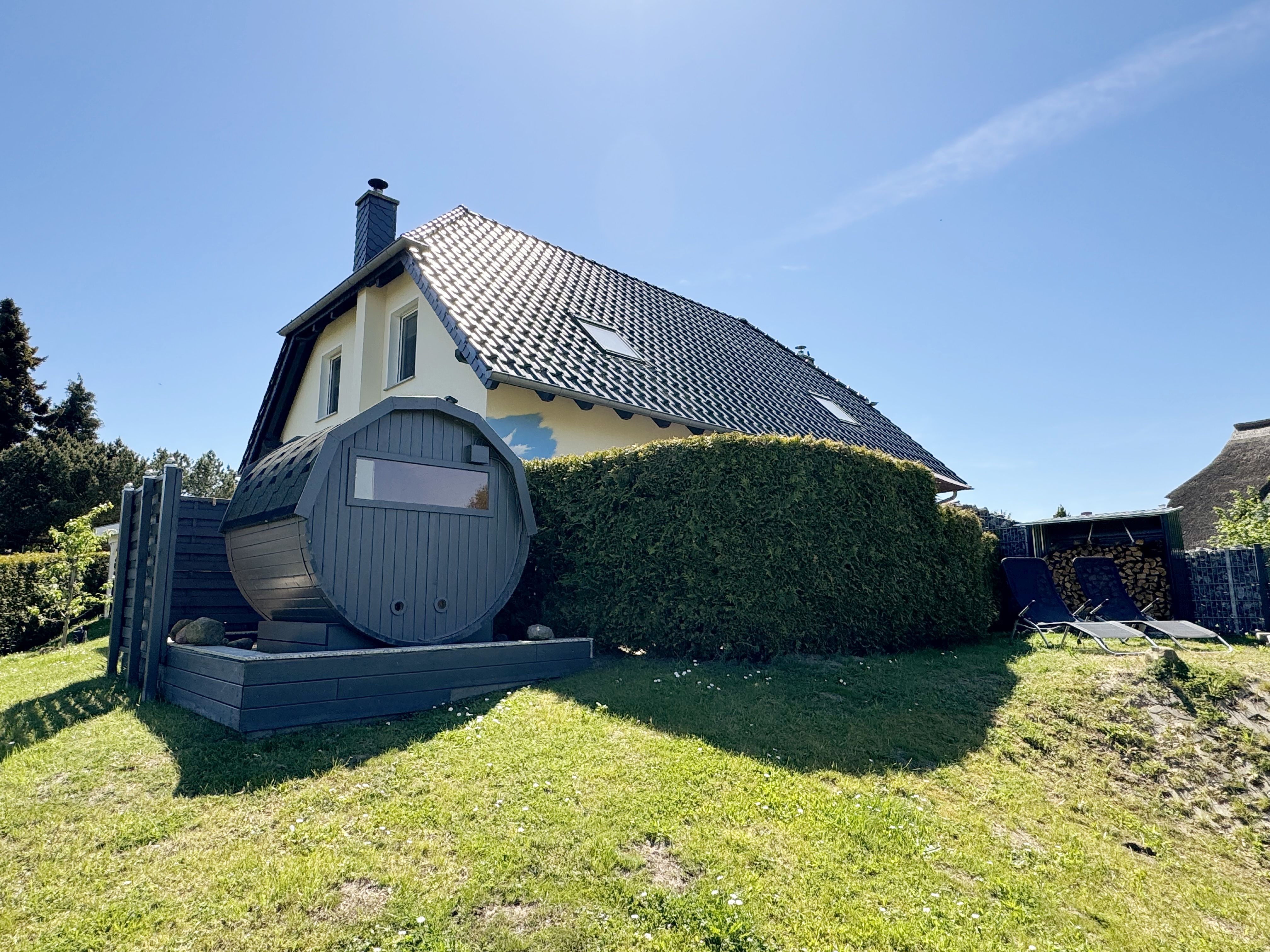 Die Doppelhaushälfte Meeresbrise ist mit Ihren ca. 75 m² großzügig geschnitten und bietet ausreichend Platz für bis zu 5 Personen. Die Unterkunft (Nichtraucher) ist auf 2 Ebenen verteilt und verfügt zusätzlich über eine Terrasse mit Bestuhlung, Sonnenschirm, Strandkorb und einem Weber Kugelgrill. Im Erdgeschoss verfügt die Doppelhaushälfte Meeresbrise über einen großen Wohn/Essbereich mit einem Esstisch für 5 Personen, eine gemütliche Couch, Smart-TV mit Sky (Auswahl von Sport, Film, Dokumentation), Blu-Ray-Player, DAB-Radio und direkten Zugang über die Schiebetür auf die Terrasse. Auch im Urlaub müssen Sie nicht auf einen Internetanschluss (WLAN) verzichten. Die in dem Wohnbereich integrierte Küchenzeile verfügt über einen Backofen mit Umluft, Ceranfeld, Mikrowelle, Kühlschrank mit Gefrierfach, Geschirrspüler, Spüle, Kaffeemaschine, Toaster, Wasserkocher, Eierkocher, Brotschneidemaschine, Bosch Tassimo Maschine, Heißluftfriteuse und weitere diverse Küchenutensilien. Für die kältere Jahreszeit sorgt ein Kaminofen für gemütliche Abende. Ein Gäste-WC befindet sich im Erdgeschoss. Über die Treppe erreichen Sie das Obergeschoss, wo sich 2 Schlafzimmer, ein Duschbad und ein Wirtschaftsraum mit Waschtrockner, Bügelbrett und Bügeleisen befinden. Das 1. Schlafzimmer verfügt über ein Doppelbett (1,80m x 2,00m), Smart-TV, Kleiderschrank & Kommode sowie einen Relax-Sessel. Das 2. Schlafzimmer ist mit einem Einzelbett (0,90m x 2,00m), einem Tandembett (Einzelbett mit Ausziehfunktion je 0,90m x 2,00m), Flachbild-TV, einer Kommode und einem Kleiderschrank ausgestattet. Das großzügig gestaltete Bad verfügt über eine Glasrunddusche, Handtuchtrockner, Waschtisch, Spiegelschrank, Fön und WC. Das gesamte Haus ist mit einer Fußbodenheizung ausgestattet und mit Granit (außer die Schlafzimmer) gefliest. Alle Fenster können durch elektrische Außenrollos abgedunkelt werden, rundherum sind Insektenschutzgitter installiert. Ein PKW-Stellplatz befindet sich direkt am Haus sowie eine Ladestation für Elektrofahrzeuge (kostenpflichtig). Die überdachte Fahrradunterstellmöglichkeit für max. 4 Fahrräder befindet sich am Gartenhaus. Auf der Wiese ist eine Wäschespinne für Sie aufgestellt. Von der Terrasse mit Strandkorb aus, können Sie den Tag bei einem Gläschen ausklingen lassen und wunderschöne Sonnenuntergänge in Richtung Hafen genießen. An kühleren Tagen steht Ihnen eine neue Fasssauna zur Verfügung. Für unsere kleinen Gästen stehen 1 Kinderbett sowie 1 Hochstuhl inklusive zur Verfügung. Auf dem eingezäunten Grundstück sind max. 2 Haustiere (kniehoch, keine Katzen) gegen eine Extragebühr erlaubt. Die Erstausstattung eines Wäschepaketes (komplette Bettwäsche, 1 Duschhandtuch, 1 kleines Handtuch) können Sie bis 14 Tage vor Anreise gegen einen Aufpreis dazu buchen oder durch Eigenes ergänzen. Ab 2 gebuchten Paketen erhalten Sie einmalig 1 Geschirrhandtuch und 1 Duschvorleger hinzu.