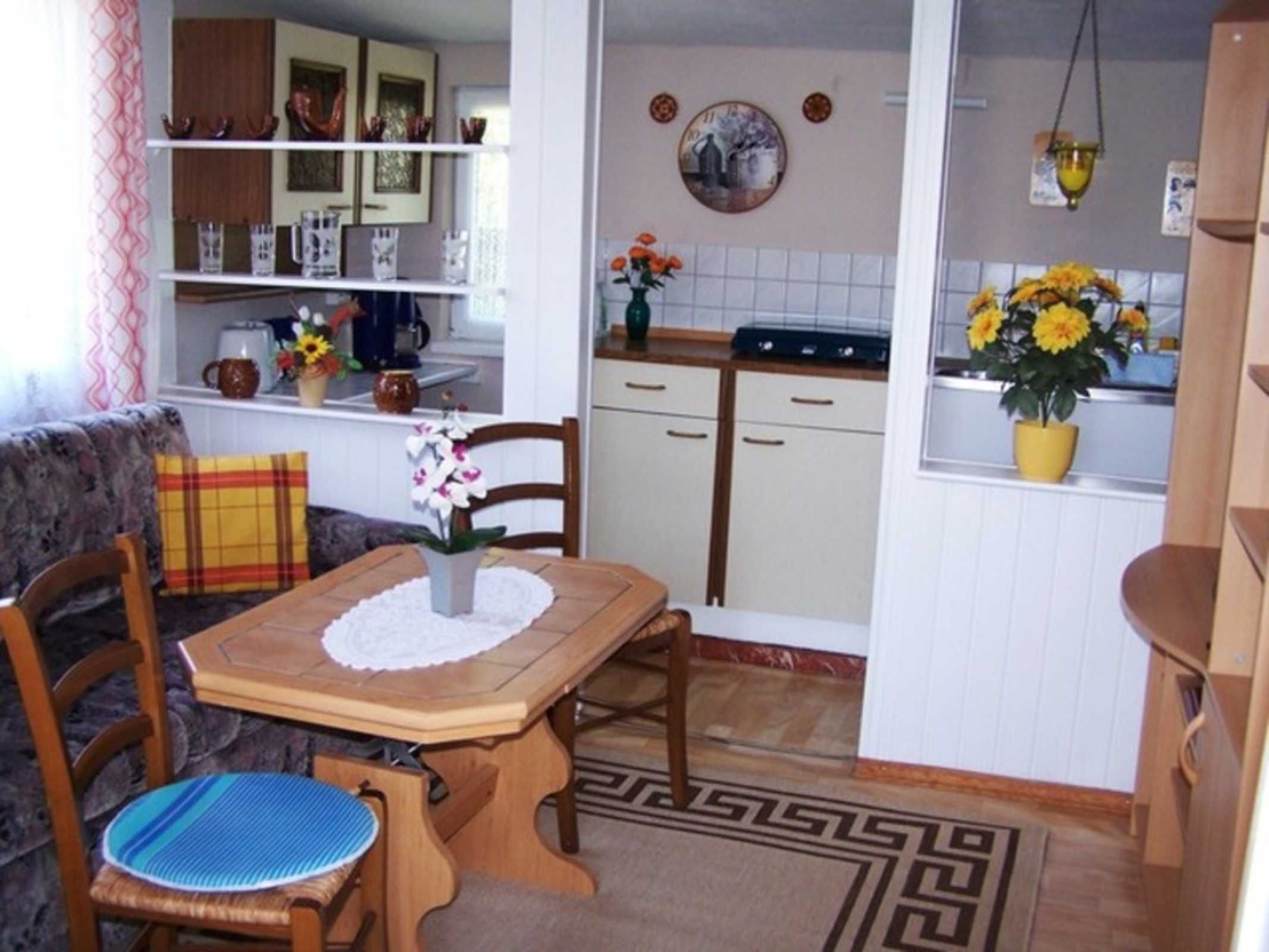 Der Bungalow ist für 2 Personen (Deckenhöhe ca. 2 m) ausgestattet und besteht aus einem Schlafzimmer mit Doppelbett, einem Wohnzimmer mit Sitzecke, TV und Pantryküche(Wasserkoche, Kaffeemaschine,2 Plattenherd usw.) und Dusche & WC.