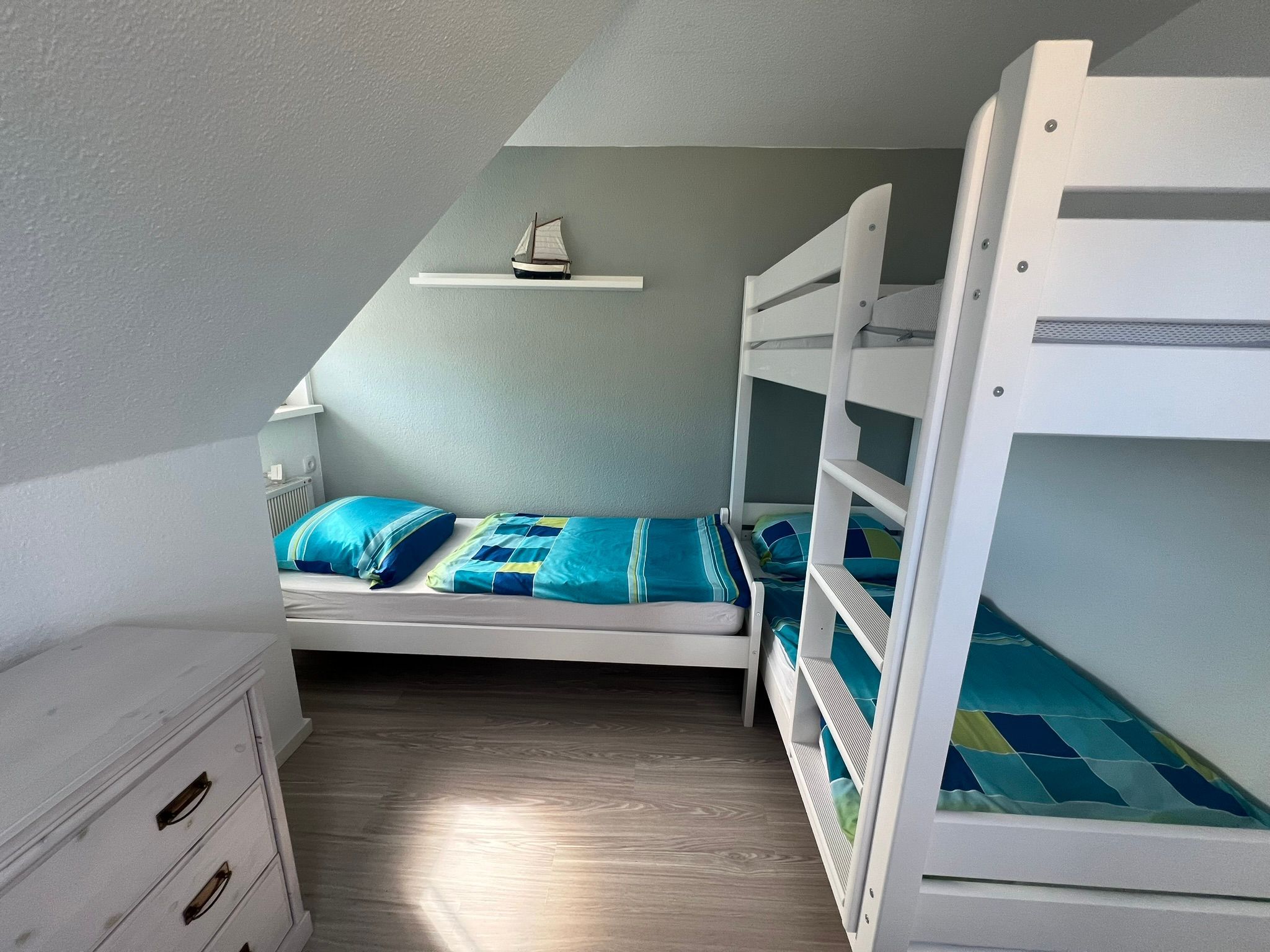 1 Schlafzimmer mit Doppelstockbett (je ca. 0,90 m x 1,90 m) und einem Einzelbett (ca. 0,90 m x 2,00 m)
