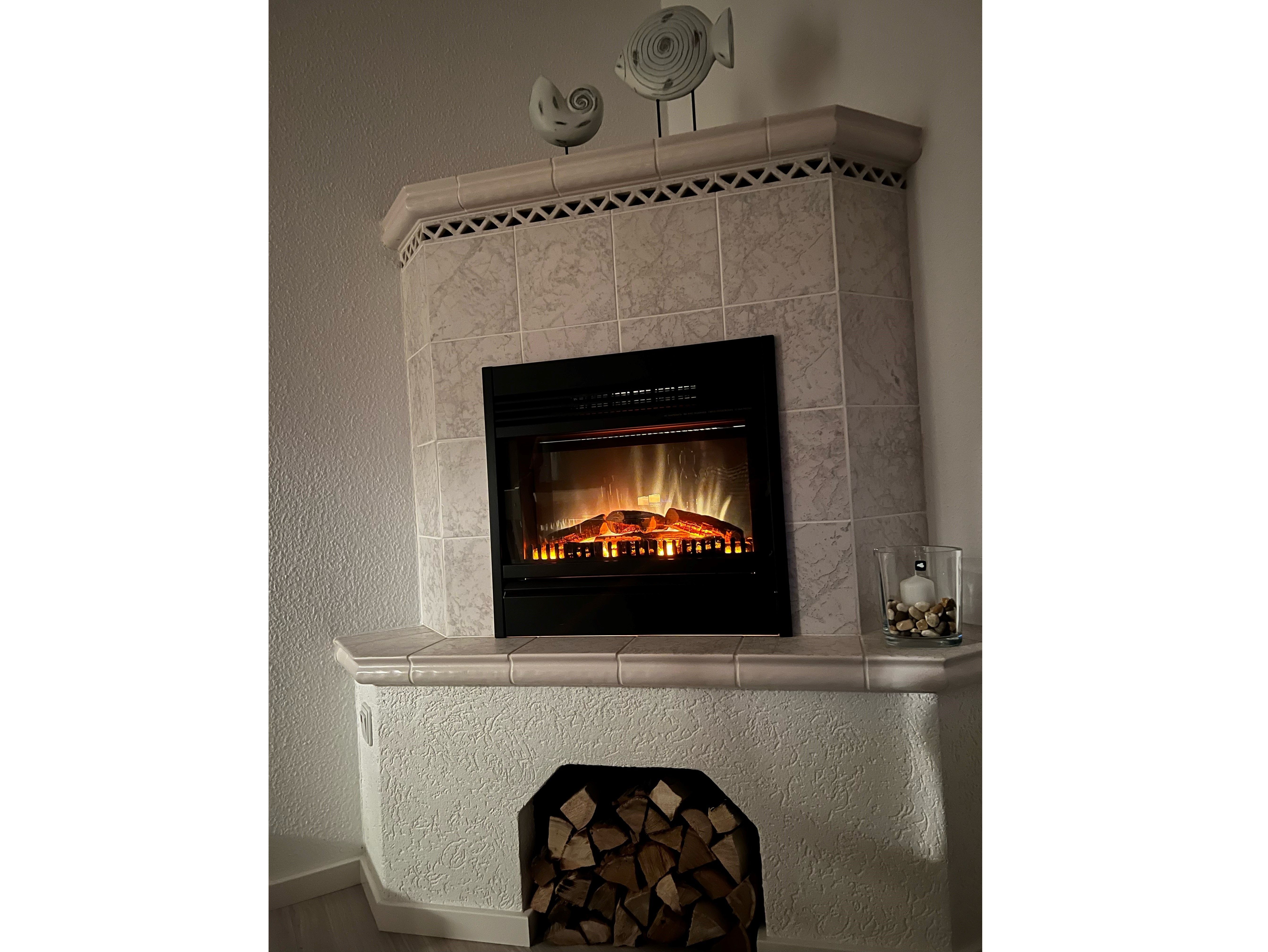 Wohnraum mit Flachbild-TV mit ca. 80cm Bilddiagonale, Esstisch für 7 Personen, Radio, elektrischem Kamin (Elektroheizung)