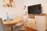 Die Nichtraucher-Ferienwohnung liegt im Erdgeschoß (nur 1 Stufe) eines Stadthauses. Sie verfügt über ein modern-komfortabel eingerichtetes Wohnzimmer mit Laminatboden, großzügiger Couchecke (mit Schlaffunktion), Kommode mit Flachbild-TV sowie Essgarnitur. Das Schlafzimmer besticht durch seinen Ausblick auf den Kirchturm der Marienkirche und ist mit Laminat, Doppelbett (2 getrennte Matratzen 0,90 x 2,00m) mit Topperauflagen und Kleiderschrank ausgestattet. Bettwäsche und Handtücher sind in der Erstausstattung im Preis enthalten. Zusätzliche Bandscheibenkissen liegen bereit.