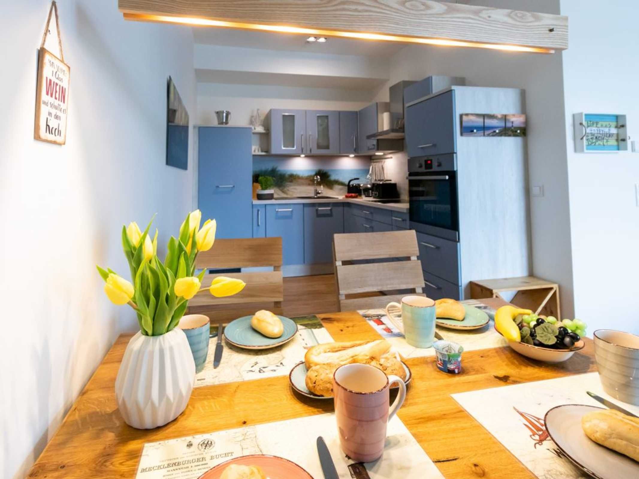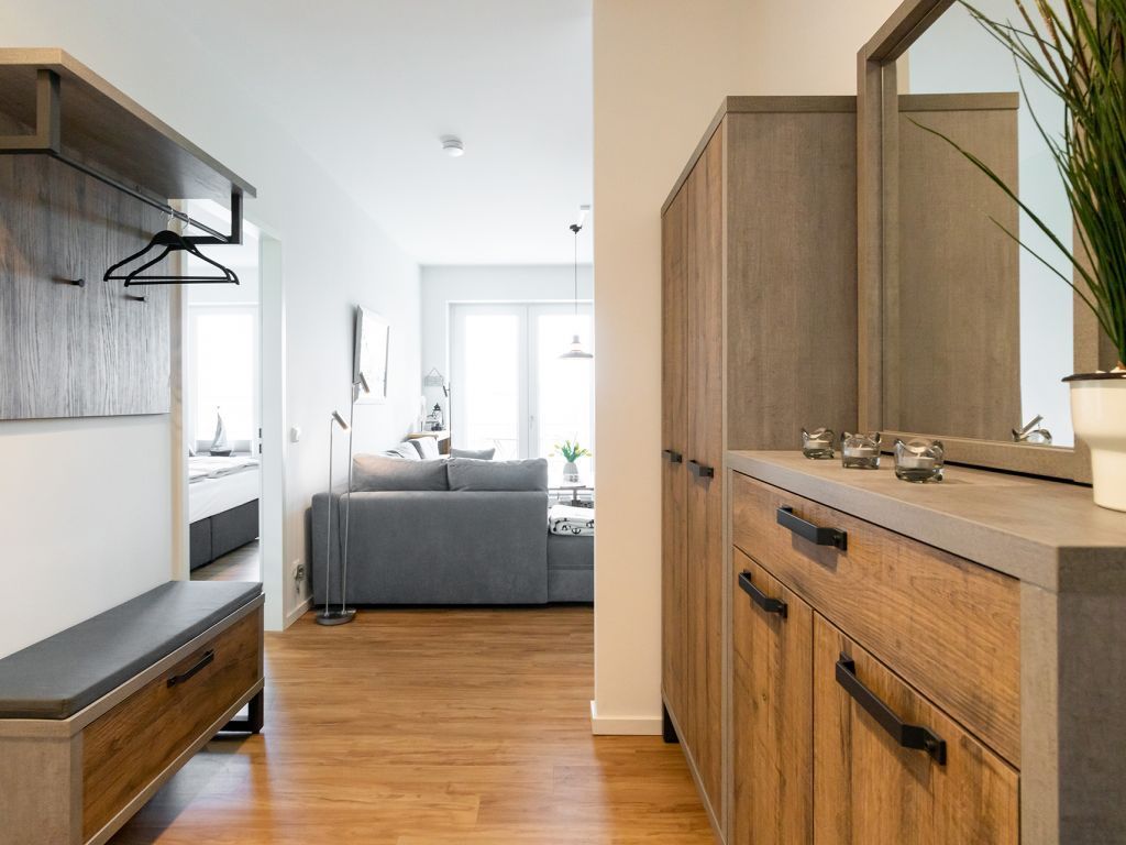 In diesem charmanten 2-Zimmerferien-Appartement Hafenspitze 6, beginnt der Tag mit Aussicht auf die Ostsee und den Holzhafen. Sie bewohnen das 1. Obergeschoss, welches Sie mit dem Fahrstuhl erreichen. Auf einer Wohnfläche von 56qm empfängt Sie das hochwertig möblierte Appartement mit einem hellen Wohn-Essbereich, Sofa, Esstisch, Internetfernseher sowie Internetradio. Den Internetzugang über WLAN können Sie kostenfrei nutzen. Vom Wohnraum gelangen Sie auf den Balkon, der sich in Nachbarschaft zum restaurierten Ohlerich Speicher befindet. Eine Wohnungsbelegung ist mit bis zu 4 Personen möglich. Wenn Sie sich gerne selbst versorgen möchten, so steht Ihnen eine in den Wohnbereich integrierte, voll ausgestattete Küchenzeile mit Herd, Backofen, Mikrowelle, Geschirrspüler, Kaffeemaschine, Toaster, Wasserkocher usw. zur Verfügung.