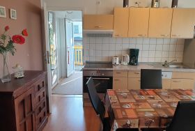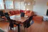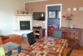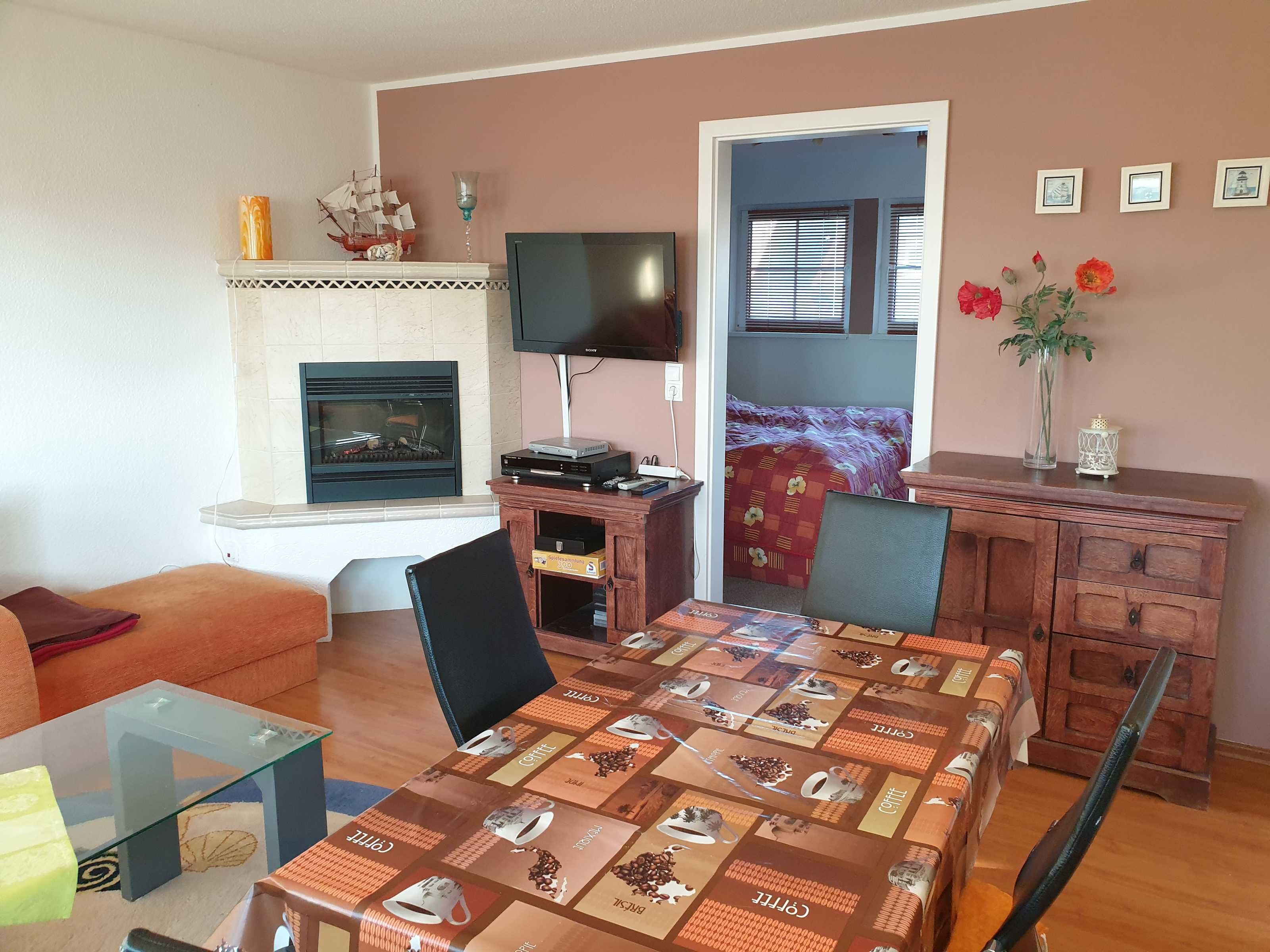Wohnraum mit Eck-/Schlafcouch, Esstisch, elektrischem Kamin, in allen Räumen Elektroheizung.