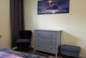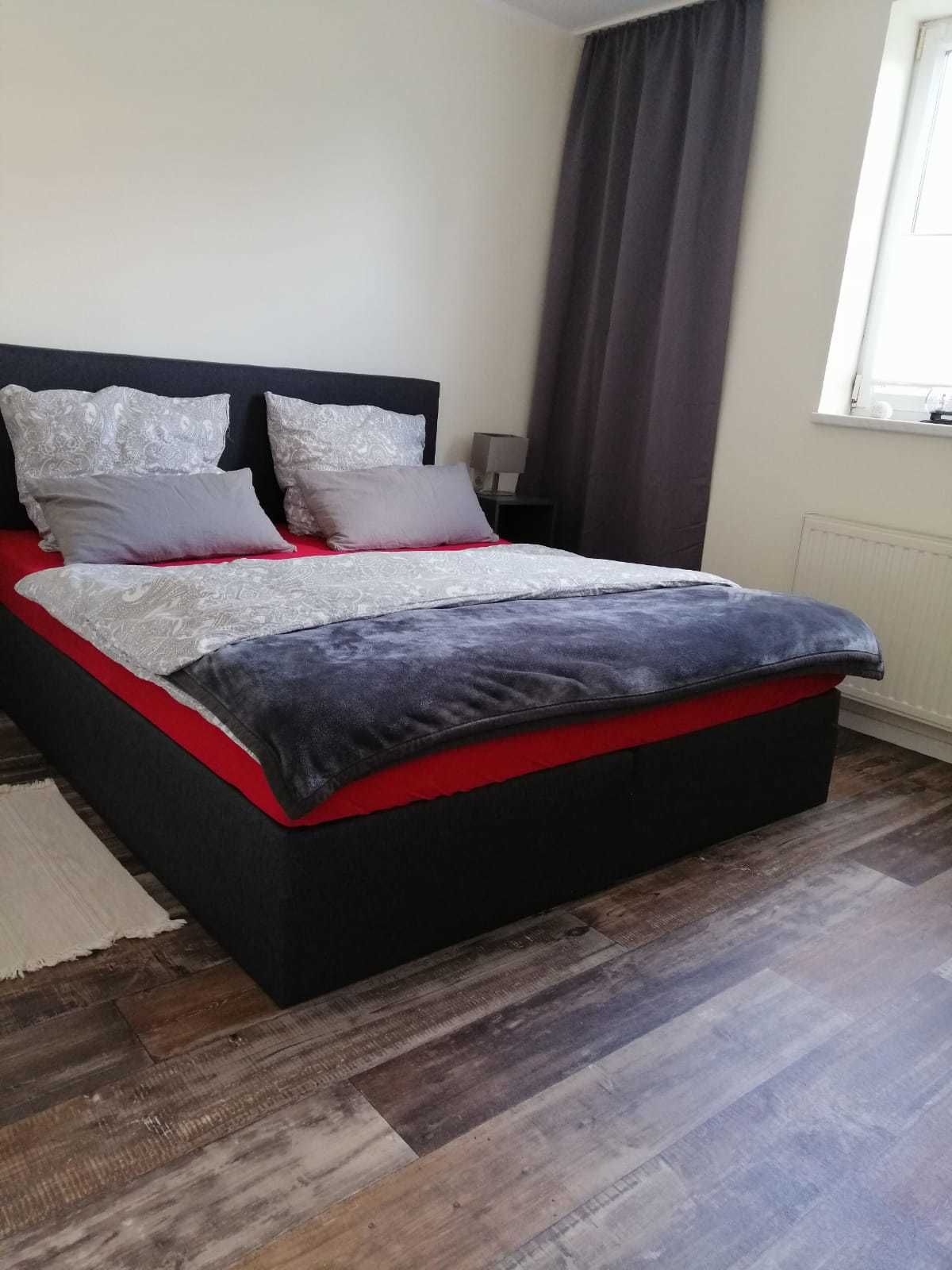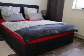 Im Schlafzimmer besteht, neben einem großen Boxspringbett, die Möglichkeit einer Aufbettung .