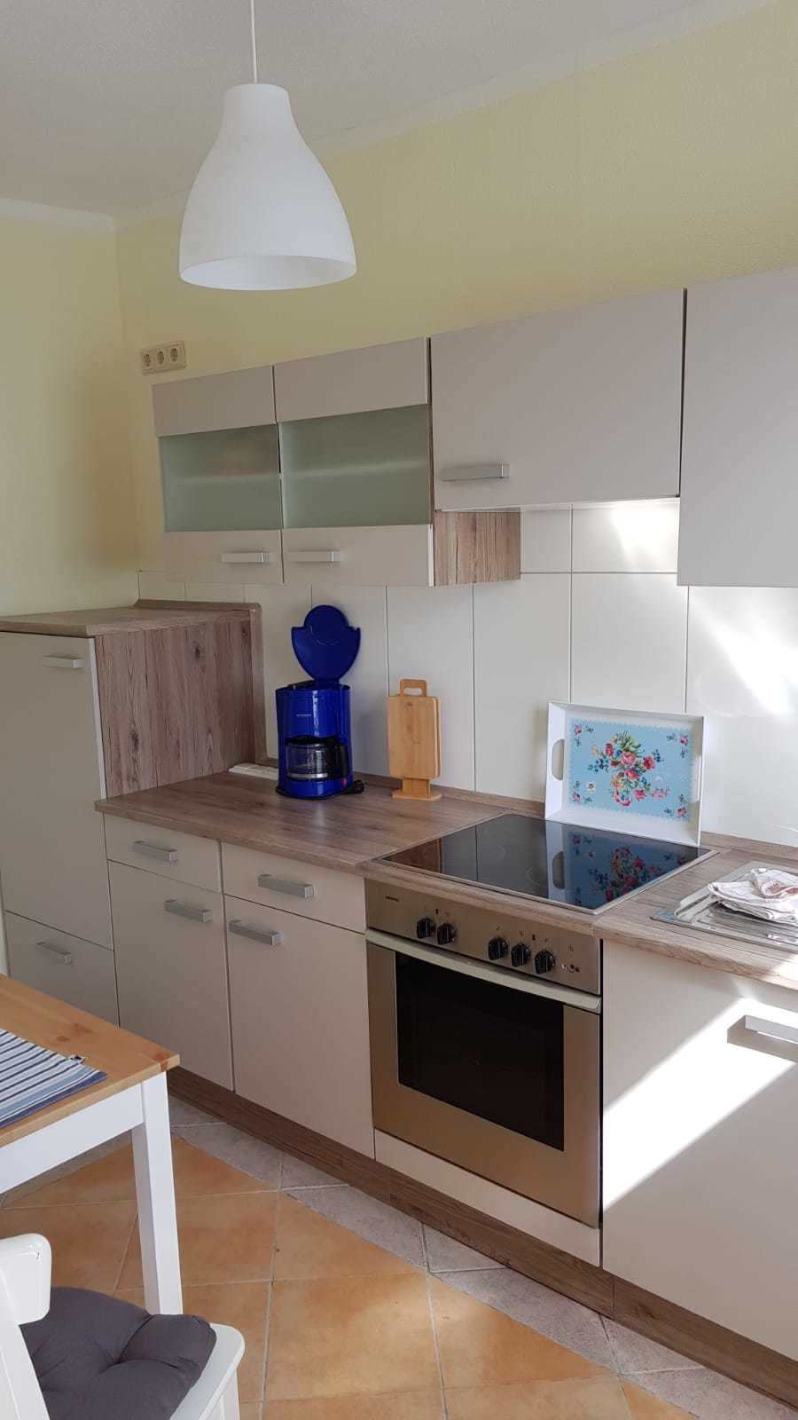 In der Küche gehören neben einer Kaffeemaschine, einem Toaster, einem Wasserkocher, einem Eierkocher, Mikrowelle, Ceranfeld mit Backofen, einem Kühlschrank auch eine gut sortierte Besteckschublade zur Ausrüstung.Geschirr,“Pött un Pann“ ebenfalls.