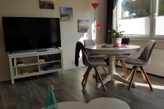 Im Wohnzimmer wartet ein großer Flachbildschirm und eine gemütliche Sitzgruppe auf ein Beisammensein bei Spiel und Spaß. 2 Aufbettungen sind auf dem Schlafsofa im Wohnzimmer möglich.