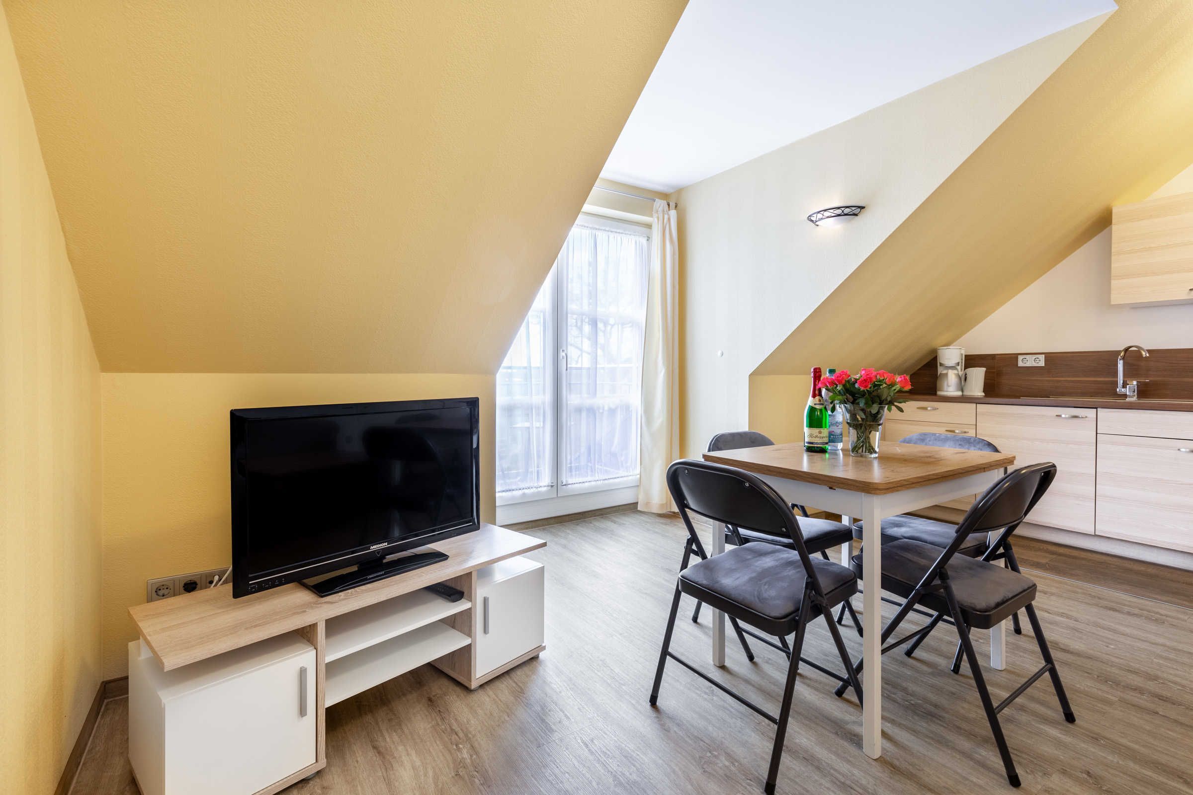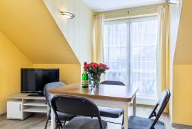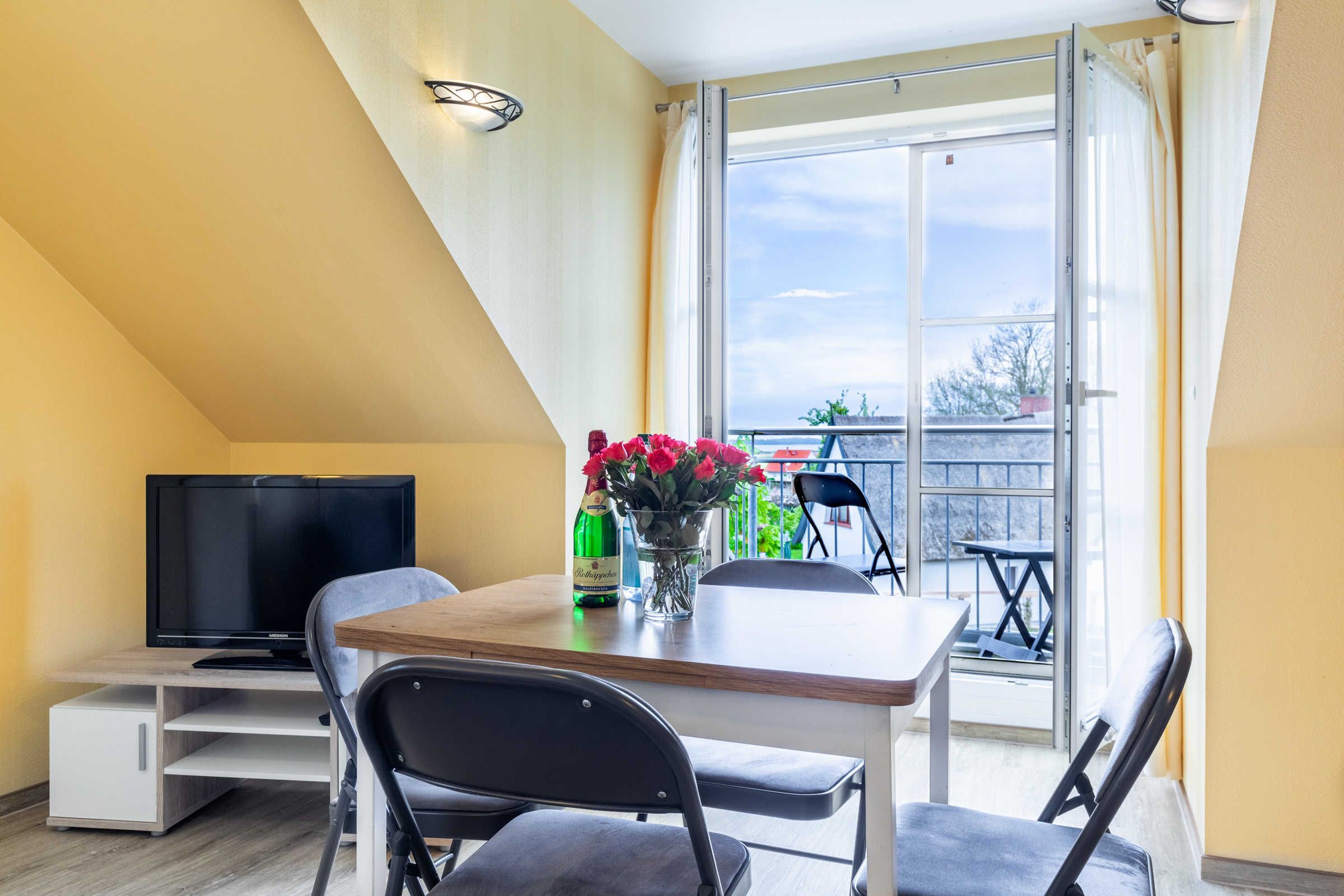 Die helle und gemütliche Ferienwohnung Hanna befindet sich im Obergeschoss des Ostseeferienhauses Drachenflieger. Die Ferienwohnung verfügt über ein separtes Schlafzimmer mit Doppelbett und Kleiderschrank, einen Wohn- Essbereich mit umfangreich ausgestatteter Küchenzeile (Kühlschrank mit Gefrierfach, 4- Platten- Herd, Backofen, Kaffeemaschine, Wasserkocher, Toaster) sowie einen Essbereich und Sitzecke mit ausziehbarer bequemer Schlafcouch. Vom Wohnbereich gelangen Sie auf den Balkon/Loggia. Bad mit Dusche und WC.