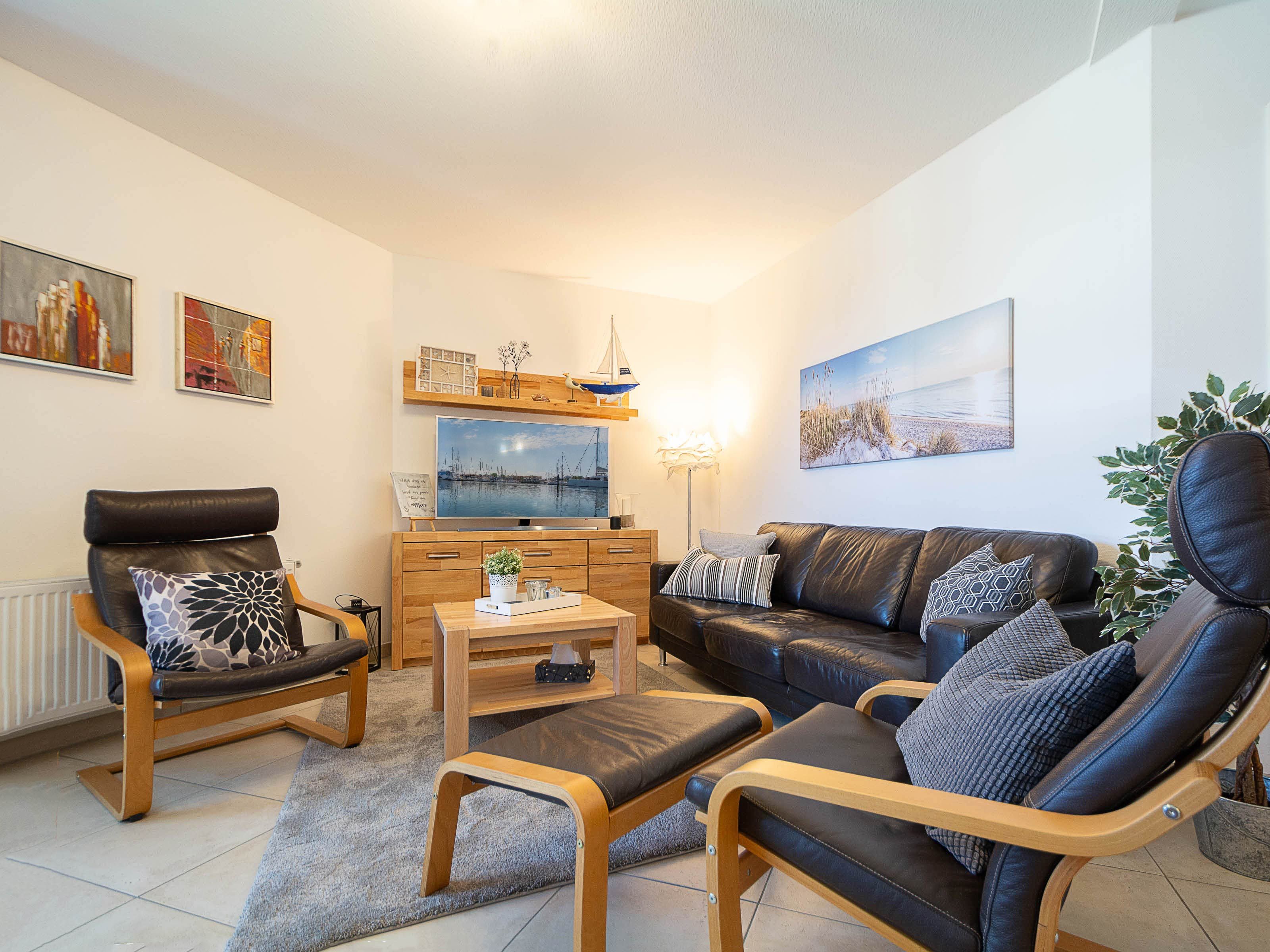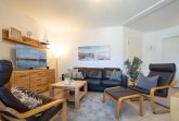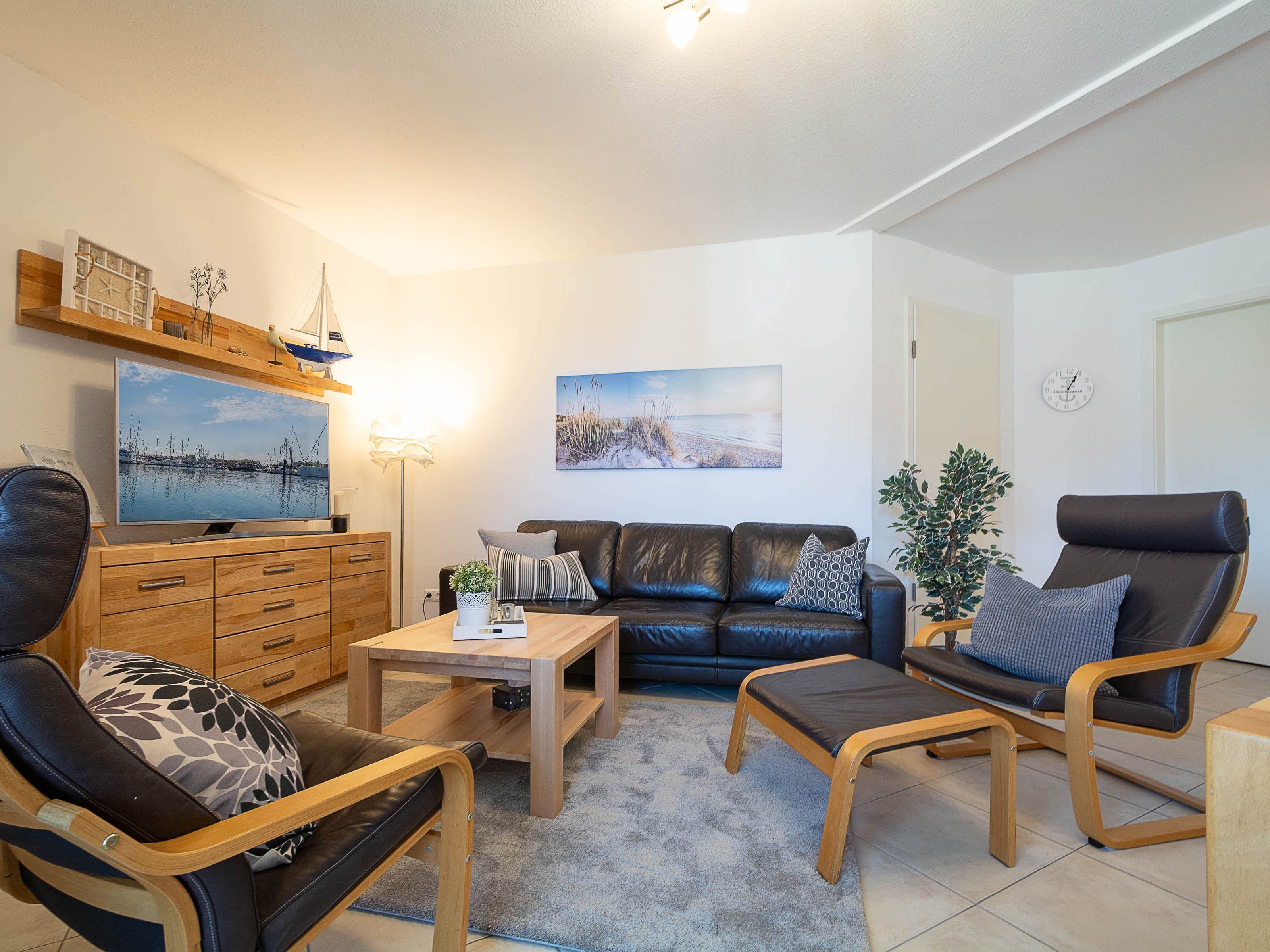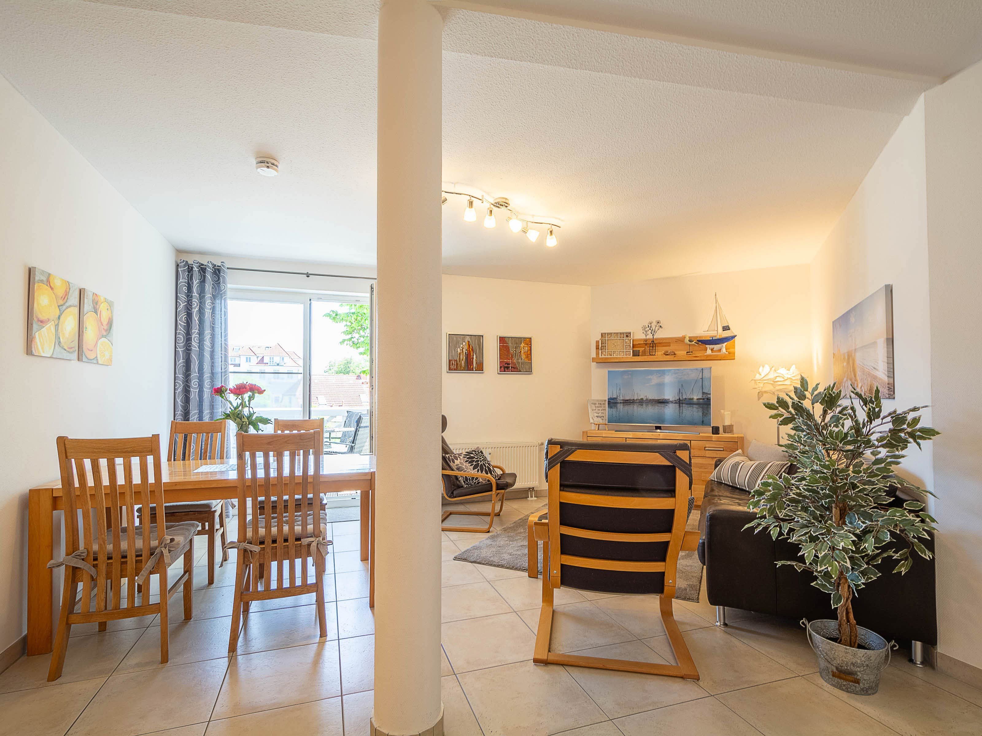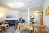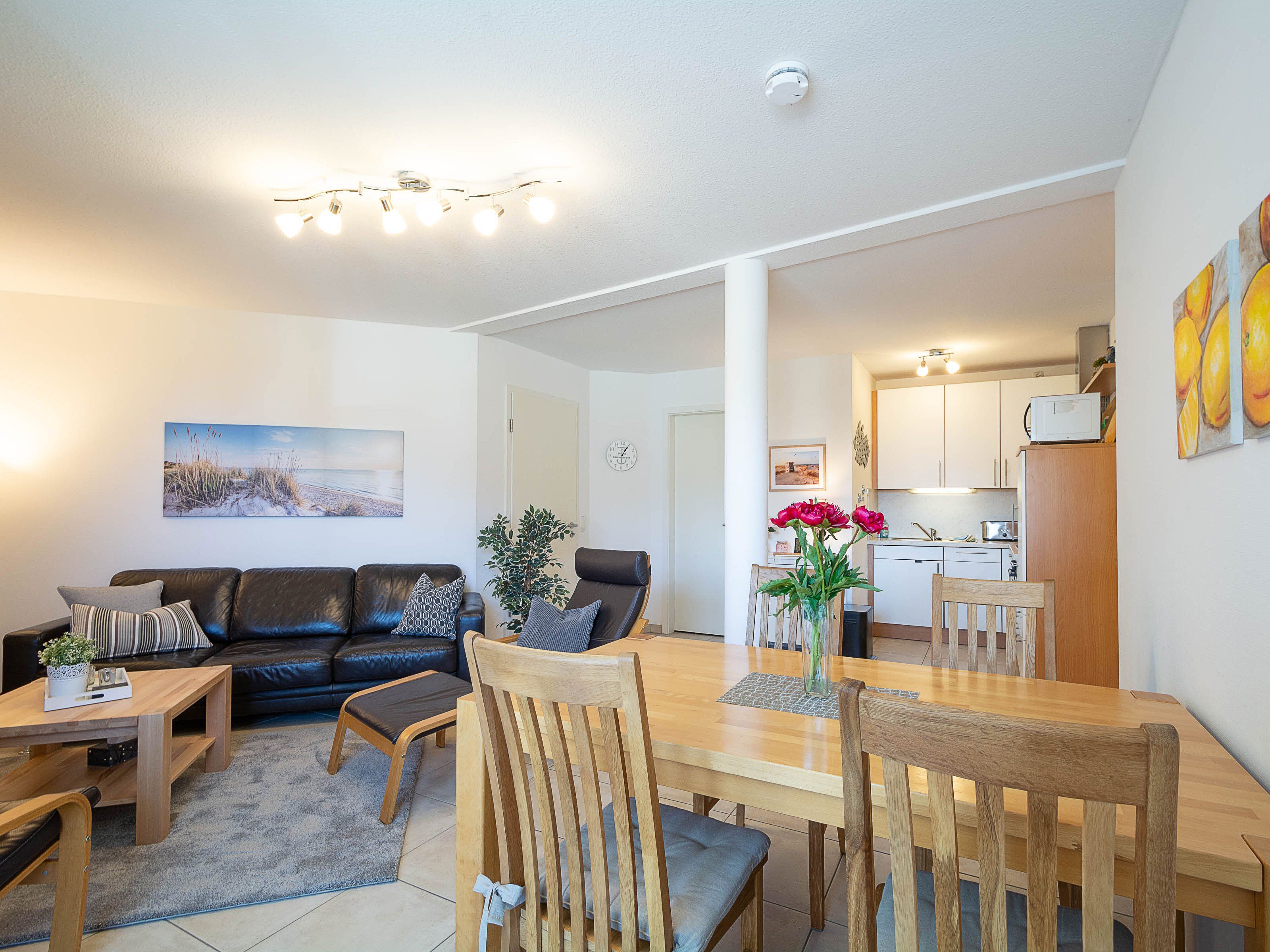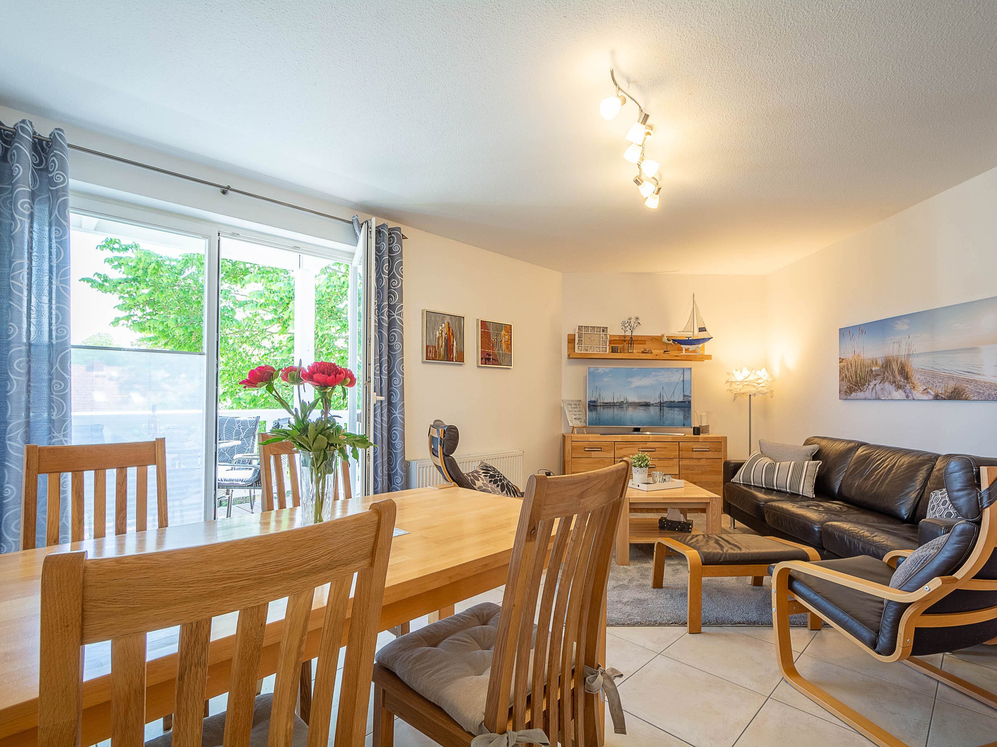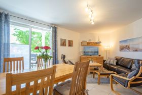 Das helle Wohnzimmer lädt mit einer gemütlichen Couchgarnitur zum Entspannen ein. Ein 50-Zoll-Flachbild-TV und ein Bluetooth-Lautsprecher sorgen für beste Unterhaltung. Der angrenzende Essbereich bietet Platz für gemeinsame Mahlzeiten. Von hier aus gelangen Sie direkt auf den möblierten Ost-Balkon, der zum Verweilen einlädt und einen schönen Blick in Richtung Ostsee bietet.