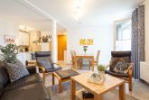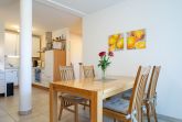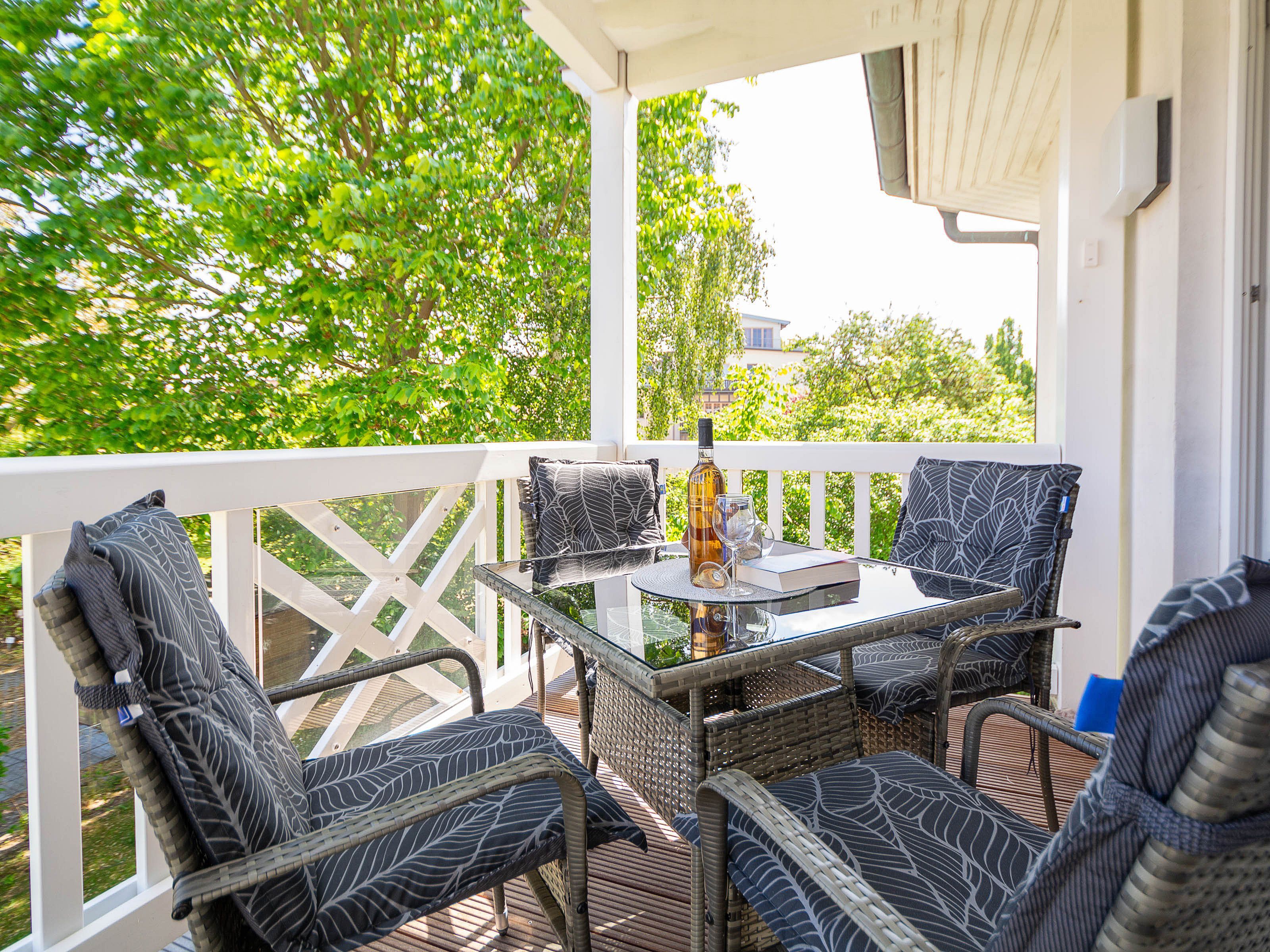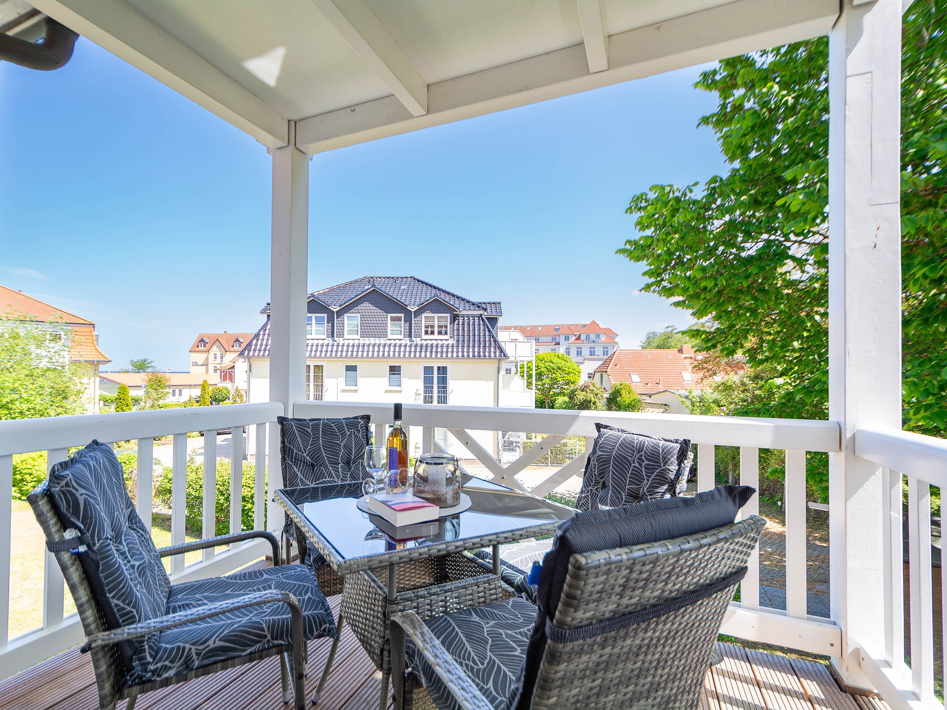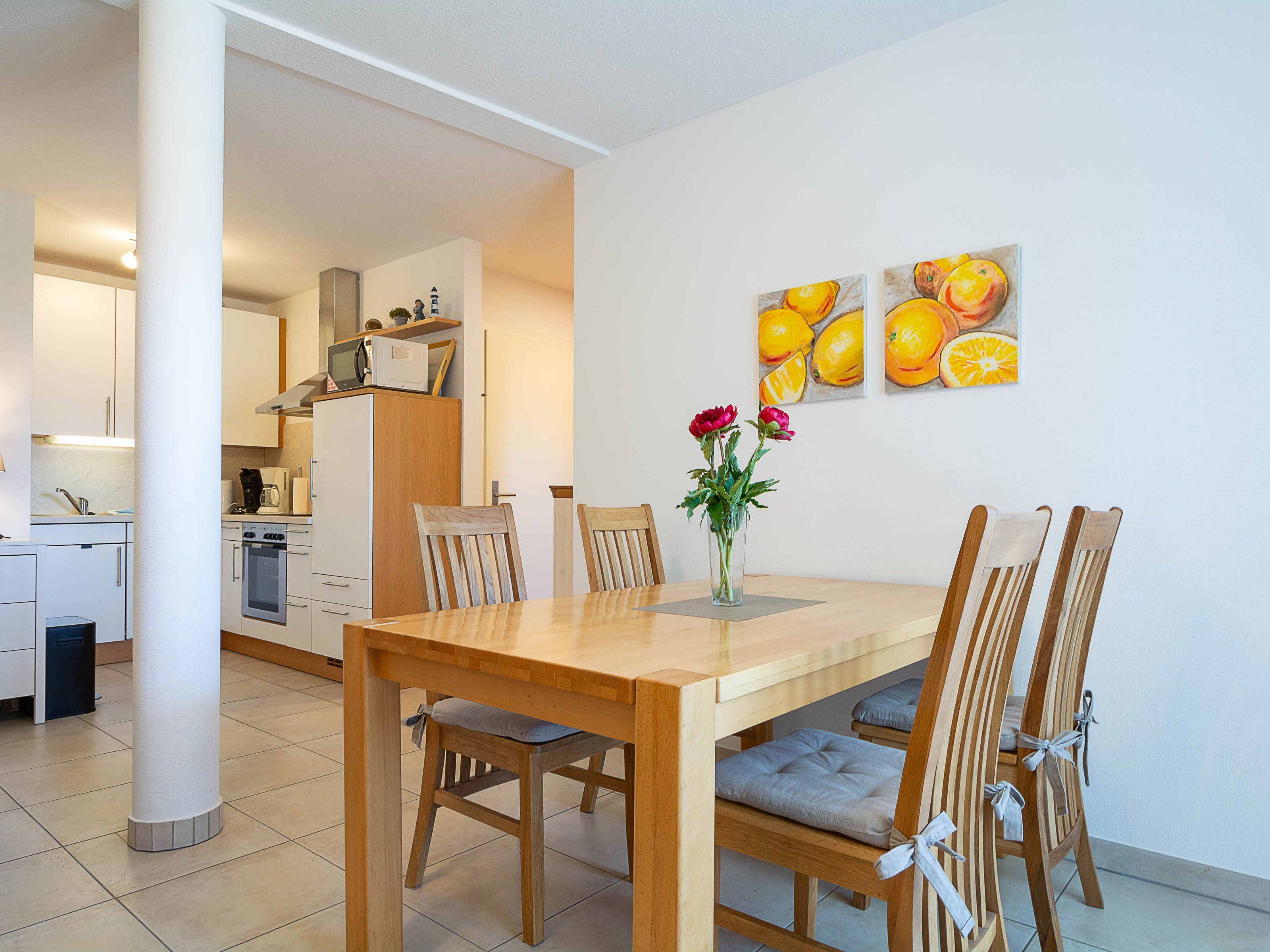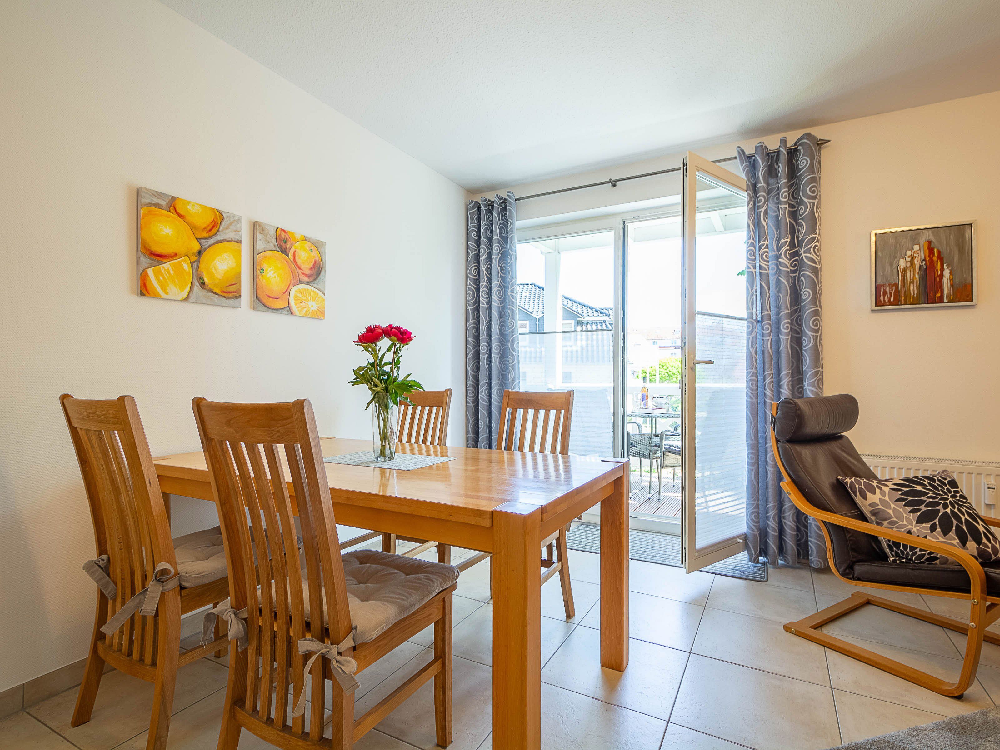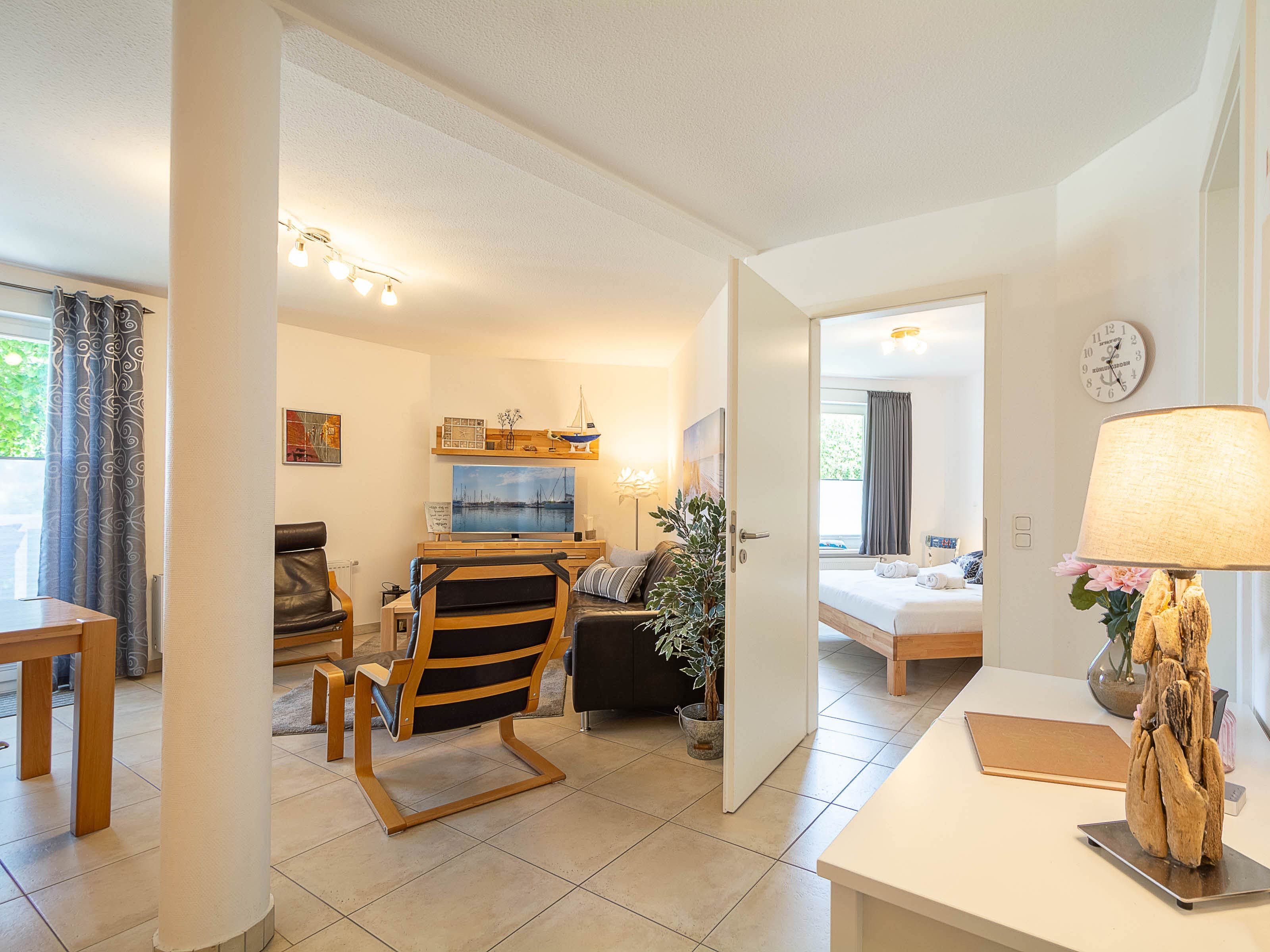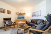Das helle Wohnzimmer lädt mit einer gemütlichen Couchgarnitur zum Entspannen ein. Ein 50-Zoll-Flachbild-TV und ein Bluetooth-Lautsprecher sorgen für beste Unterhaltung. Der angrenzende Essbereich bietet Platz für gemeinsame Mahlzeiten. Von hier aus gelangen Sie direkt auf den möblierten Ost-Balkon, der zum Verweilen einlädt und einen schönen Blick in Richtung Ostsee bietet.