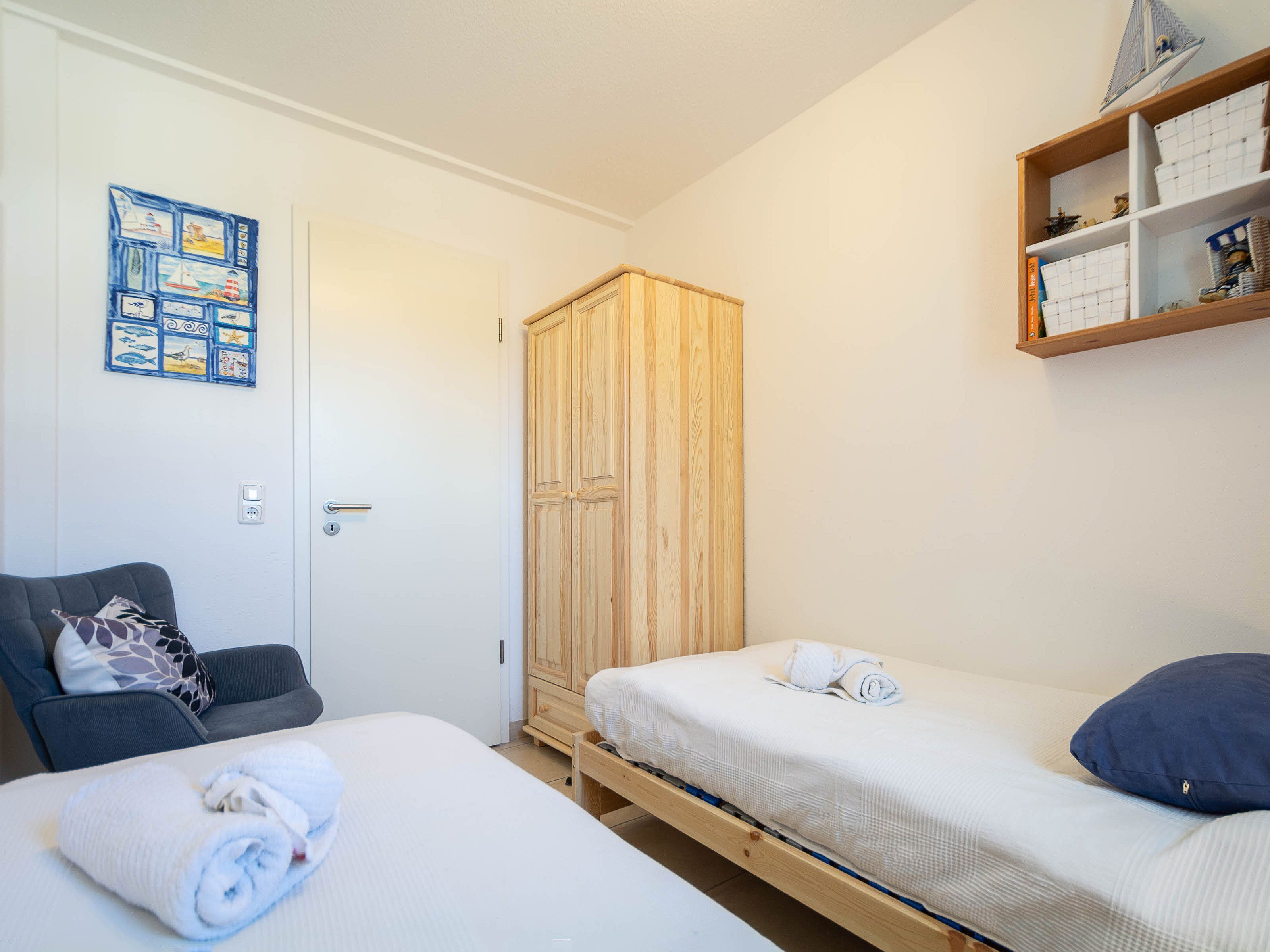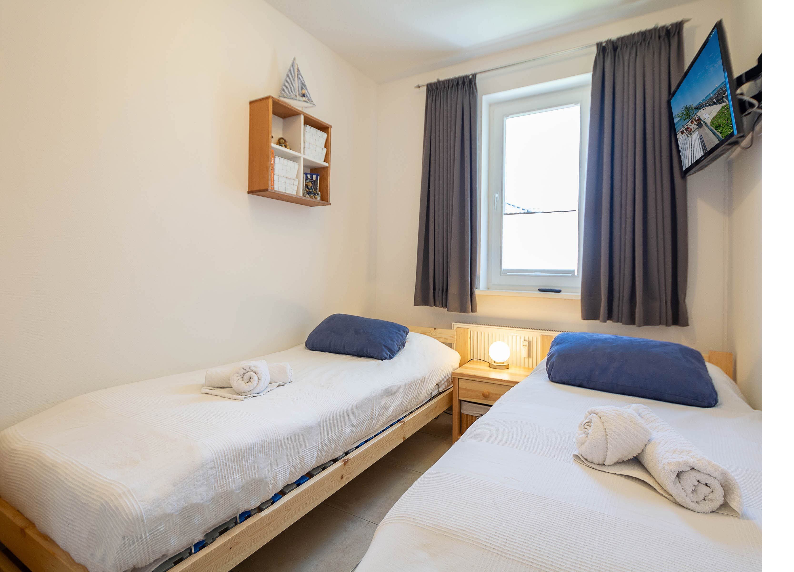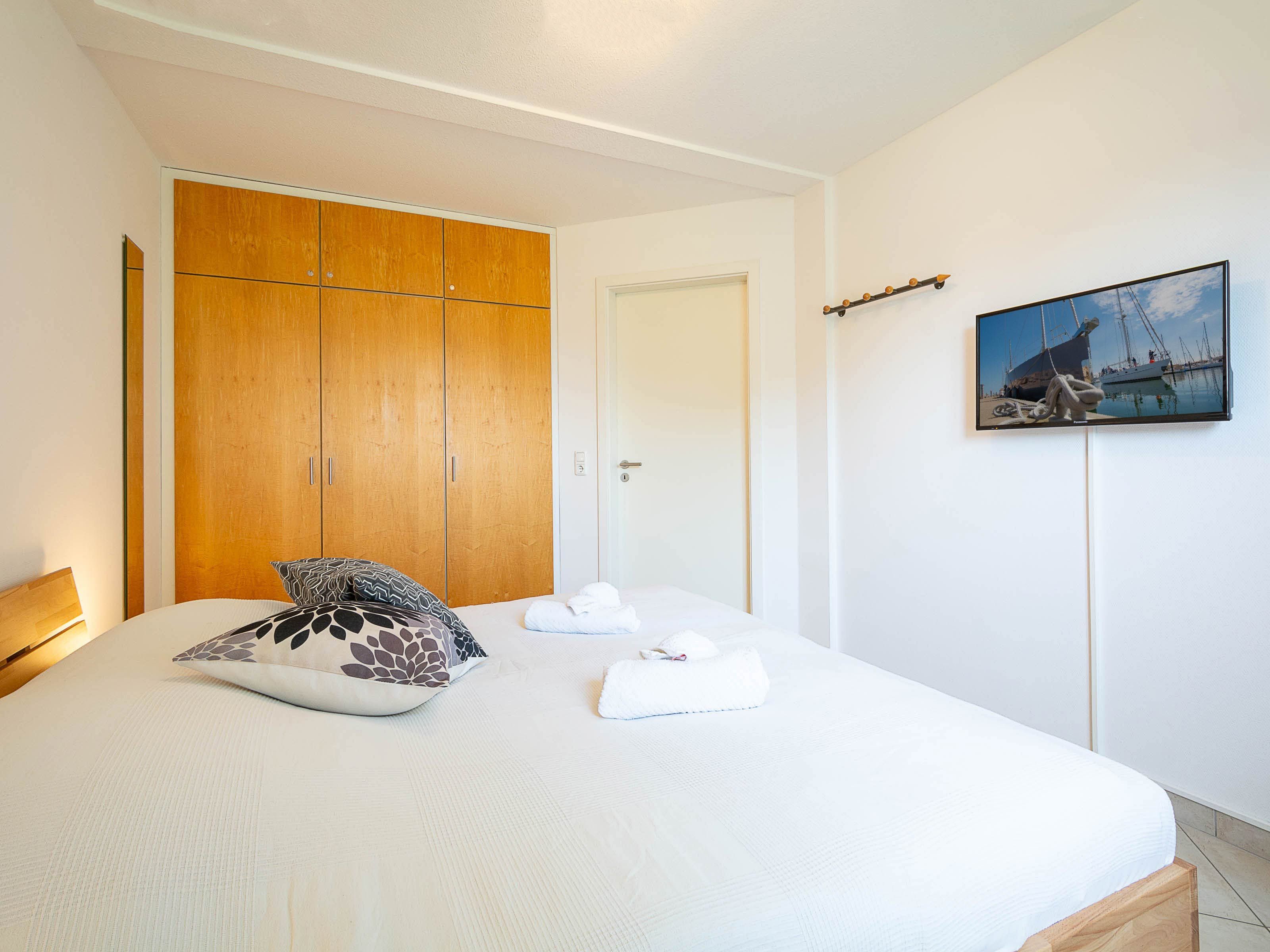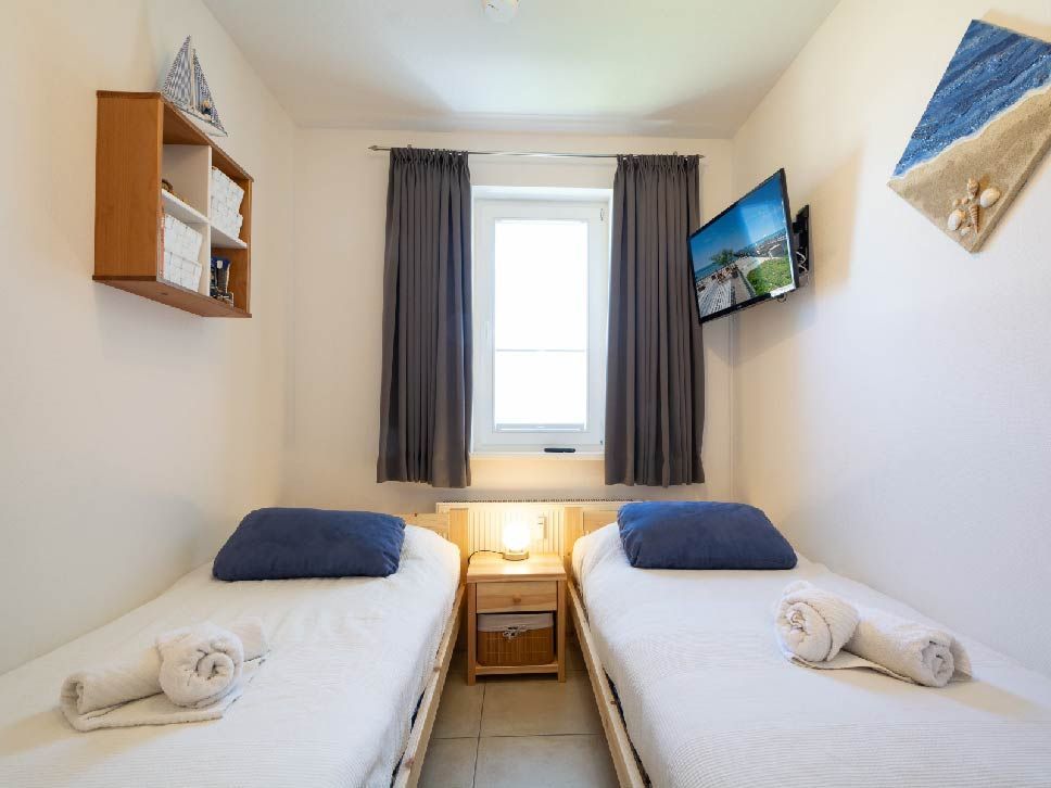 Das erste Schlafzimmer verfügt über ein komfortables Doppelbett, einen geräumigen Kleiderschrank sowie einen zusätzlichen LCD-TV. Im zweiten Schlafzimmer befinden sich zwei Einzelbetten (je 80 x 200 cm) mit verstellbarem Lattenrost und hochwertigen Irisette-Kaltschaummatratzen. Eine Kommode bietet Stauraum für Ihre Urlaubsgarderobe.