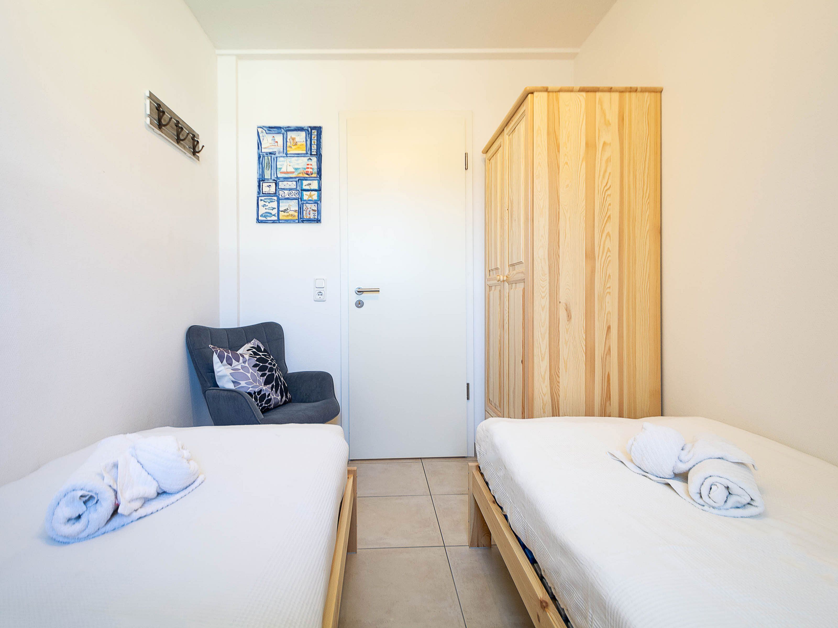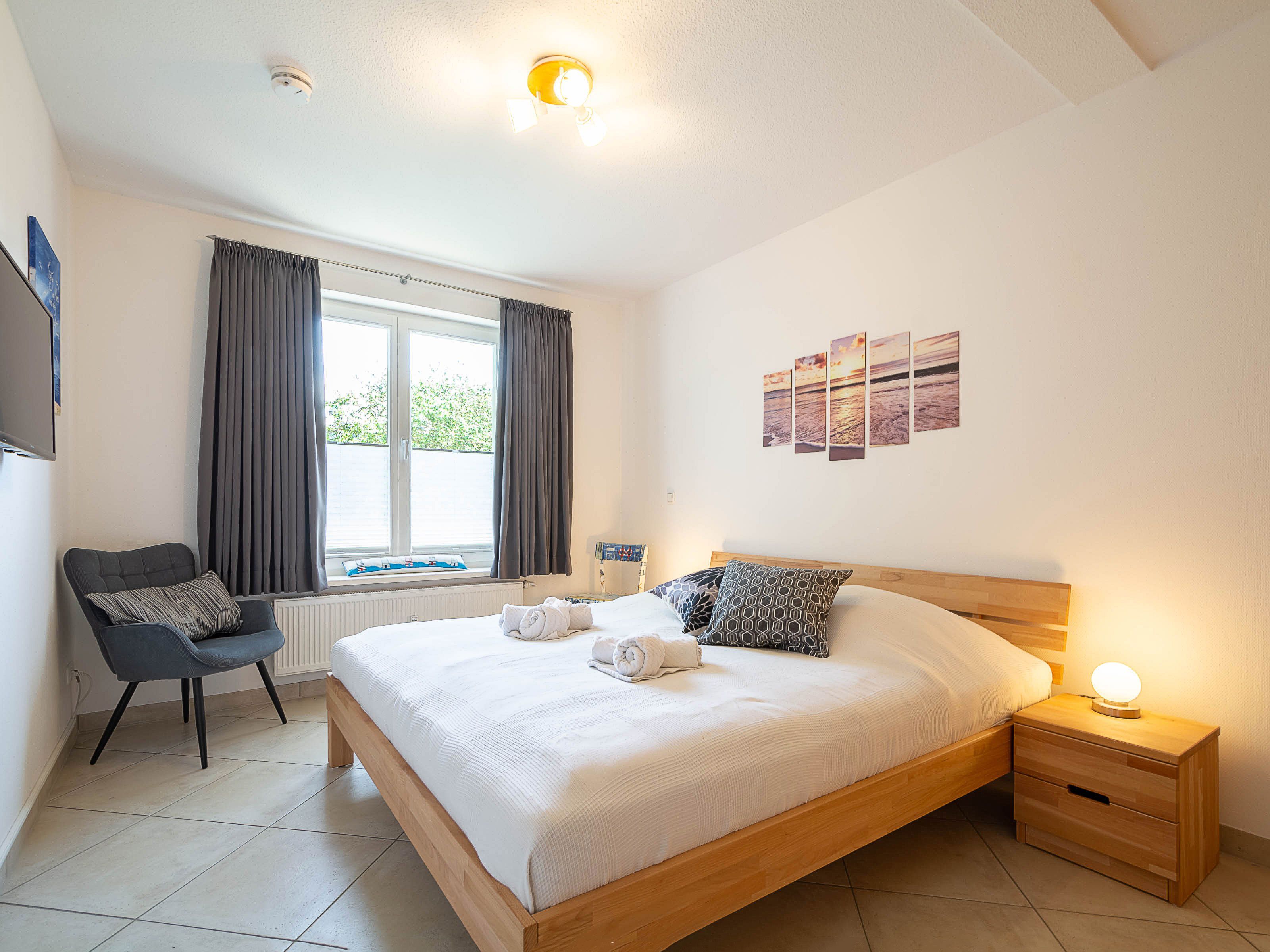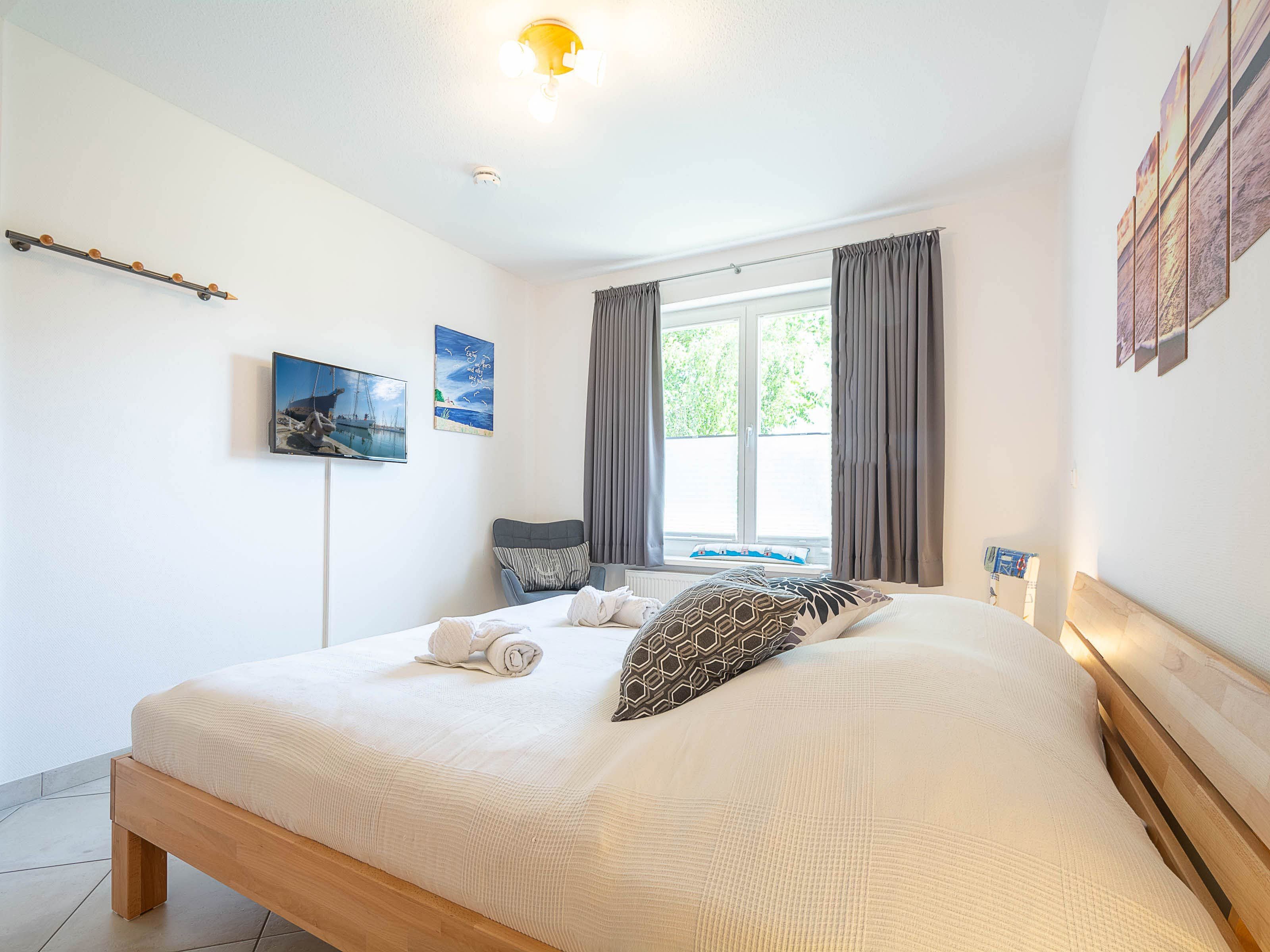Das erste Schlafzimmer verfügt über ein komfortables Doppelbett, einen geräumigen Kleiderschrank sowie einen zusätzlichen LCD-TV. Im zweiten Schlafzimmer befinden sich zwei Einzelbetten (je 80 x 200 cm) mit verstellbarem Lattenrost und hochwertigen Irisette-Kaltschaummatratzen. Eine Kommode bietet Stauraum für Ihre Urlaubsgarderobe.