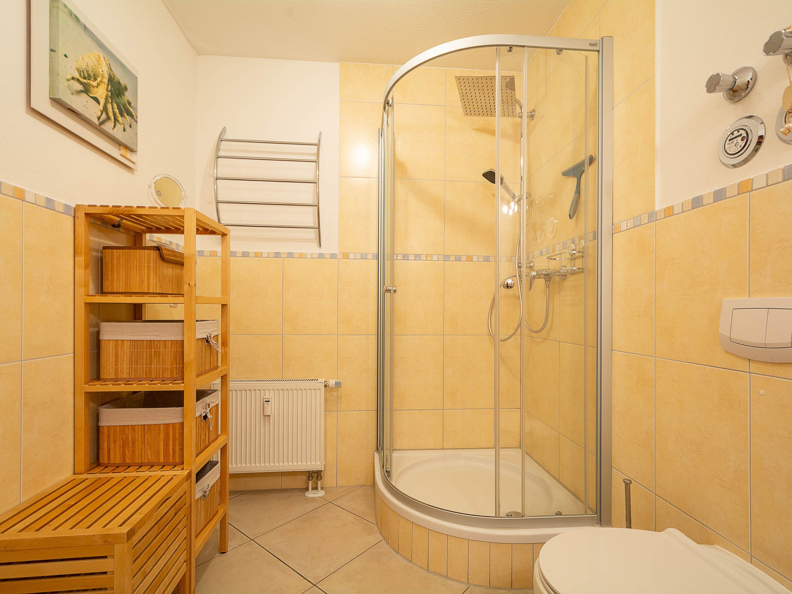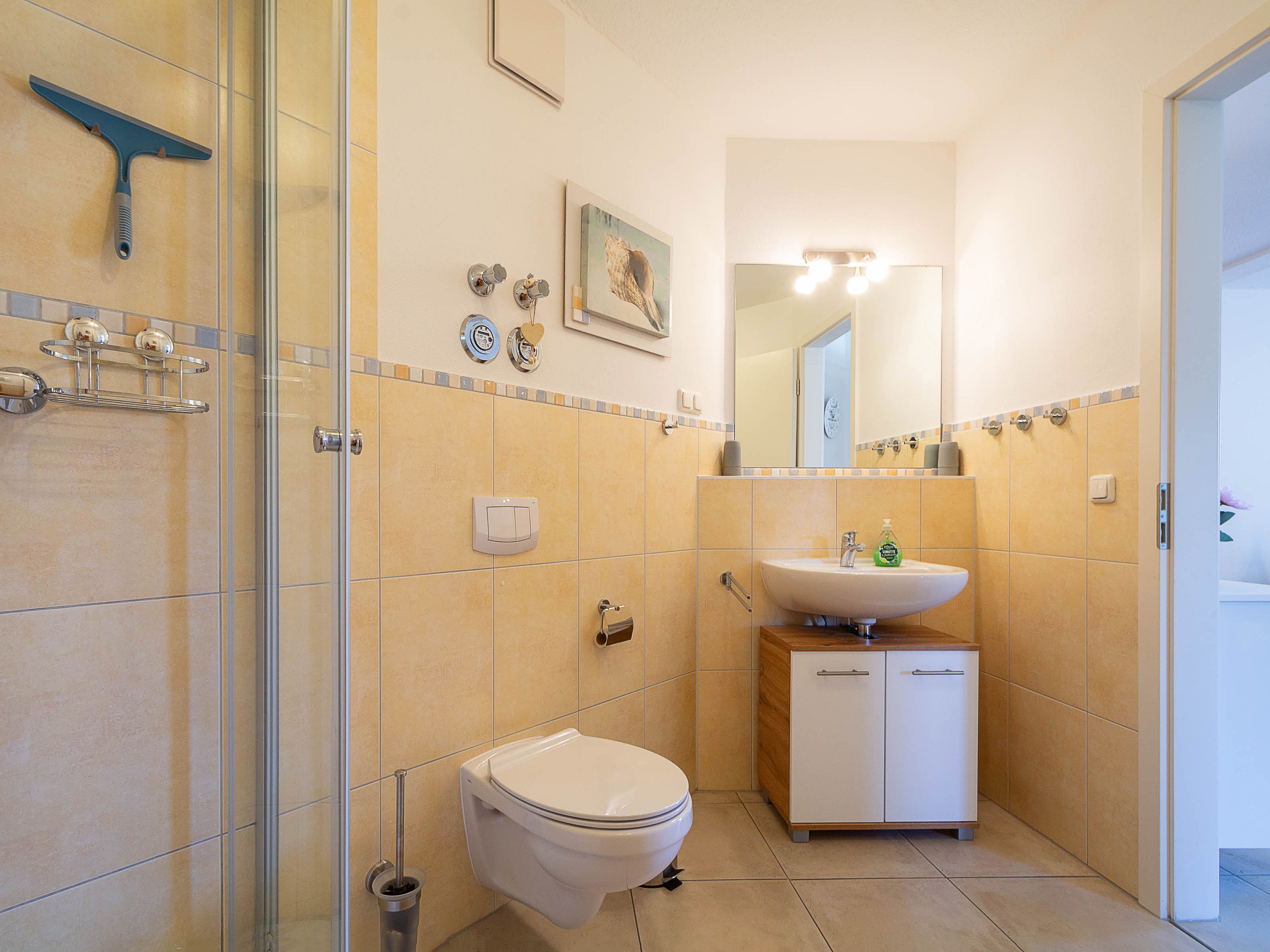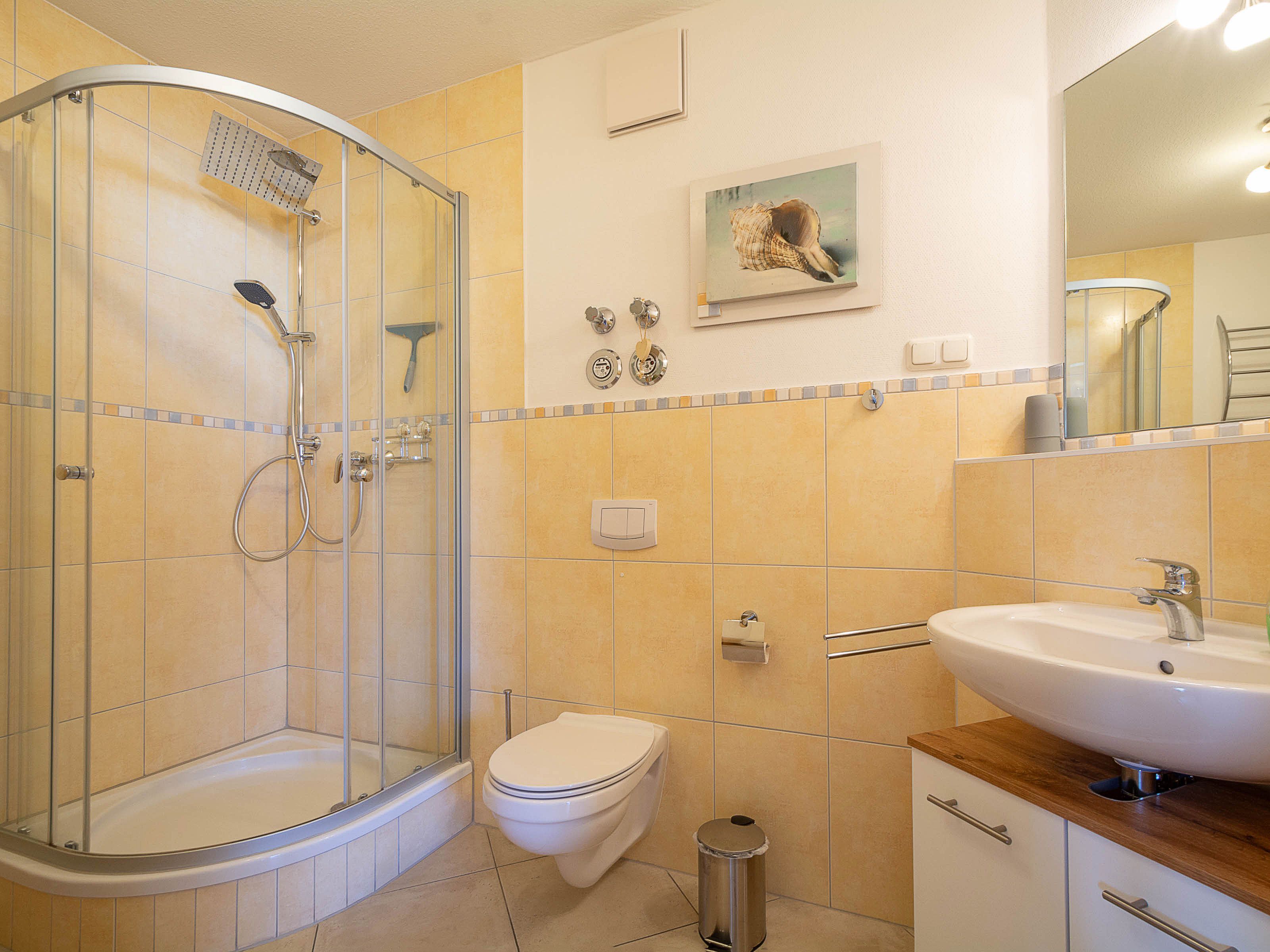 Das moderne Bad ist mit einer großzügigen Regenwalddusche und einem WC ausgestattet. Helle Fliesen und stilvolle Armaturen unterstreichen den gepflegten Gesamteindruck der Wohnung..