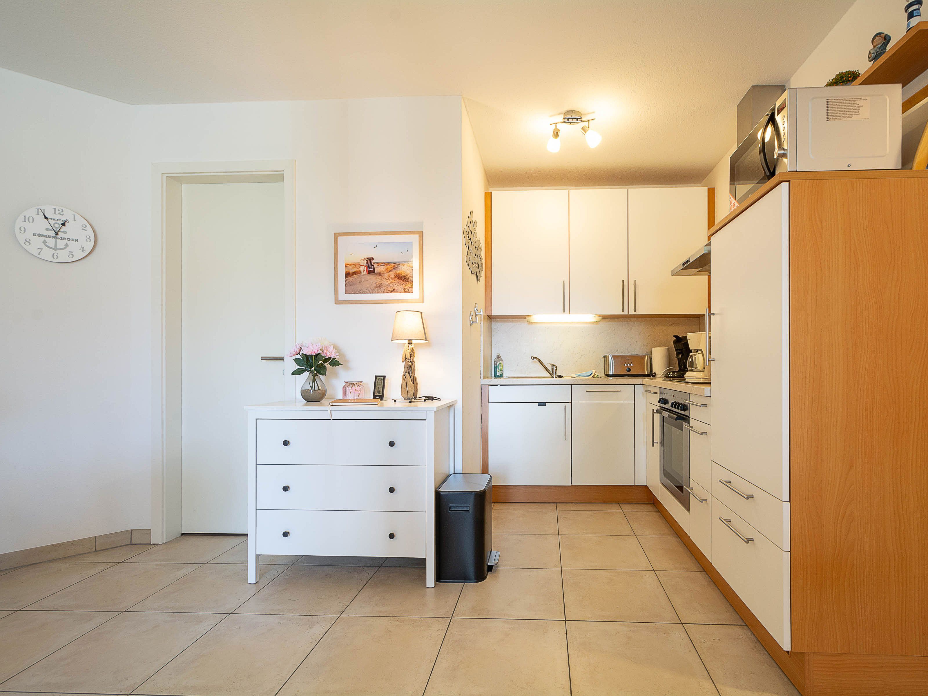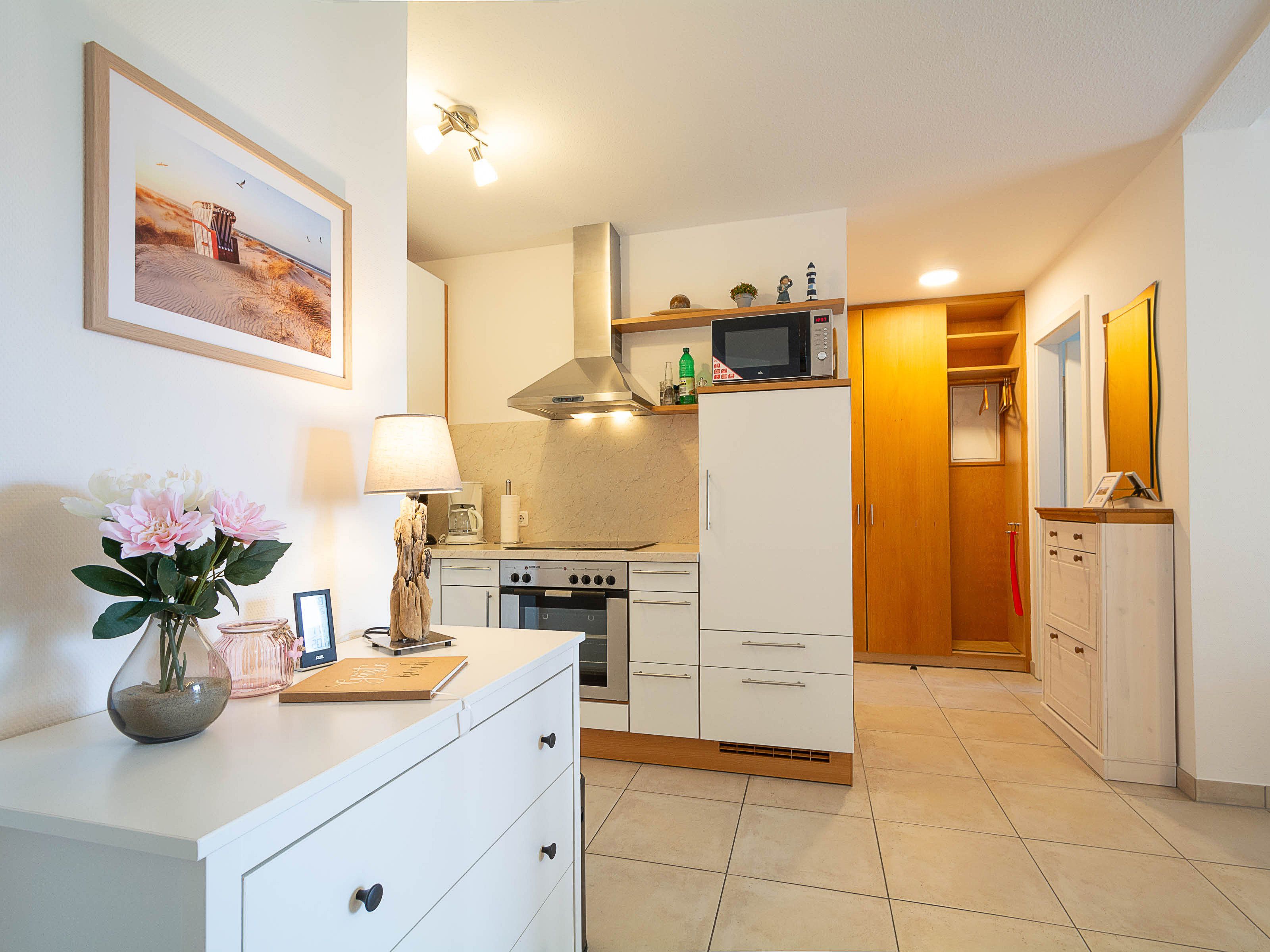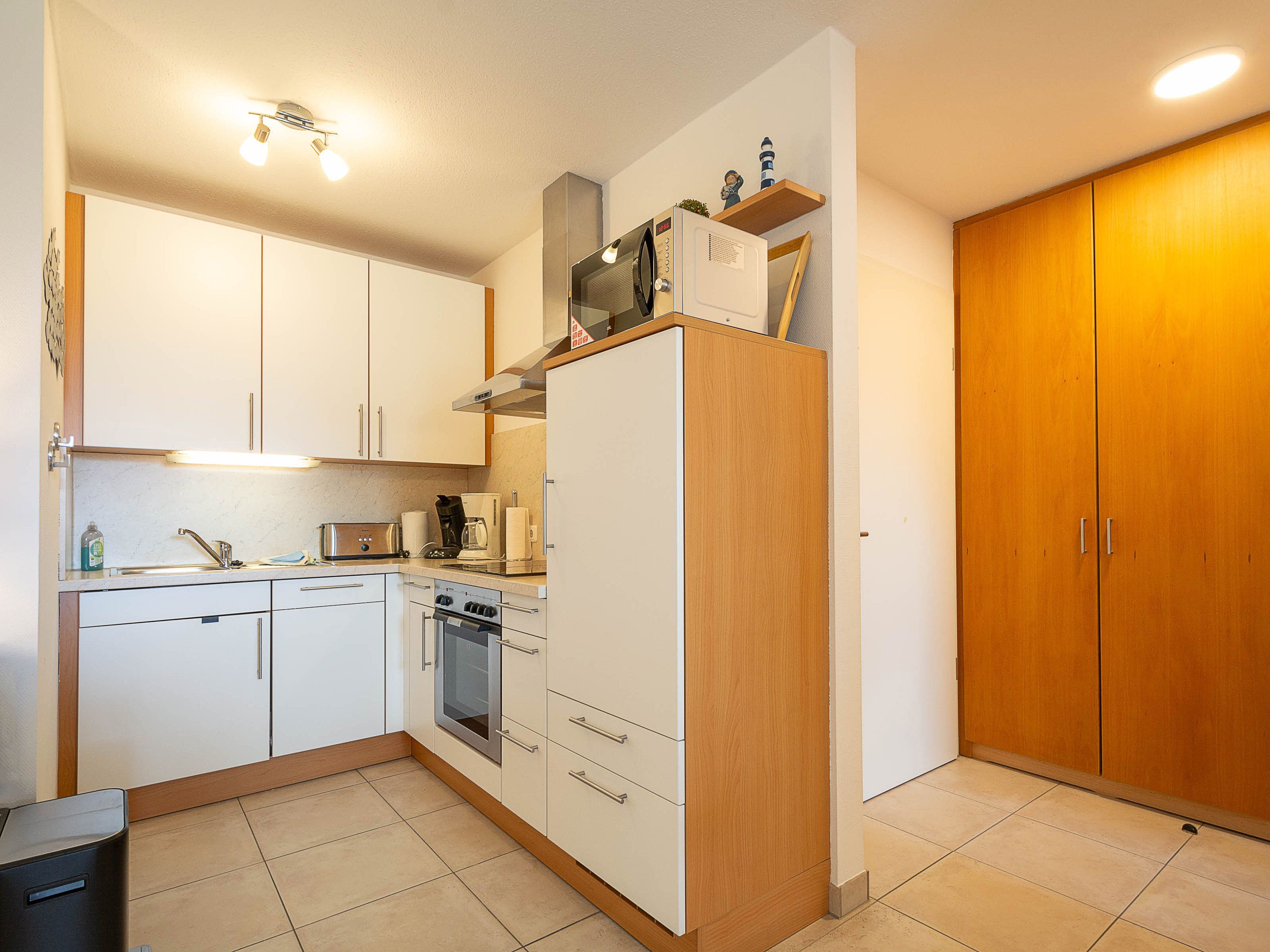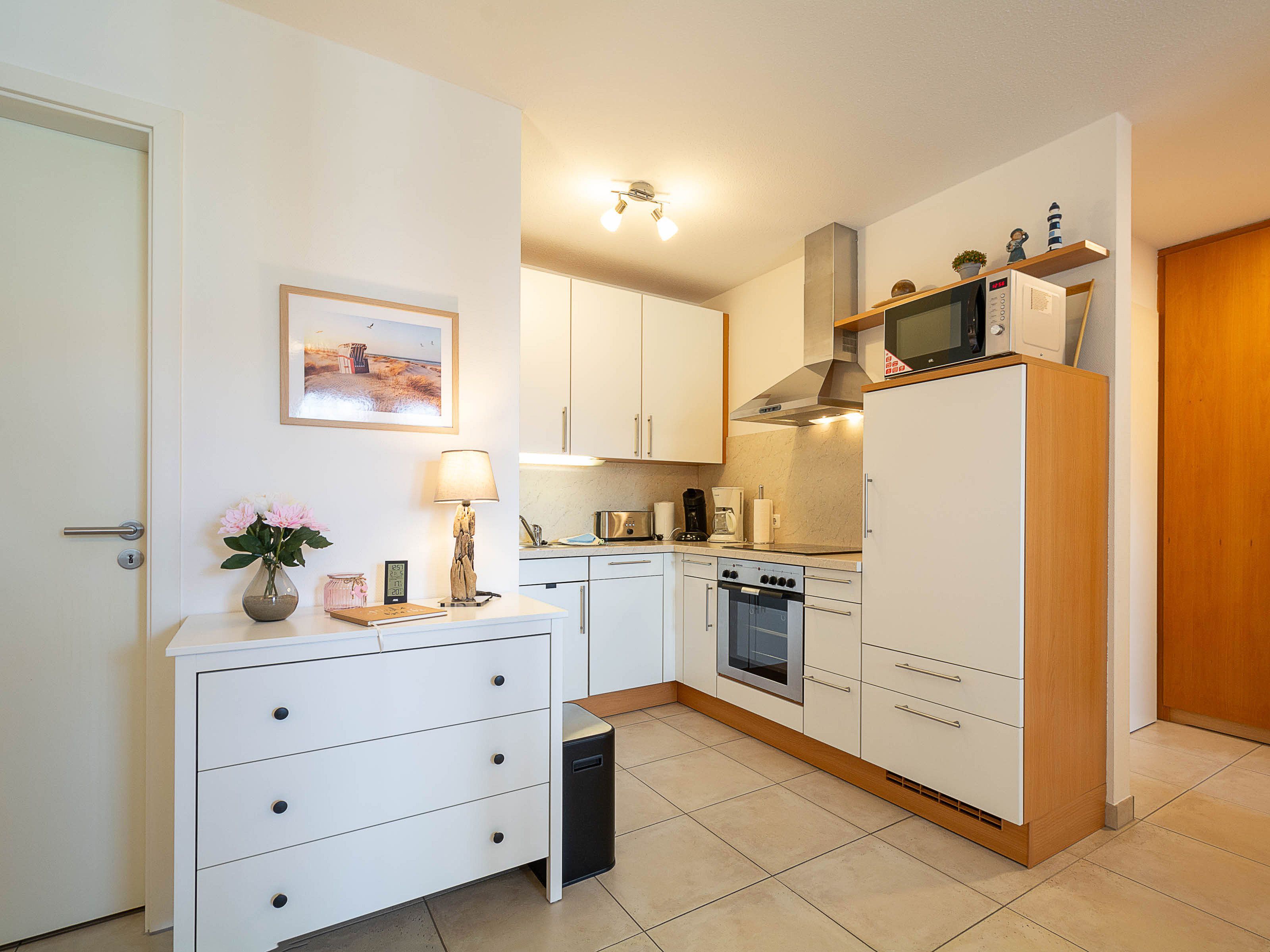 Die offene Küchenzeile ist vollständig ausgestattet und lässt keine Wünsche offen. Neben einem Ceran-Kochfeld mit moderner Edelstahlabzugshaube stehen Ihnen ein Backofen, eine Spülmaschine, eine Mikrowelle sowie ein Kühlschrank zur Verfügung. Hier können Sie sich komfortabel selbst versorgen.