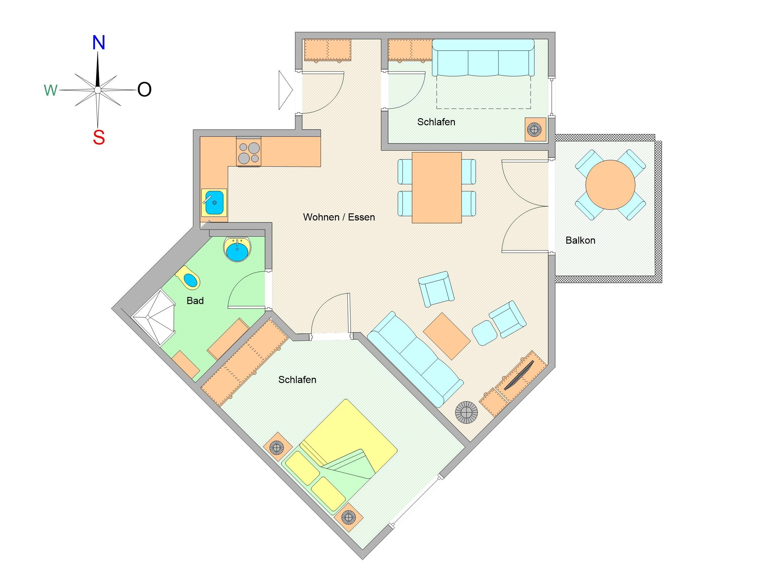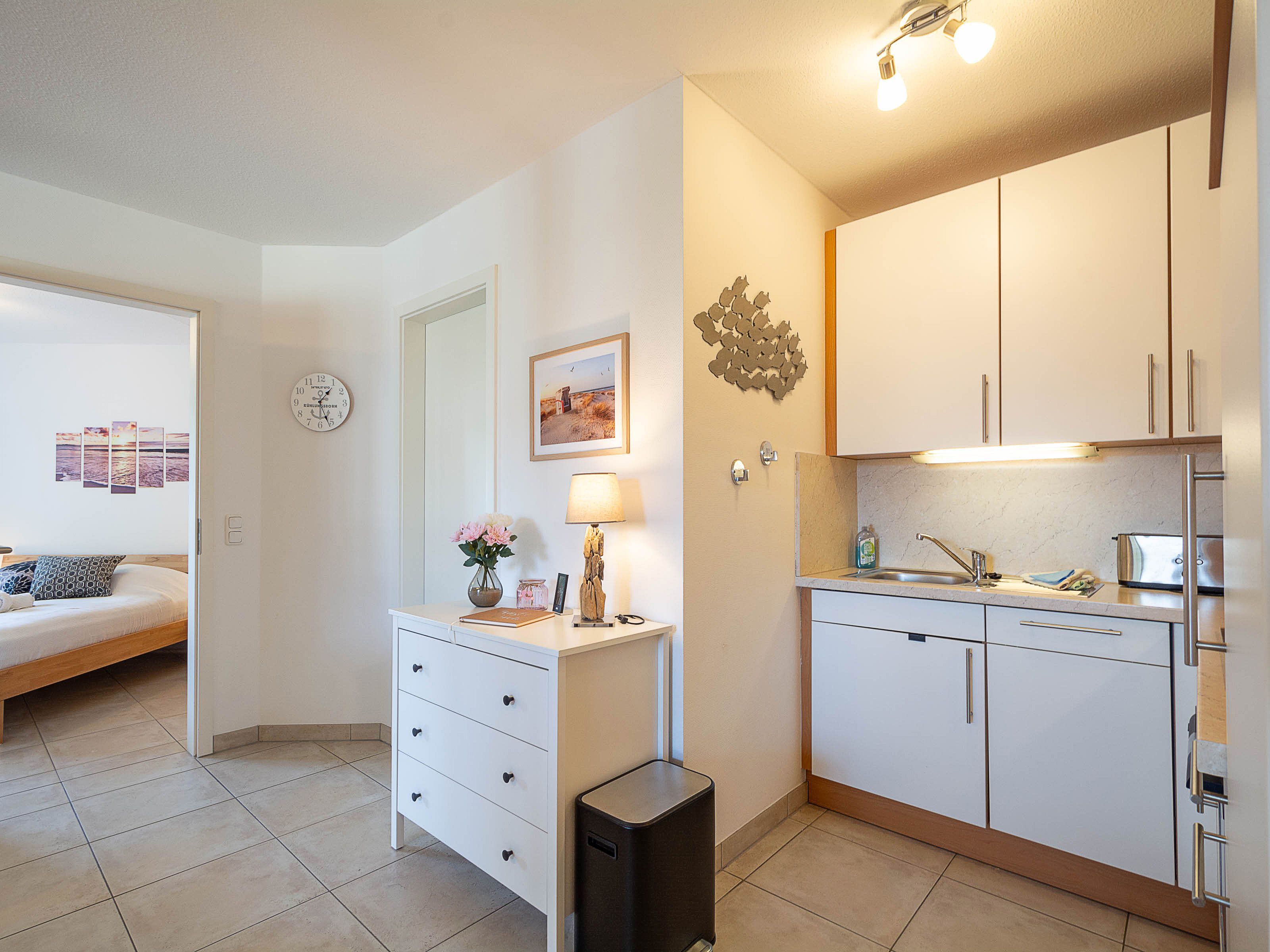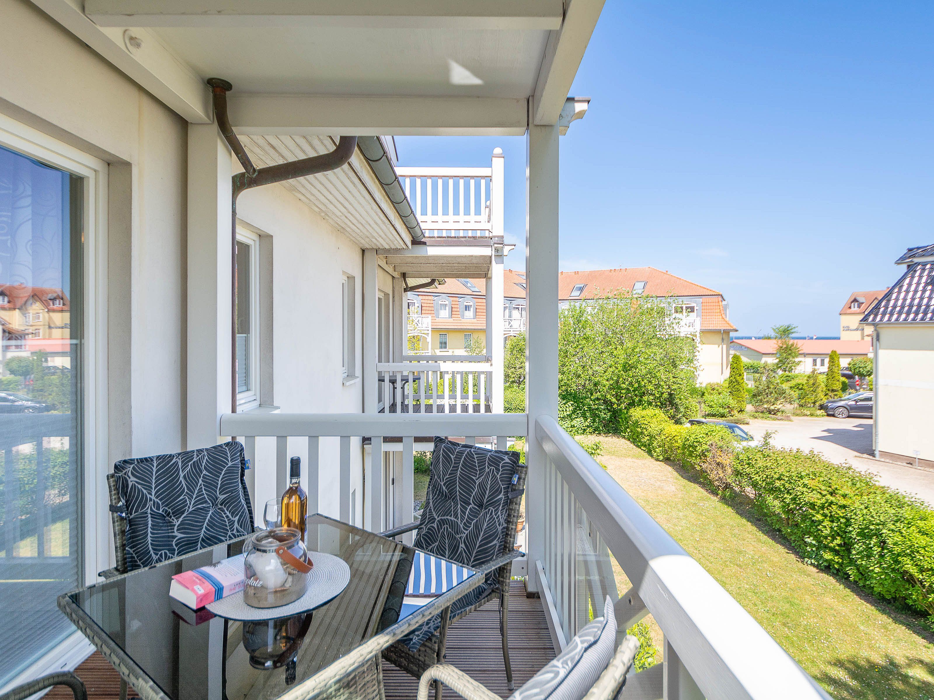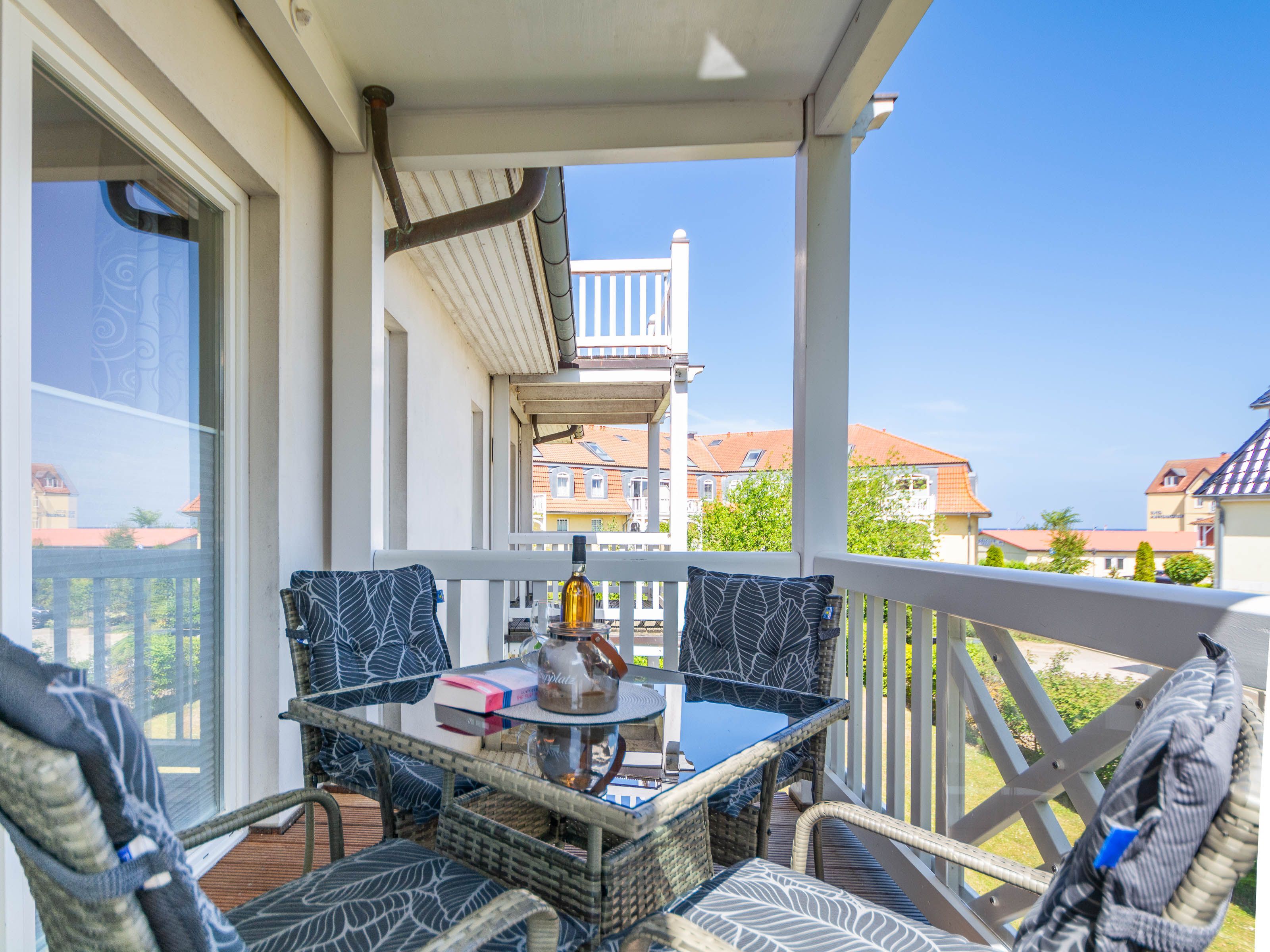 Die Ferienwohnung verfügt über ein offenes Wohn- und Esszimmer mit integrierter Küchenzeile, zwei separate Schlafzimmer, ein modernes Badezimmer sowie einen möblierten Balkon mit Ostseeblick ideal, um den Tag bei einem Frühstück in der Morgensonne zu beginnen oder gemütlich ausklingen zu lassen.