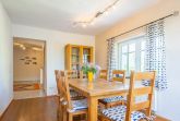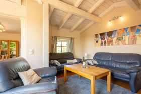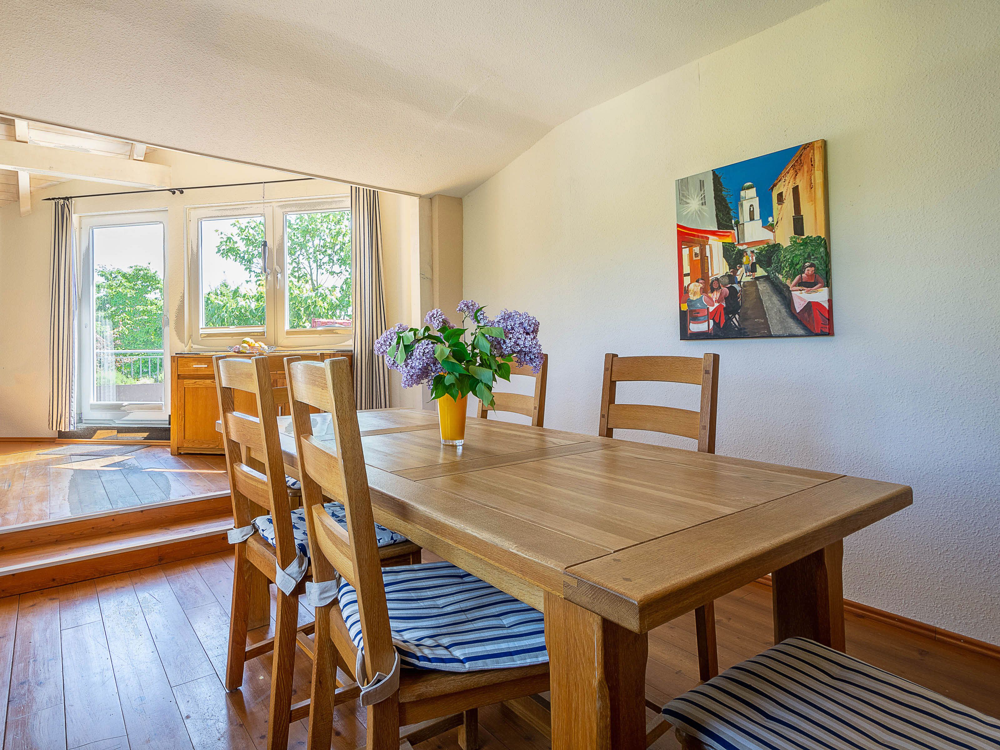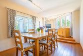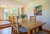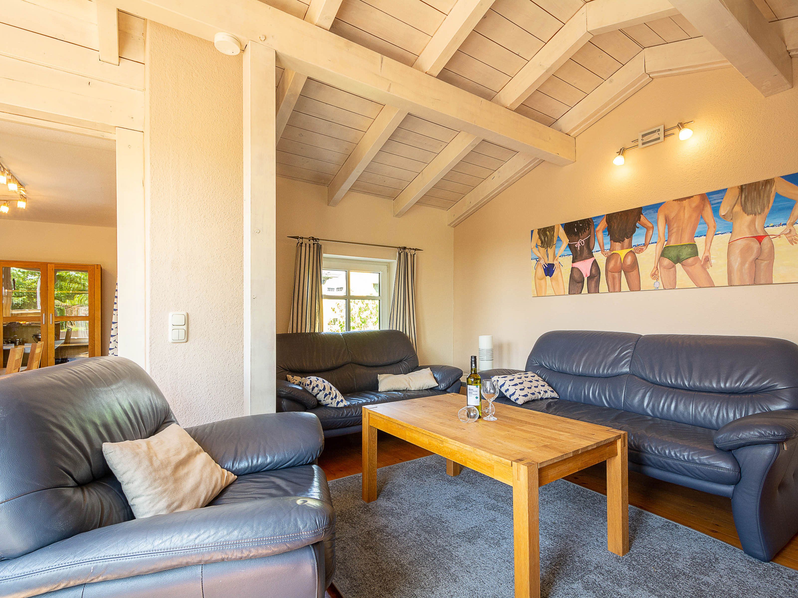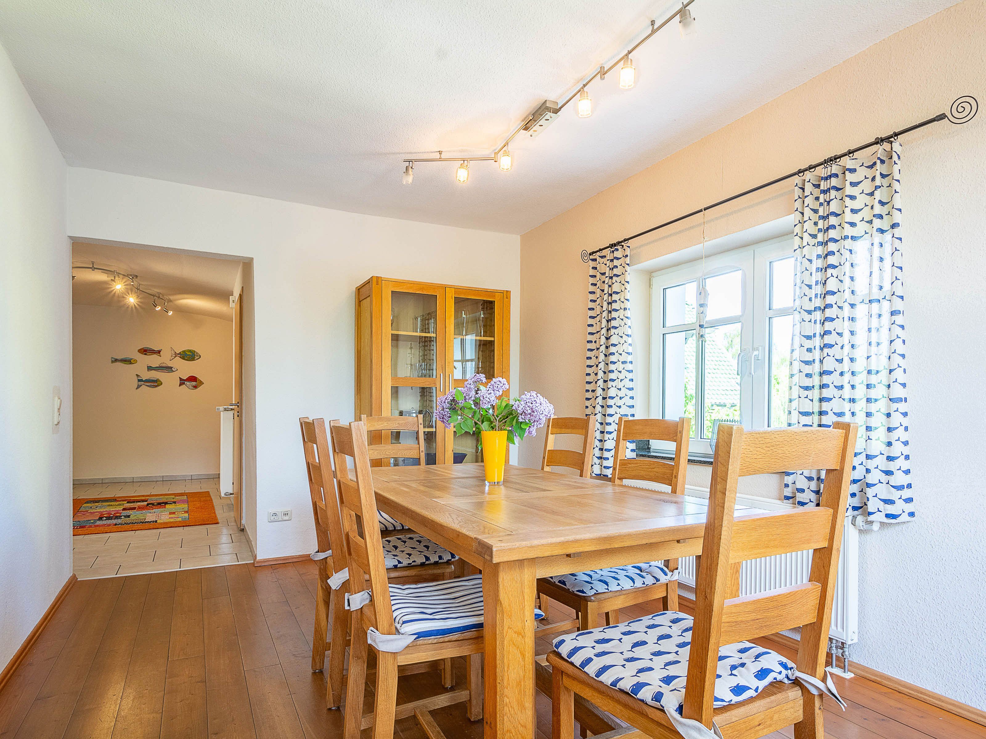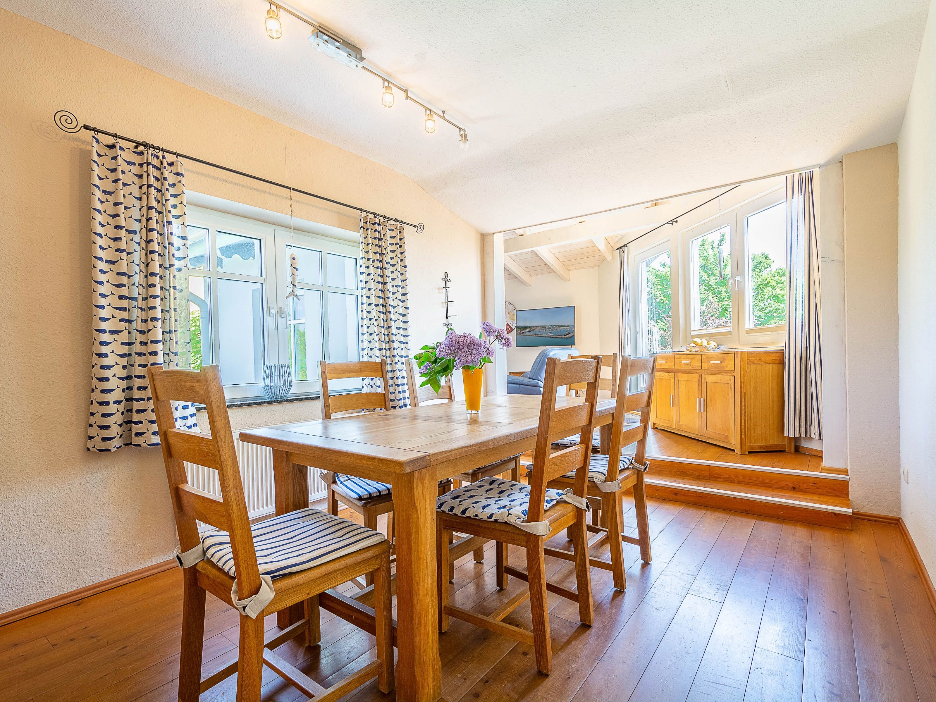Der gemütliche Wohnbereich der Ferienwohnung ist für Sie mit einer bequemen Couchgarnitur, einem 50er Flat TV und einer Musikanlage mit CD-Player eingerichtet. Als Sichtschutz bzw. zum Verdunkeln sind im Wohnbereich Vorhänge und Plissees an den Fenstern angebracht. Der Essbereich bietet Ihnen reichlich Platz für gemeinsame Mahlzeiten und grenzt an den Wohnbereich.