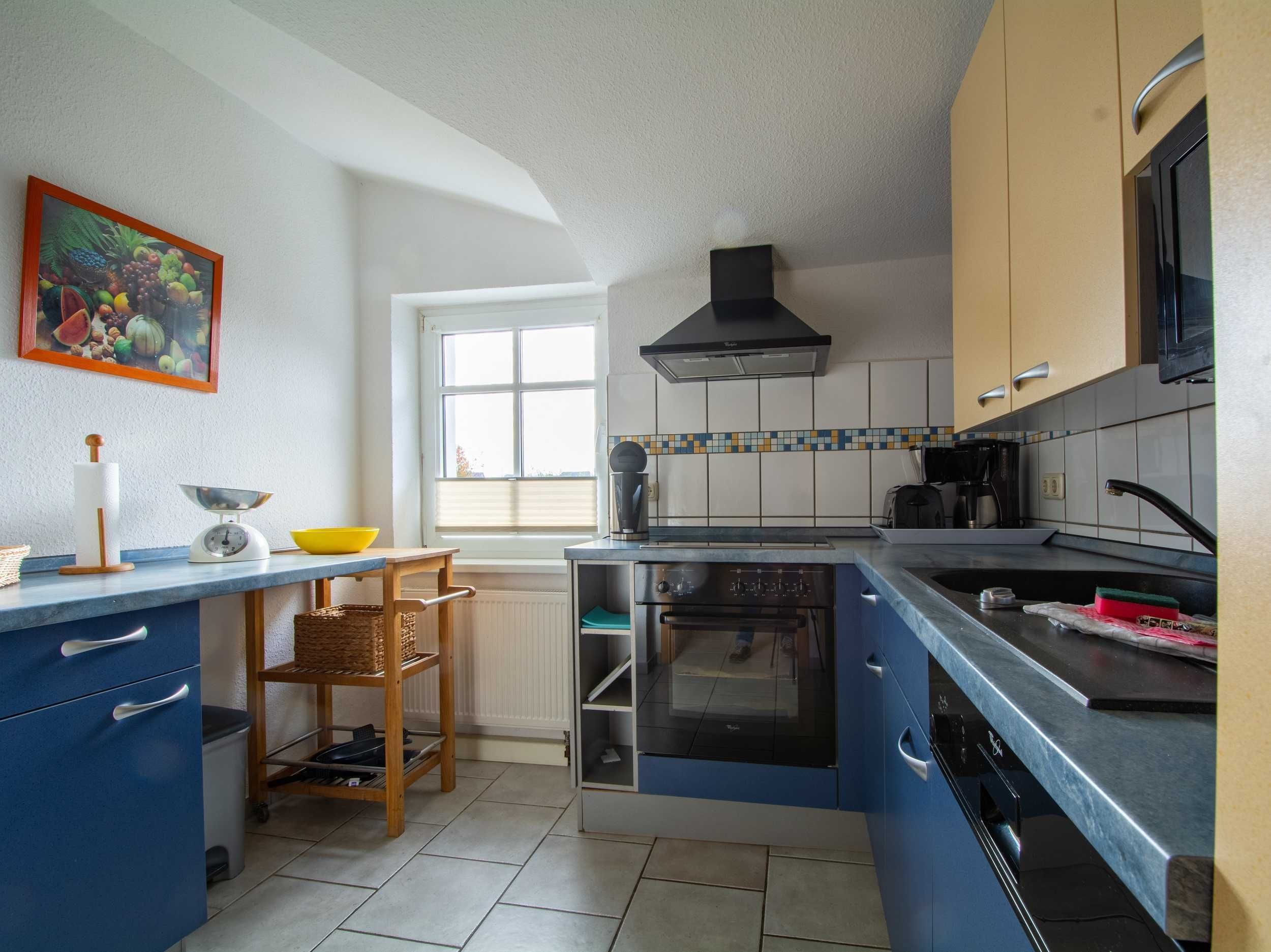 Die voll eingerichtete Küche hält für Sie alle wichtigen Küchengeräte und -utensilien bereit, die Sie für Ihr perfektes Dinner benötigen: Ein 4-Zonen-Cerankochfeld, ein Backofen mit Dunstabzug, ein Geschirrspüler, eine Mikrowelle sowie ein Kühlschrank mit Gefrierfach. Eine Kaffeemaschine, ein Wasserkocher und ein Toaster sowie genügend Koch- und Essgeschirr vervollständigen die Kücheneinrichtung.