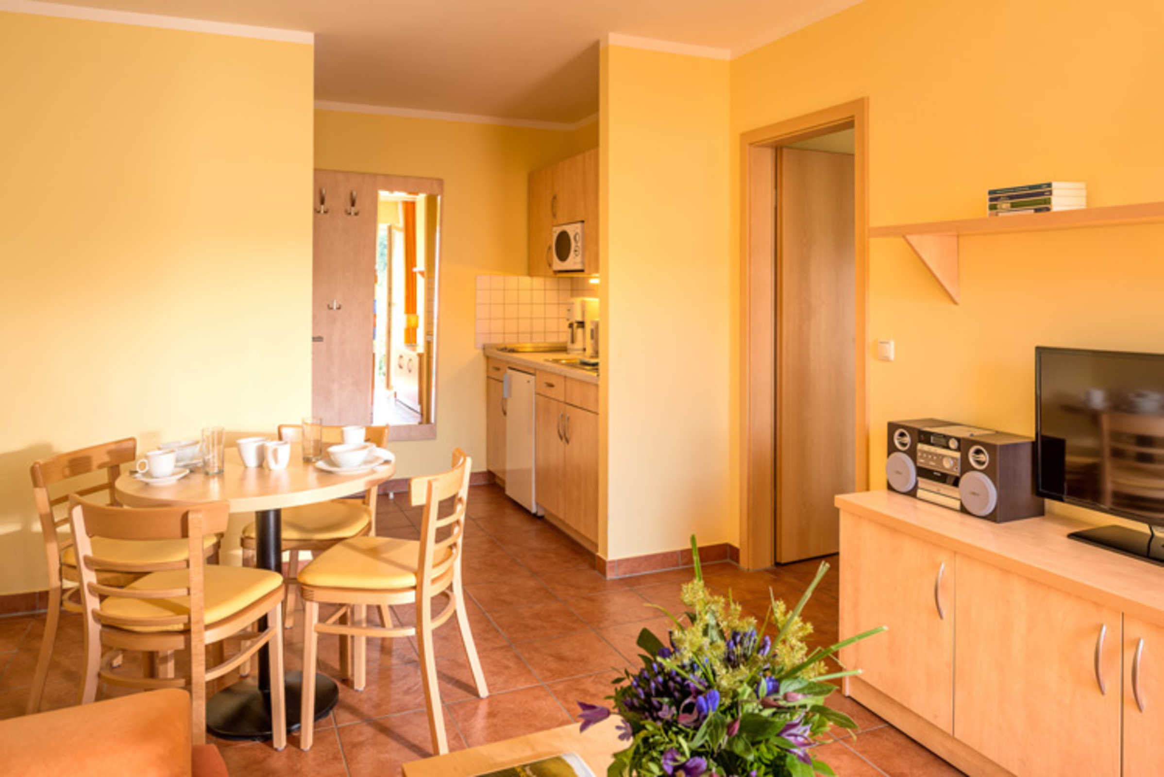 Die komfortablen 2-Raum-Ferienwohnungen (Nichtraucher) von ca. 38 qm befinden sich im Haus Lausitz in Sellin. Alle Wohnungen sind mit Fliesen ausgelegt und haben die gleiche Ausstattung. Sie verfügen im Wohnbereich über eine Couch, zwei Sessel, Couchtisch, Esstisch, Sideboard, Fernseher und Stereoanlage (Radio/CD). In jeder Wohnung befindet sich eine Küchenzeile. Diese ist ausgestattet mit Kühlschrank, Cerankochfeld, Mikrowelle, Kaffeemaschine und Toaster. Die Schlafzimmer verfügen jeweils über ein Doppelbett, einen großen Kleiderschrank und zwei Nachttische. Zu jeder Wohnung gehört ein Bad mit Dusche und WC, Kosmetikspiegel und Fön. Das Bad ist durch das Schlafzimmer zu erreichen. Die Wohnungen im Erdgeschoß haben je eine separate geräumige Terrasse, die im Obergeschoß einen großen überdachten Balkon. Die Erstausstattung der Bettwäsche und Handtücher stellt Ihnen der Vermieter kostenlos zur Verfügung. Für die kleinen Gäste kann auf Vorbestellung ein Kinderbett und ein Hochstuhl gestellt werden. In den Wohnungen 6; 8; 9 sind Haustiere für 12,- Euro pro Tag willkommen. Die Wohnungen 1 bis 9 befinden sich im Parterre.