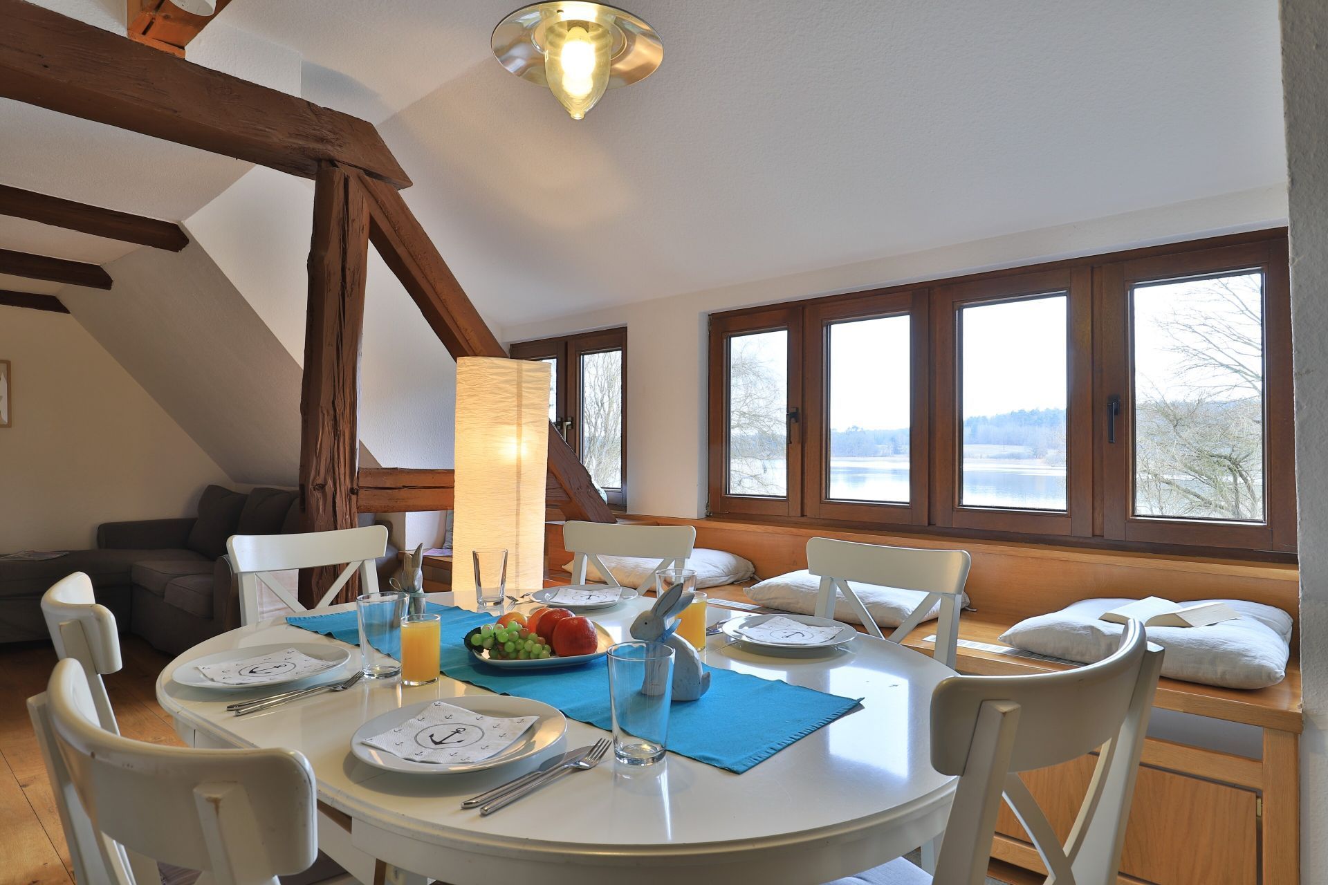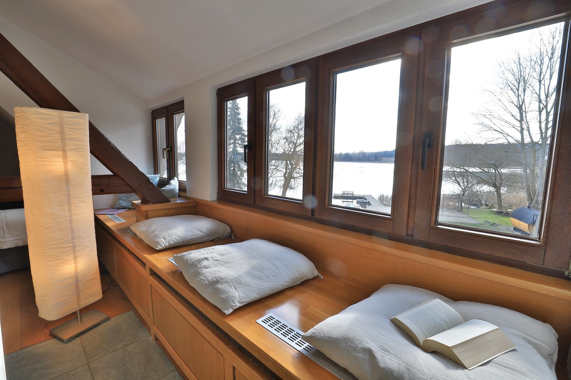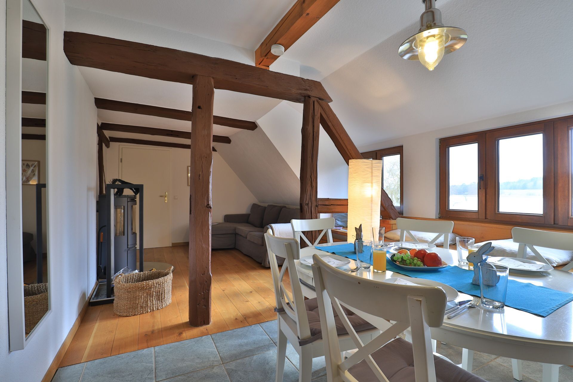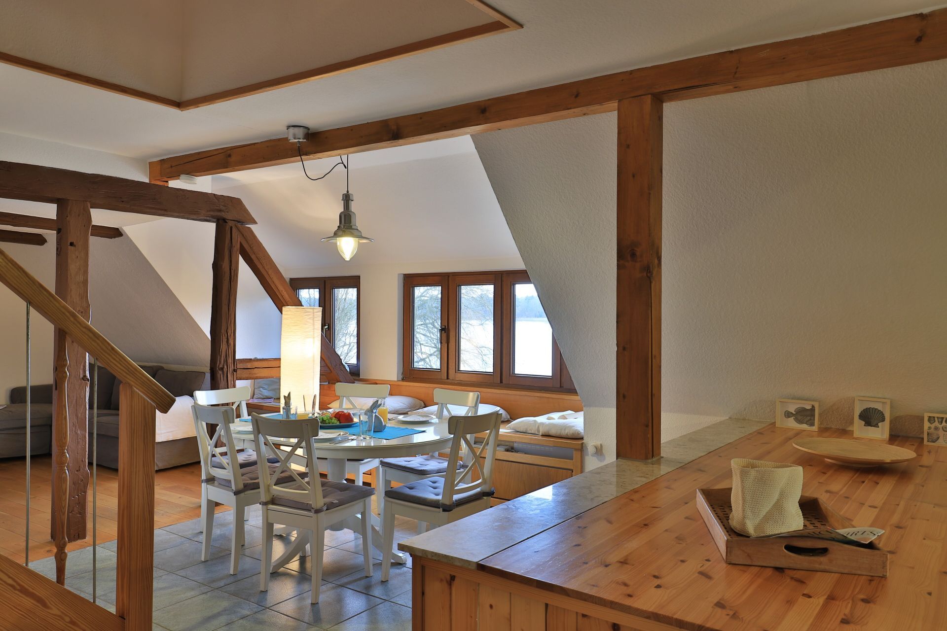 Erholung pur bietet die behagliche 3- Zimmer Ferienwohnung Sonnenaufgang, die sich als Maisonettenwohnung mit einer Wohnfläche von 74qm über zwei Ebenen erstreckt. Für bis zu 4 Personen bietet das attraktive Feriendomizil mit Seeblick beste Wohnqualität. Entspannte Stunden verbringen Sie im freundlichen Wohn-Essbereich mit Kaminofen, Sofa, Esstisch, 2. Sitzbereich zudem Fensterbank Sitzmöglichkeit mit Blick auf den See. Auch ein Fernseher und eine Musikanlage sind vorhanden. Des Weiteren bietet die voll ausgestattete, integrierte Küchenzeile alle technischen Voraussetzungen zur Zubereitung Ihrer Mahlzeiten. Herd, Backofen, Mikrowelle sowie Geschirrspüler, Kaffeemaschine, Wasserkocher und Toaster. Das großzügige Tageslichtbad empfängt Sie mit einer Dusche und einer Eckbadewanne zudem sorgt ein Handtuchheizkörper für wohlige Wärme. Über eine Treppe gelangen Sie in den Schlafbereich, wo sich ein separates Schlafzimmer mit Doppelbett und Kleiderschrank sowie ein Galerieschlafzimmer mit Doppelbett befinden. Die Nutzung von Waschmaschine und Wäschetrockner ist im Haus möglich. Für Ihren PKW ist ein kostenfreier Stellplatz vorhanden. Das große Gartengelände sowie der hauseigene Bade Steg steht allen Gästen zur Verfügung. Bitte beachten Sie, dass es sich hier um eine Nichtraucher Wohnung handelt, in der Haustiere nicht gestattet sind.