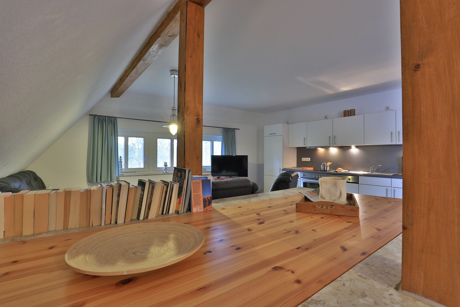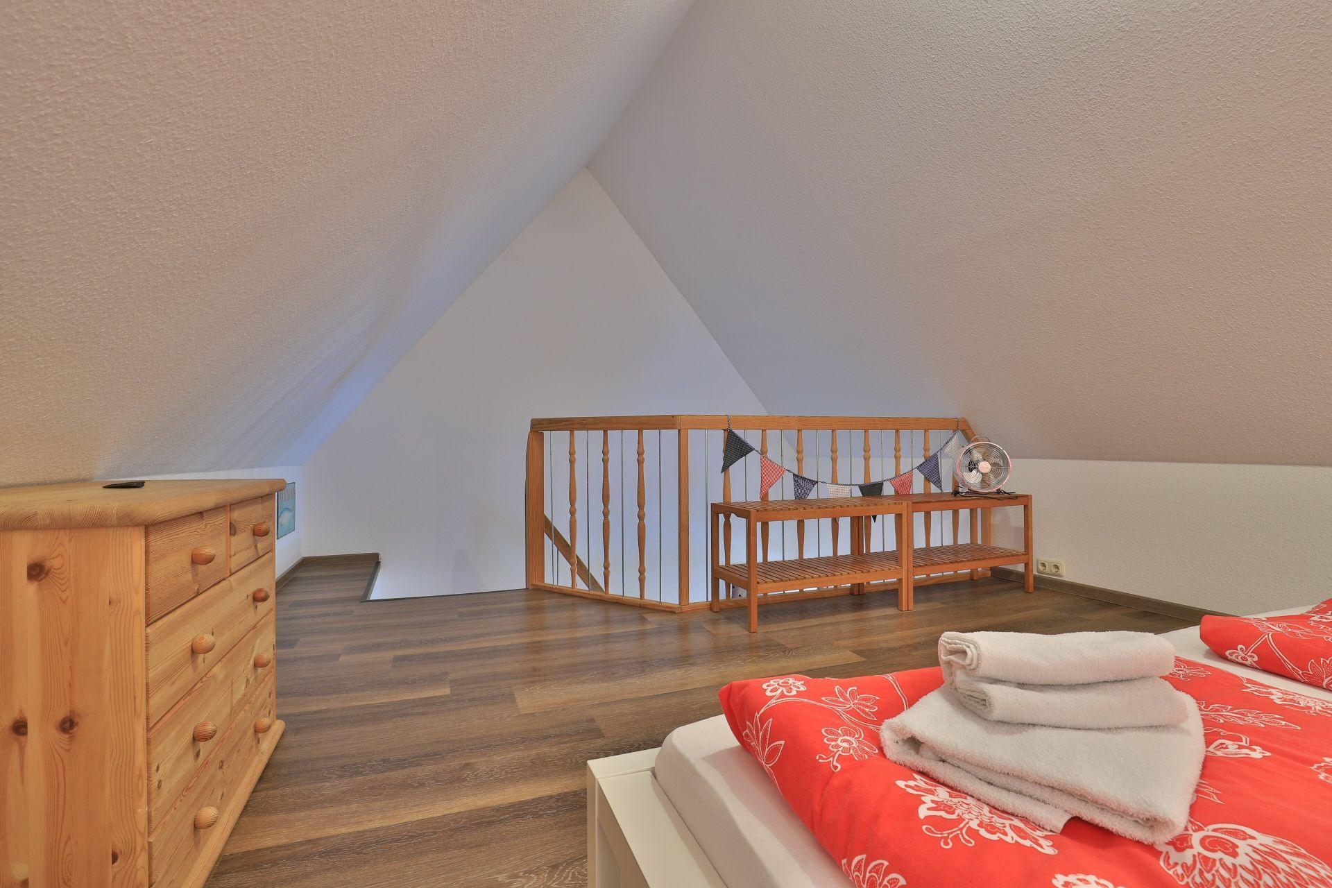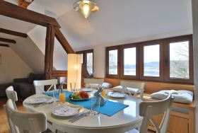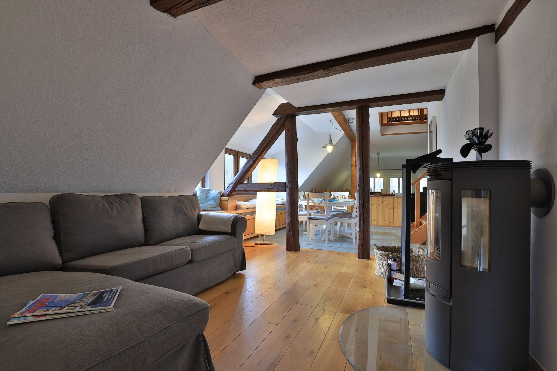 Erholung pur bietet die behagliche 3- Zimmer Ferienwohnung Sonnenaufgang, die sich als Maisonettenwohnung mit einer Wohnfläche von 74qm über zwei Ebenen erstreckt. Für bis zu 4 Personen bietet das attraktive Feriendomizil mit Seeblick beste Wohnqualität. Entspannte Stunden verbringen Sie im freundlichen Wohn-Essbereich mit Kaminofen, Sofa, Esstisch, 2. Sitzbereich zudem Fensterbank Sitzmöglichkeit mit Blick auf den See. Auch ein Fernseher und eine Musikanlage sind vorhanden. Des Weiteren bietet die voll ausgestattete, integrierte Küchenzeile alle technischen Voraussetzungen zur Zubereitung Ihrer Mahlzeiten. Herd, Backofen, Mikrowelle sowie Geschirrspüler, Kaffeemaschine, Wasserkocher und Toaster. Das großzügige Tageslichtbad empfängt Sie mit einer Dusche und einer Eckbadewanne zudem sorgt ein Handtuchheizkörper für wohlige Wärme. Über eine Treppe gelangen Sie in den Schlafbereich, wo sich ein separates Schlafzimmer mit Doppelbett und Kleiderschrank sowie ein Galerieschlafzimmer mit Doppelbett befinden. Die Nutzung von Waschmaschine und Wäschetrockner ist im Haus möglich. Für Ihren PKW ist ein kostenfreier Stellplatz vorhanden. Das große Gartengelände sowie der hauseigene Bade Steg steht allen Gästen zur Verfügung. Bitte beachten Sie, dass es sich hier um eine Nichtraucher Wohnung handelt, in der Haustiere nicht gestattet sind.