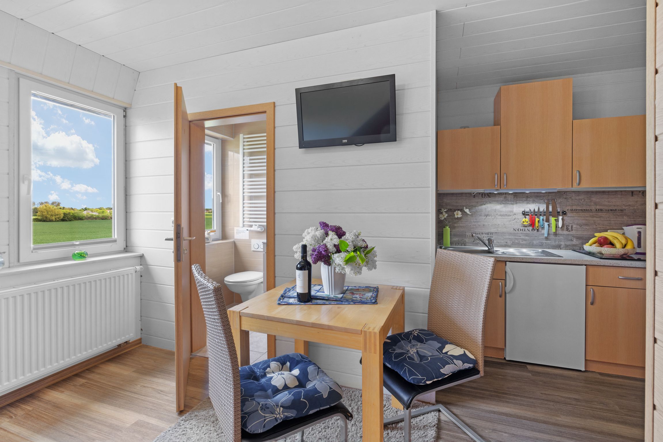 Helle und freundliche 1- Zimmer Ferienwohnung mit Doppelbett, Kleiderschrank, TV und Esstisch. Küchenzeile mit 2- Plattenherd, Kühlschrank, Kaffeemaschine, Wasserkocher und Toaster. Bad mit Dusche und WC. Aus den Fenstern der kleinen Ferienwohnung lässt sich ein herrlicher Ostseeblick genießen.