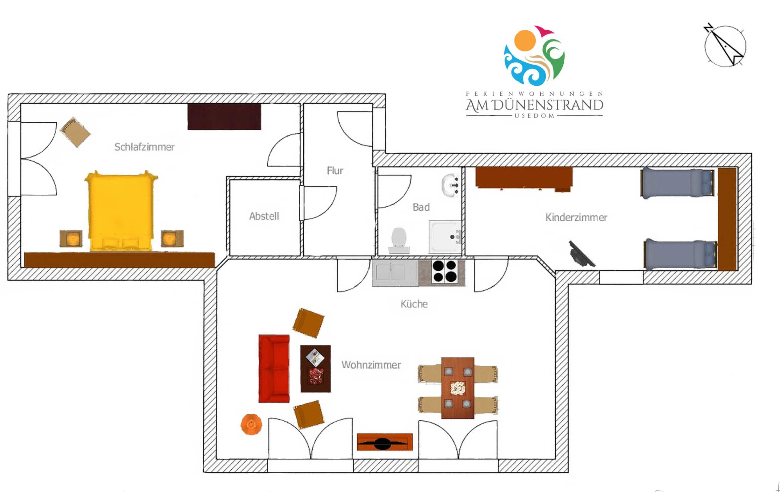 Der helle Wohnraum verfügt über eine offene und voll ausgestattete Küche sowie einen Esstisch für 4 Personen. Des Weiteren befindet sich dort eine gemütliche Sitzecke mit TV. Die Wohnung ist ideal für Familien mit 2 Erwachsenen und 2 Kindern. Für den erholsamen Schlaf gibt es im lichtdurchfluteten Schlafzimmer ein Doppelbett. Das zweite Schlafzimmer mit 2 Einzelbetten ist für Kinder besonders gut geeignet.