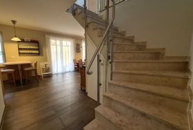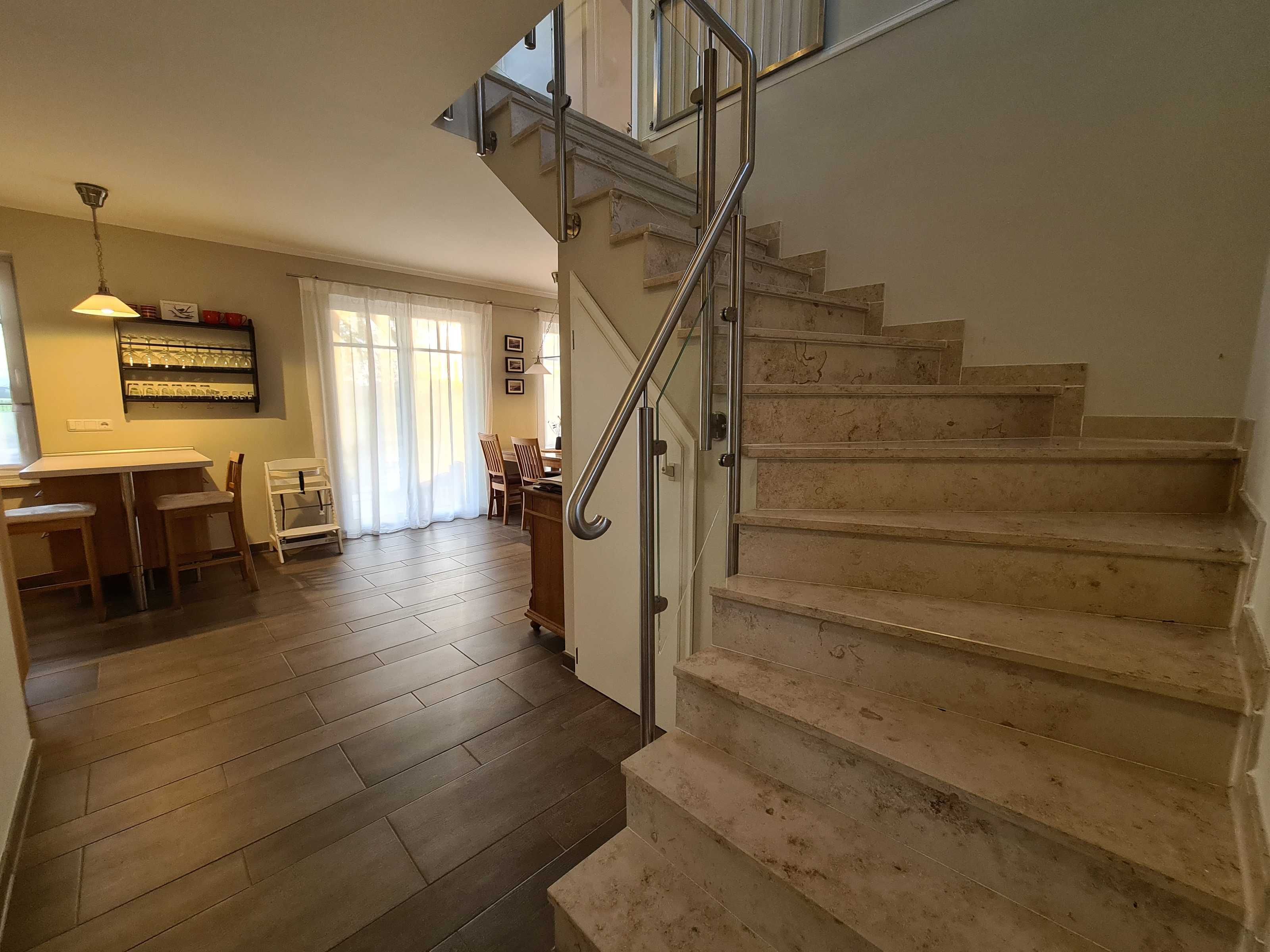 Erdgeschoss: Wohnraum mit Kamin, Esstisch und offener Küche sowie Terrassenzugang. Duschbad, Waschmaschine. Fußbodenheizung.