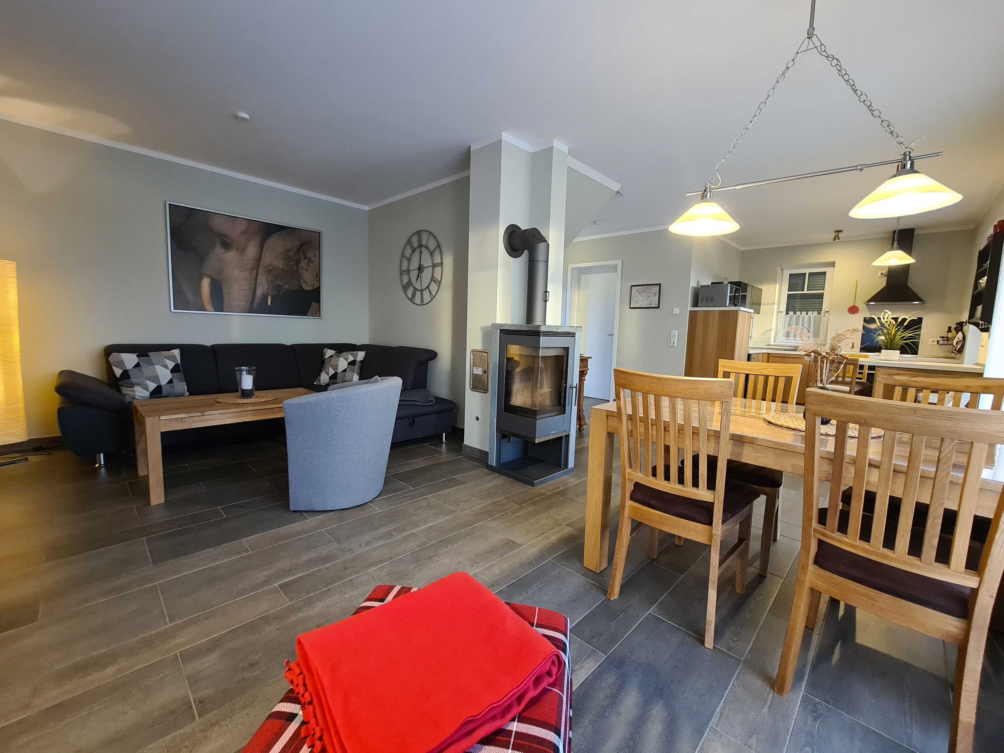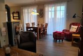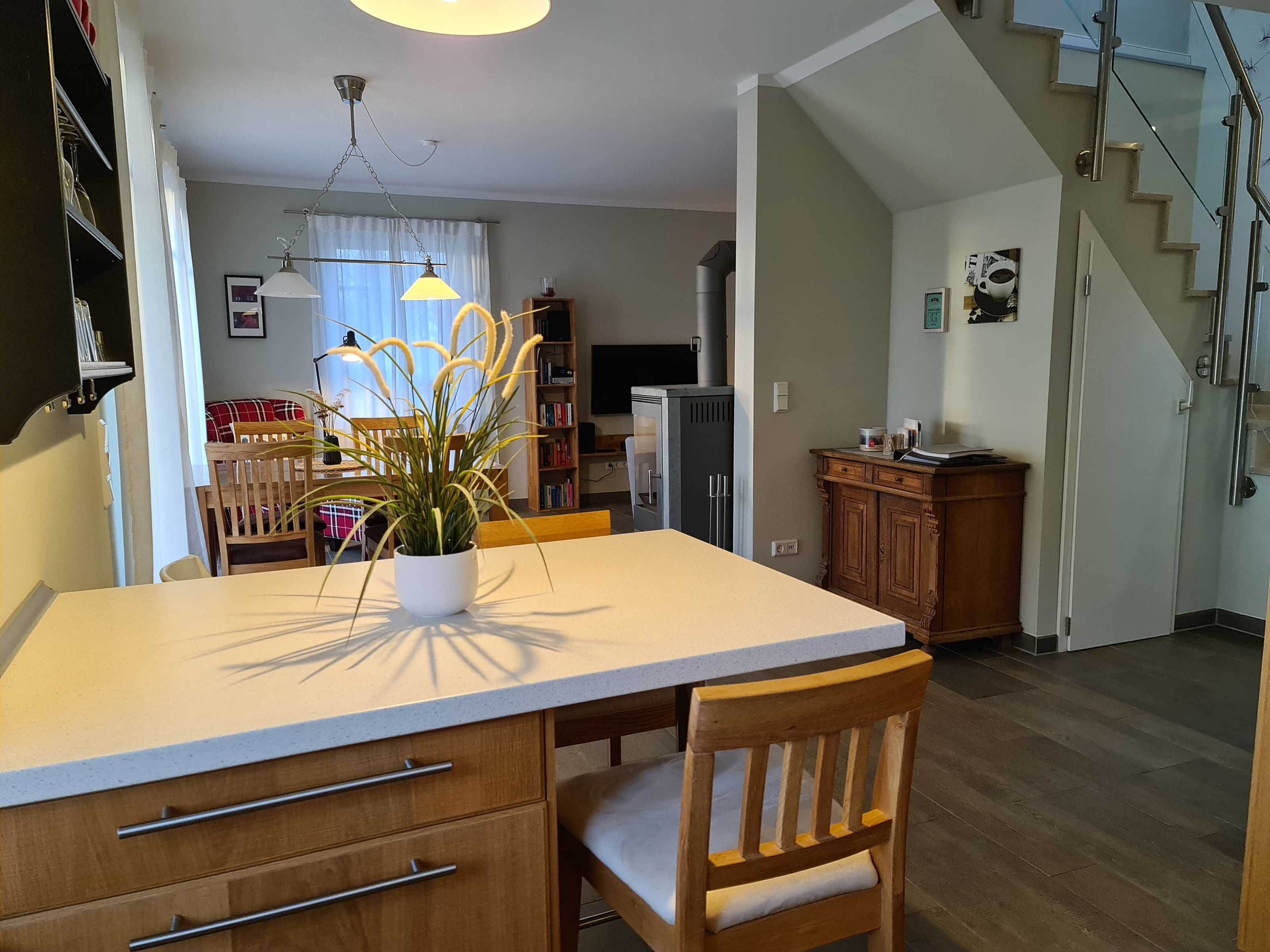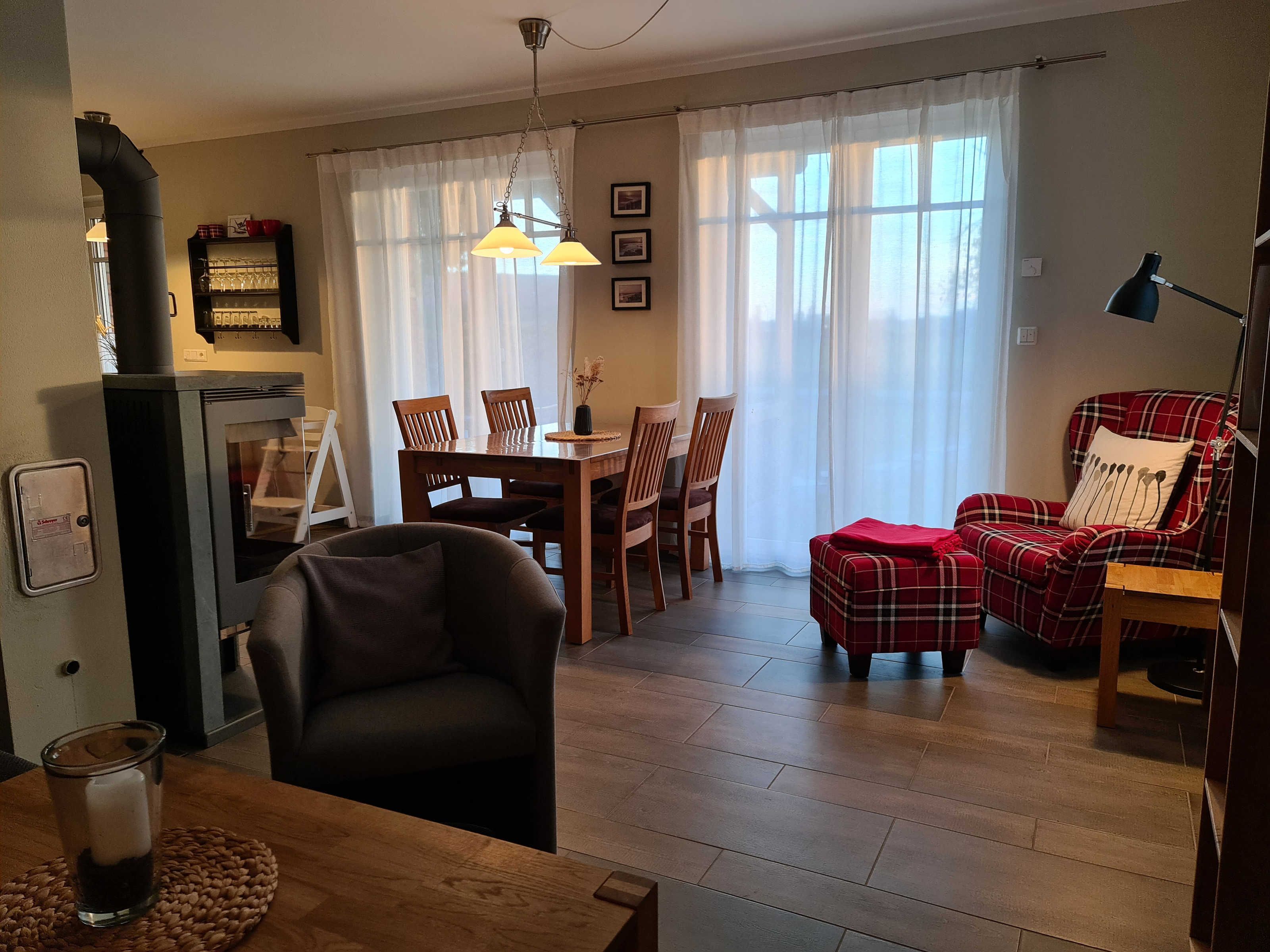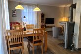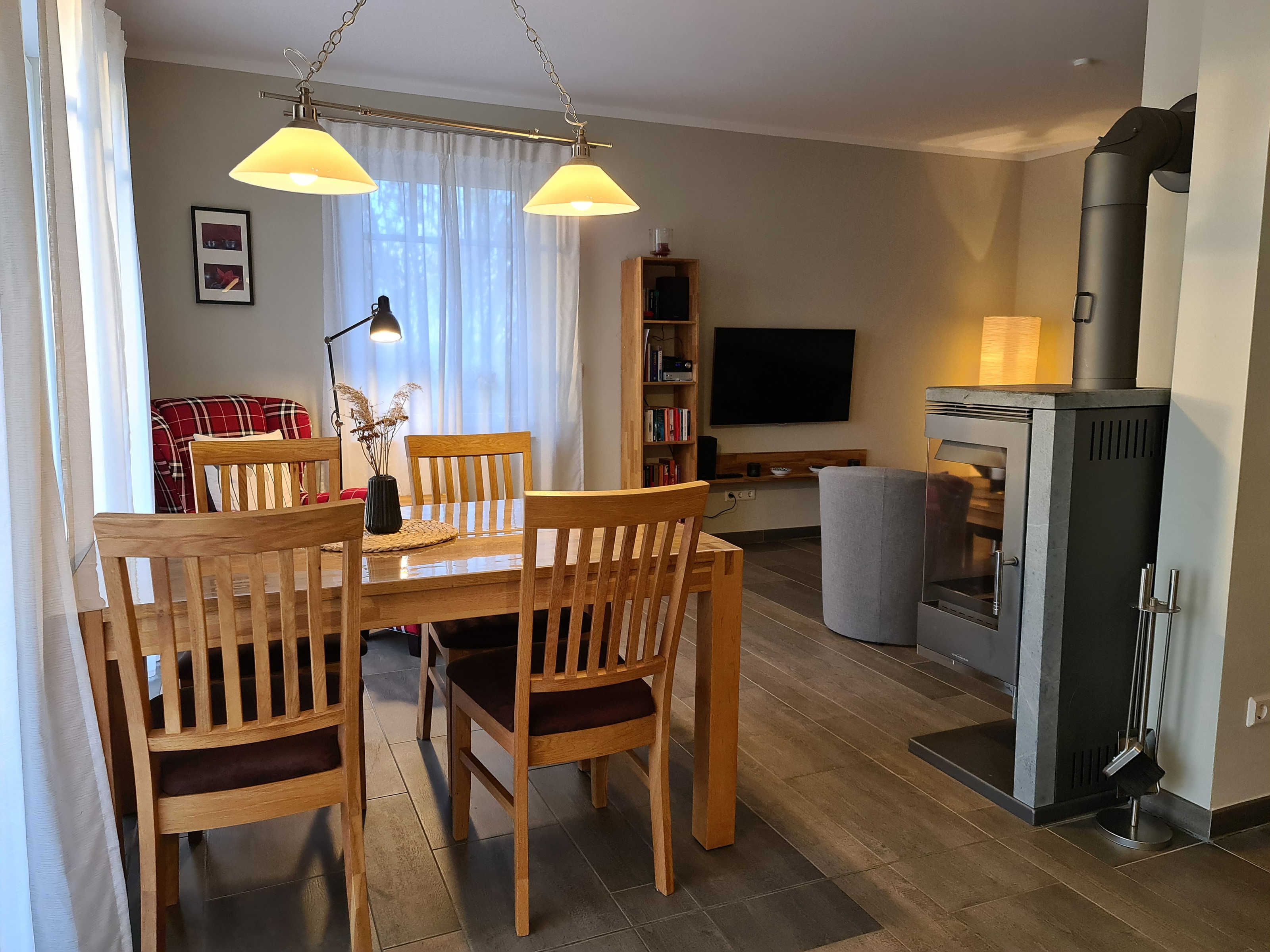 Wohnraum mit Kamin, Esstisch, offene Küche (Mikrowelle, Geschirrspüler, 4-Platten-Herd, Backofen) sowie Terrassenzugang. Ebenfalls im EG befindet sich ein Duschbad/ WC und Waschmaschine (kostenlos). Im Wohnbereich ist die Couch als Schlafgelegenheit für 1 Person nutzbar.